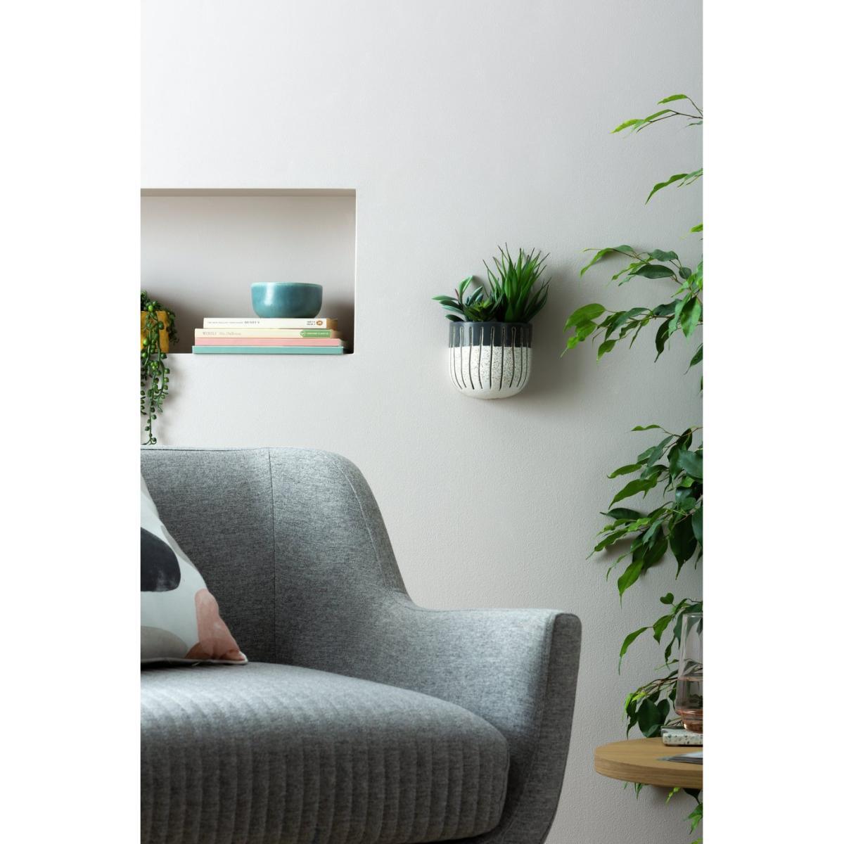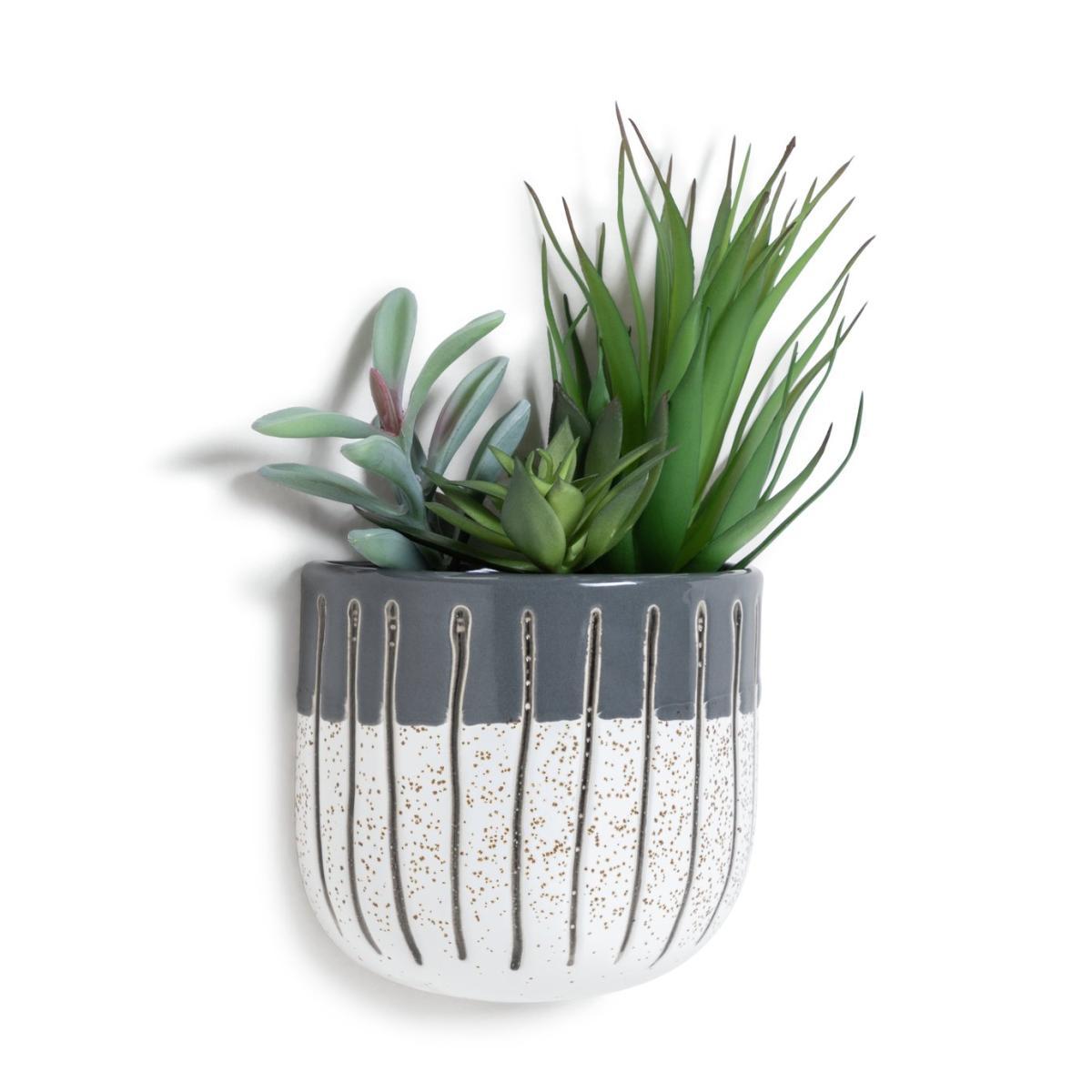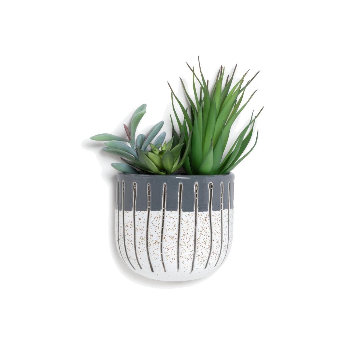 A lush, leafy wall display. Our pretty wall mounted artificial plant is cute, contemporary and totally fuss-free. This little trio of saucy succulents look just like the real deal. Sitting sweetly in a two-tone ceramic pot, we're digging its speckled design and quirky line details. A wonderful way to bring a pop of greenery to your space. Add one, or arrange a few. Go with the faux.