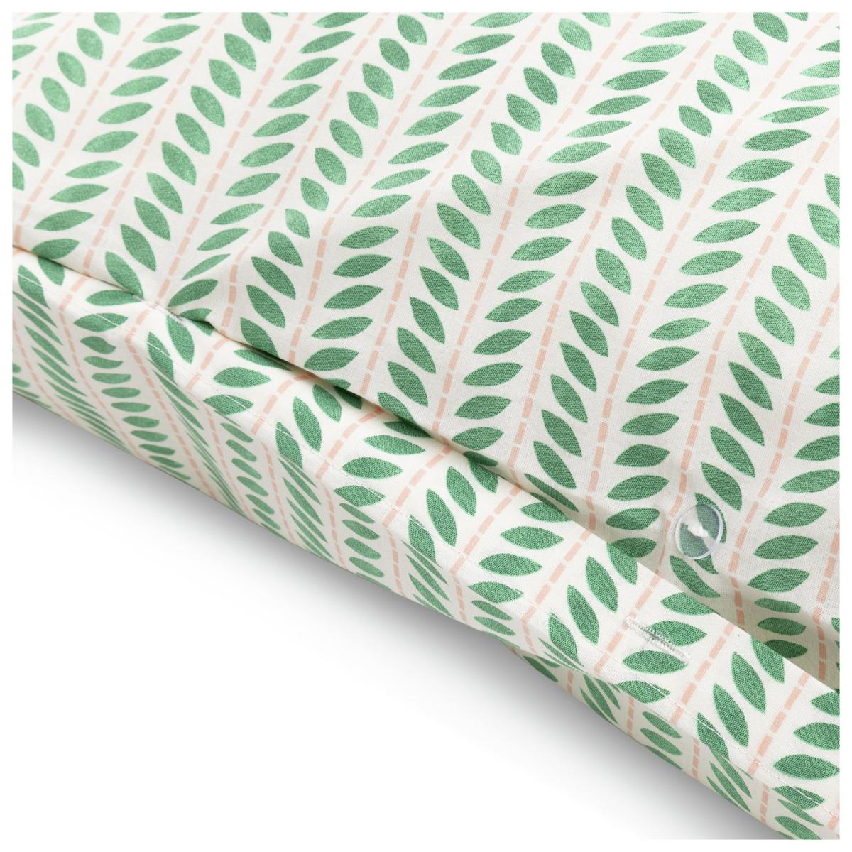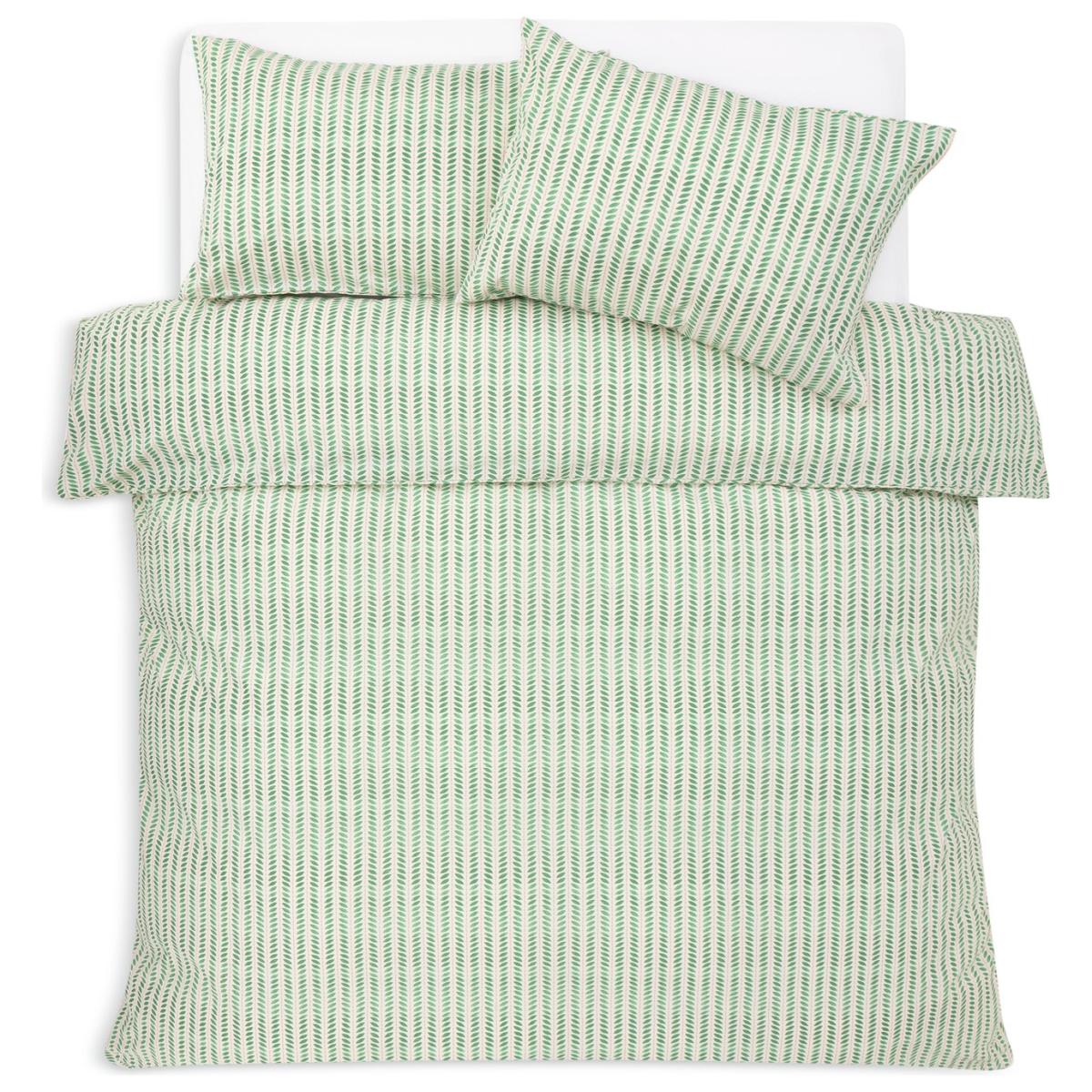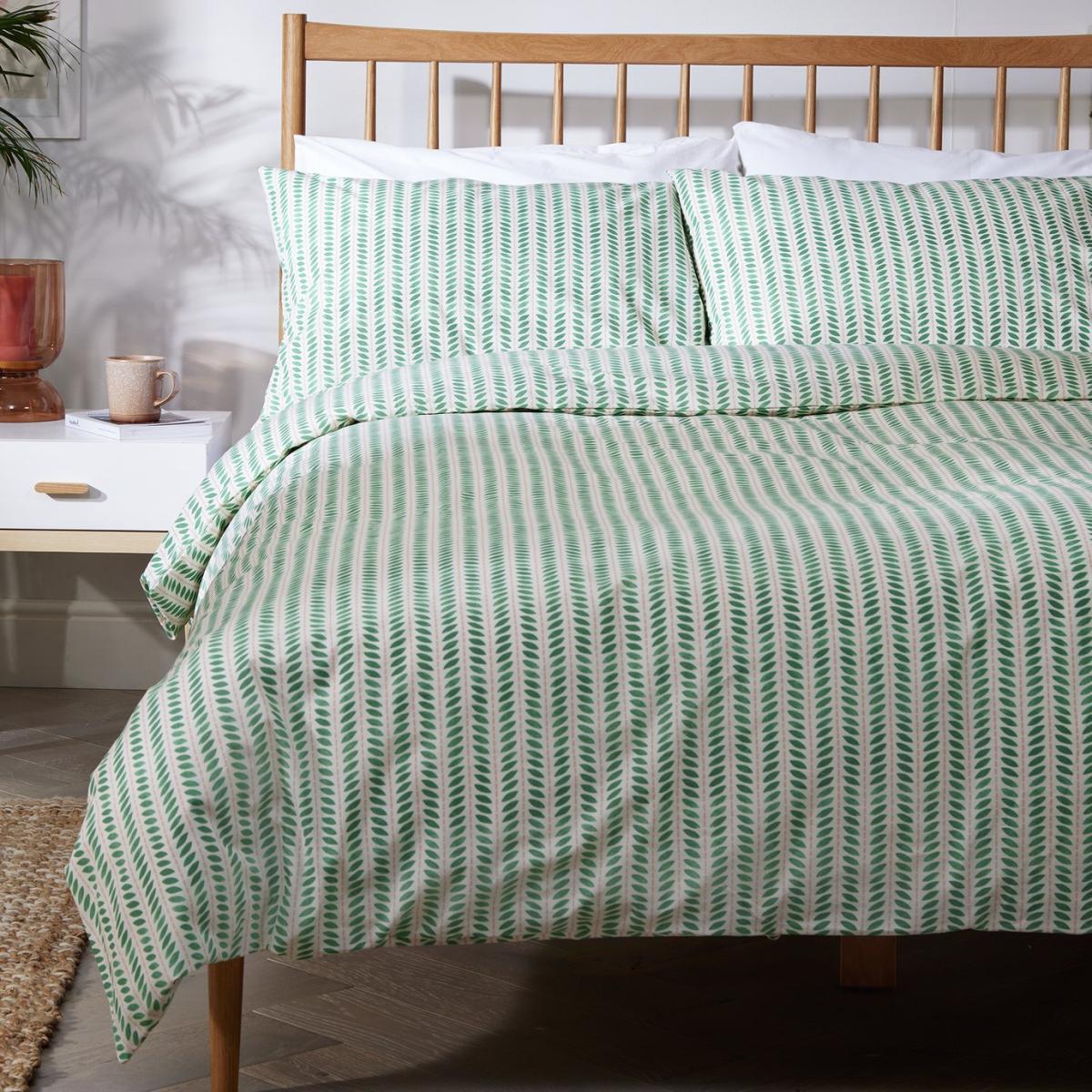 Snuggle under a bed of leaves. In fresh green and white, our nature inspired duvet set features a repeat striped leaf pattern. A simple way to give your bedroom a covering of cool, contemporary chic. This item carries the STANDARD 100 by OEKO-TEX logo, which means you can be certain that every component has been tested for harmful substances and is therefore harmless to human health. Finish: woven. 52% recycled polyester , 48% cotton. 144 thread count. Set includes 1 duvet cover and 1 pillowcase. Bed size: single. Length 200cm, Width 135cm. Buttons for fastening. Standard pillowcase (s). Pillow case length 75cm, Width 50cm. Machine washable at 40 C. Suitable for tumble drying.