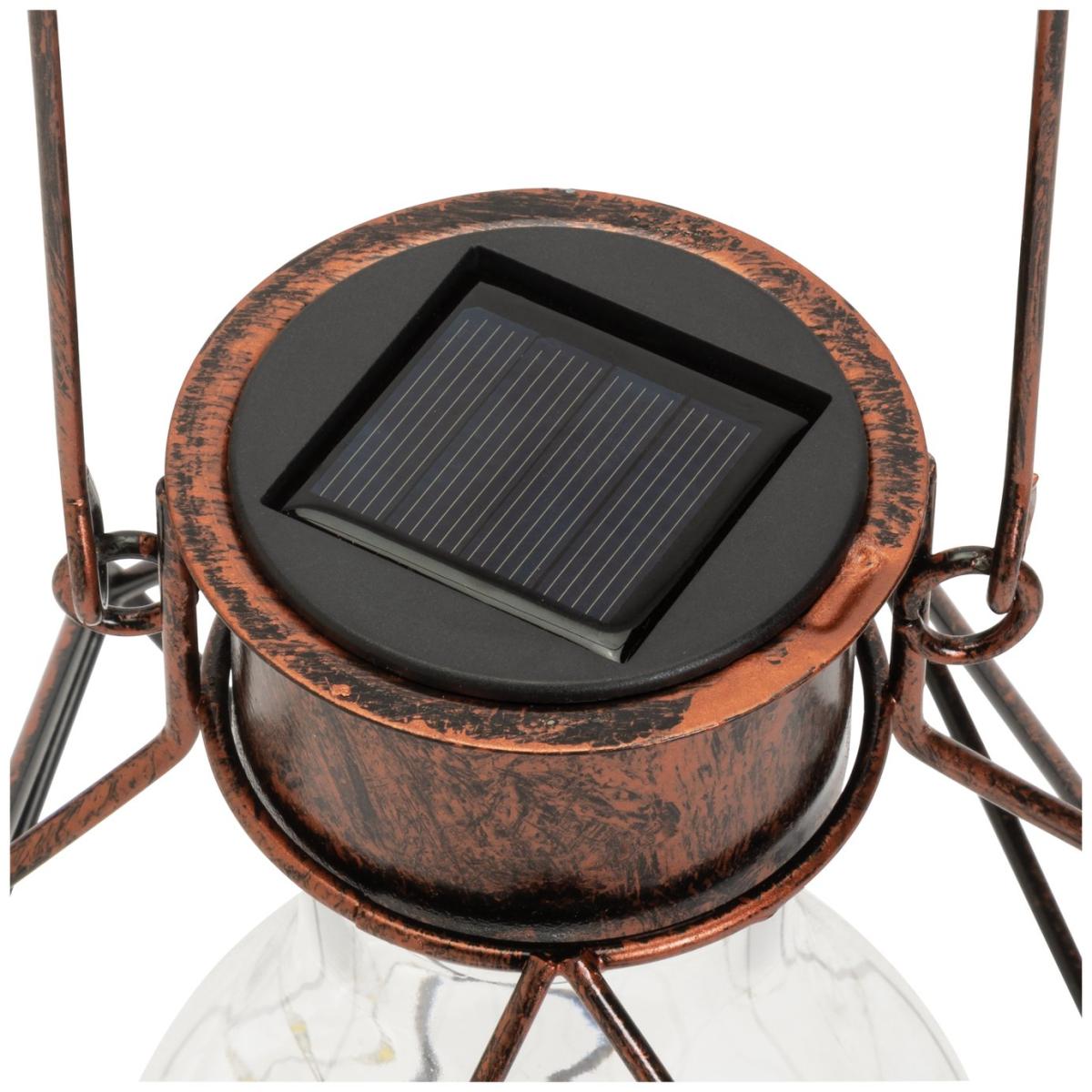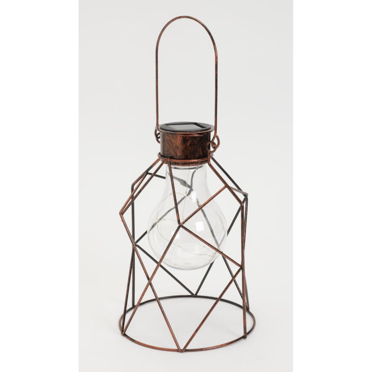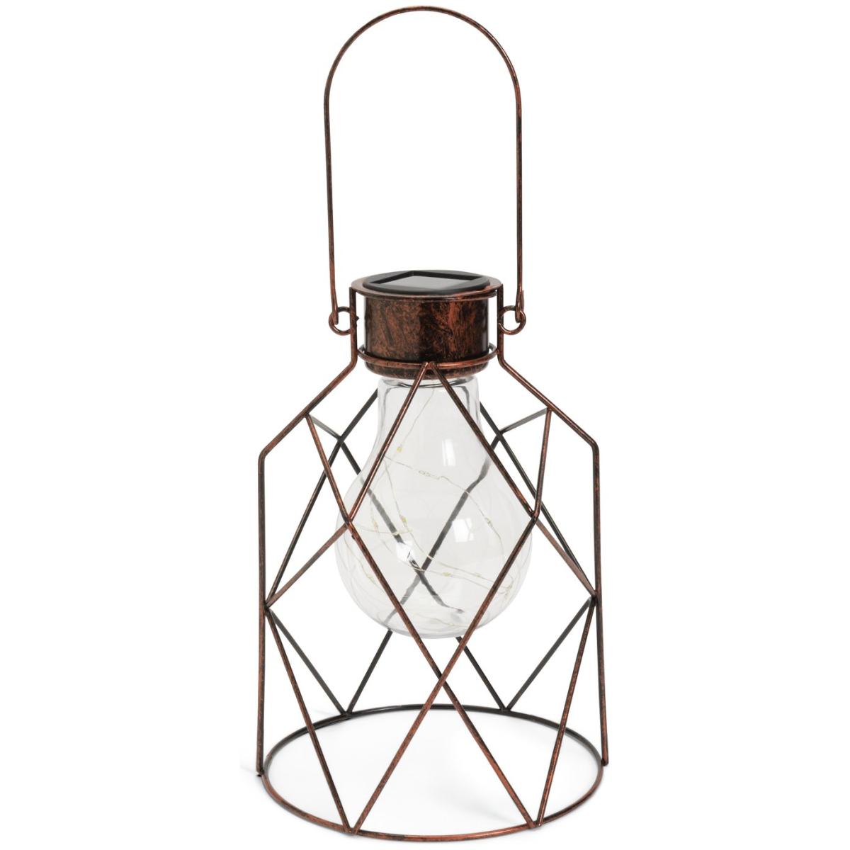 Give your garden a touch of industrial flair. This solar-powered light features a retro looking bulb in a bronzed metal cage shade. Hang in a tree, place on a table. Fully charged, it'll shine for up to 6 hours. Looking to bring more after dark ambience to your outside space? Browse our glowing collection of solar string lights. Solar powered. 1 lights included in the pack. Includes handle for hanging light. On and off switch. Automatically turns on at dusk. 6 hours run time if fully charged. 8 hours of full sun light required to fully charge battery. Battery is recharged via the solar panel. Requires 1 x rechargeable battery (included). LED bulbs (included). Size: H25.5cm, W17.5cm, D17.5cm. Warm white light emitted. Suitable for outdoor use only. 1 year manufacturer's guarantee.