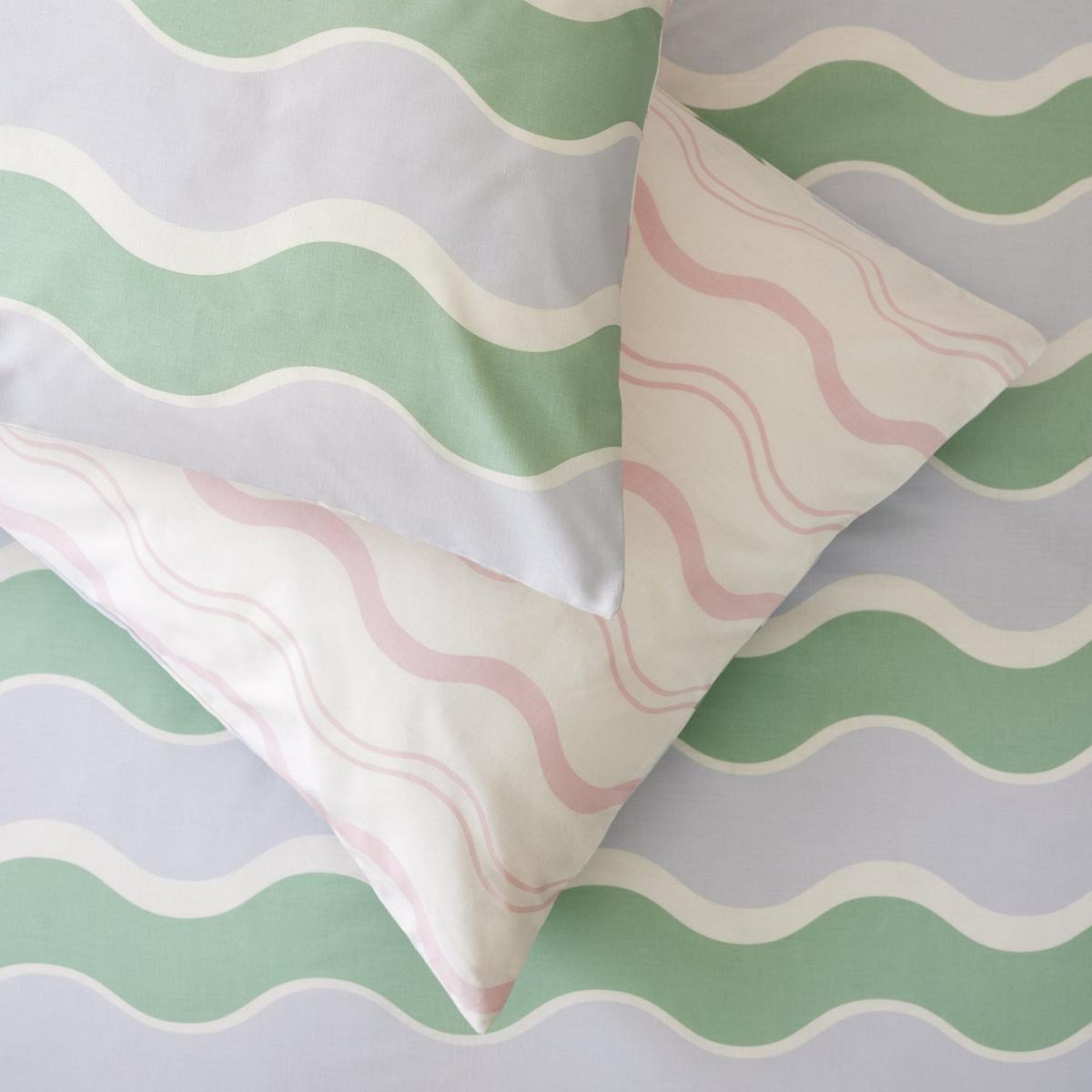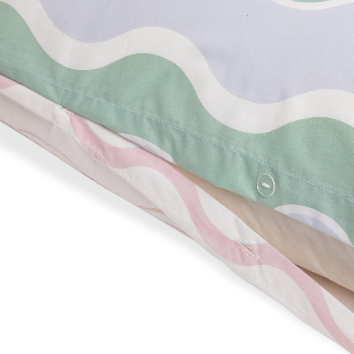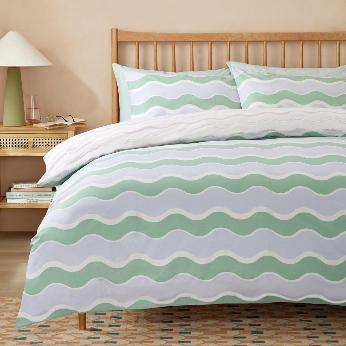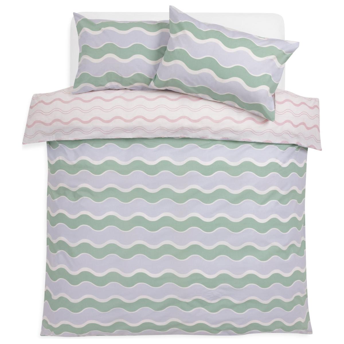 Make waves with this modern bedding set. The curvy contemporary pattern is an easy way to add a pop of personality to a room. And it's reversible. So you get 2 cool looks in one. This item carries the STANDARD 100 by OEKO-TEX logo, which means you can be certain that every component has been tested for harmful substances and is therefore harmless to human health. 52% polyester , 48% cotton. 144 thread count. Set includes 1 duvet cover and 2 pillowcases. Bed size: king size. Length 220cm, Width 230cm. Reversible. Buttons for fastening. Standard pillowcase (s). Pillow case length 75cm, Width 50cm. Reversible pillowcase (s). Wash before use. Suitable for tumble drying.