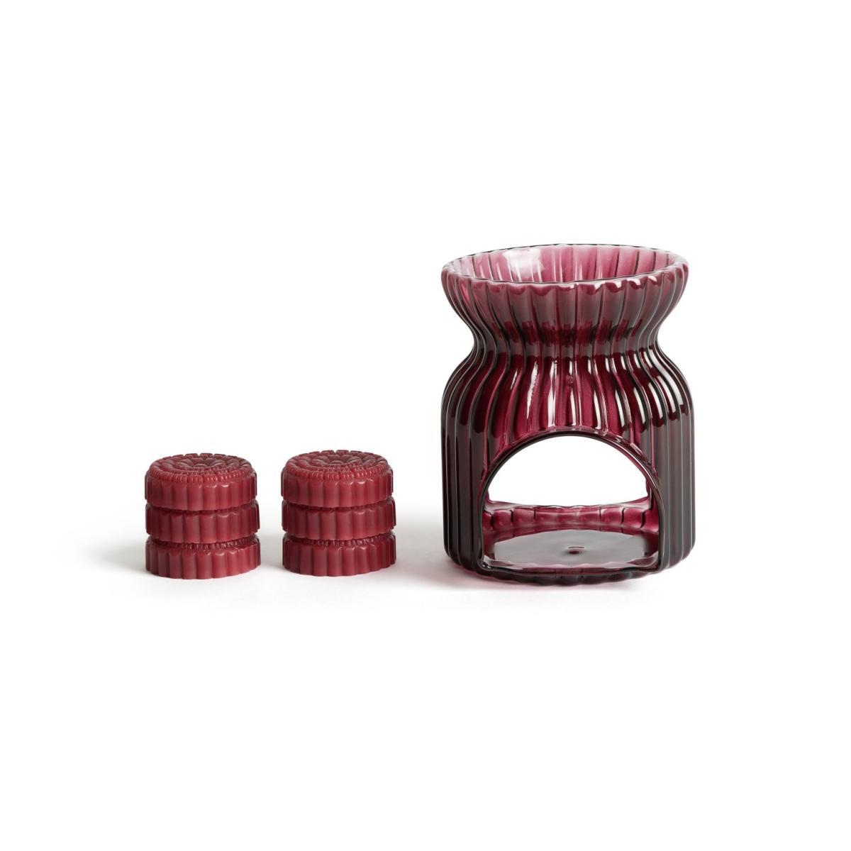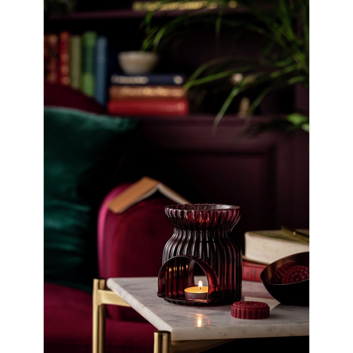 Calm and cosiness guaranteed. Create instant atmosphere with this on-trend fragrant burner. Crafted from glass with decorative grooved detail, it comes in a rich ruby red shade. Pop your wax melt on top and a tealight underneath, the heat released bursts of Christmas spice. Fresh festive fragrance and elegant design. Now there's a winning combination.