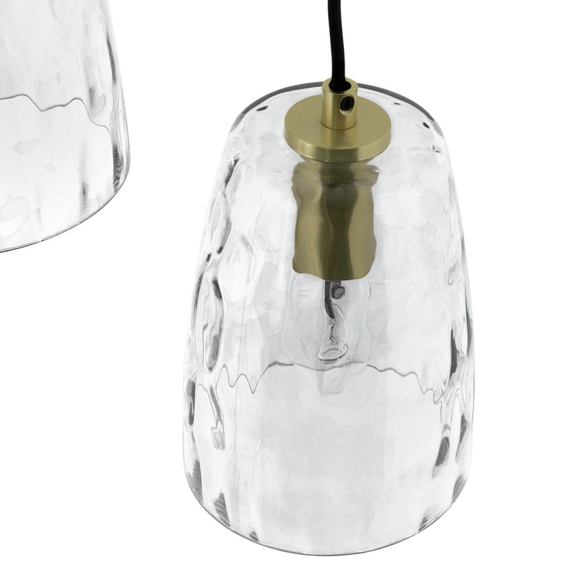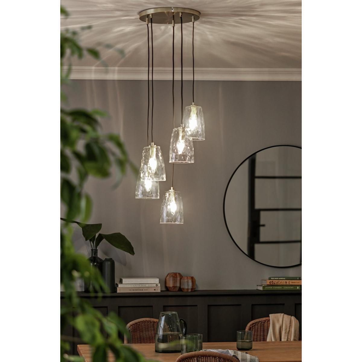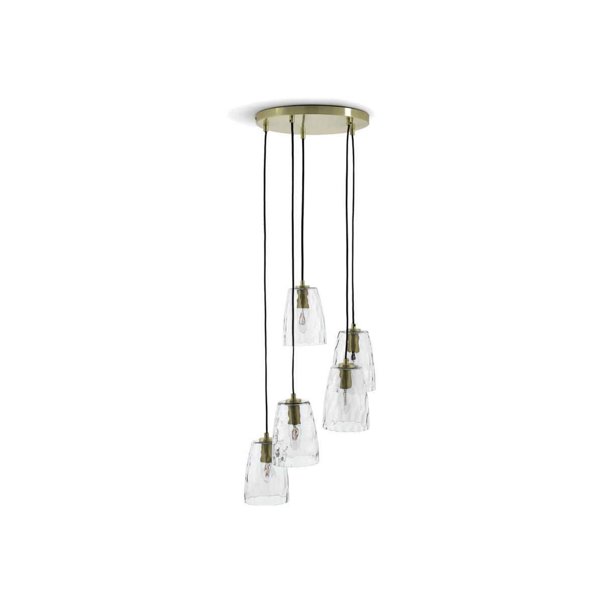 Go big, bold, and bright. Our modern pendant in glass and brass gives your ceiling a dash of drama. With 5 textured glass cones on various levels, this contemporary chandelier makes an elegant statement in your lounge or kitchen. Brushed brass detailing adds a vintage twist. What a radiant display. Clear glass is a great excuse to show off Edison bulbs. Why not experiment with different shapes? Browse our collection and get creative. Setting the mood? Lighten up with our table and floor lamps, wall lights and pendants. Dimensions: Size H120, W30, D30cm. Diameter 30cm. Bulb Information: Bulb required: 5 x candle E14 small edison screw LED (not included). Recommended maximum wattage: 7 watts. General Information: Self-assembly. Product is hard-wired into electrics. Manufacturer's 1 year guarantee.