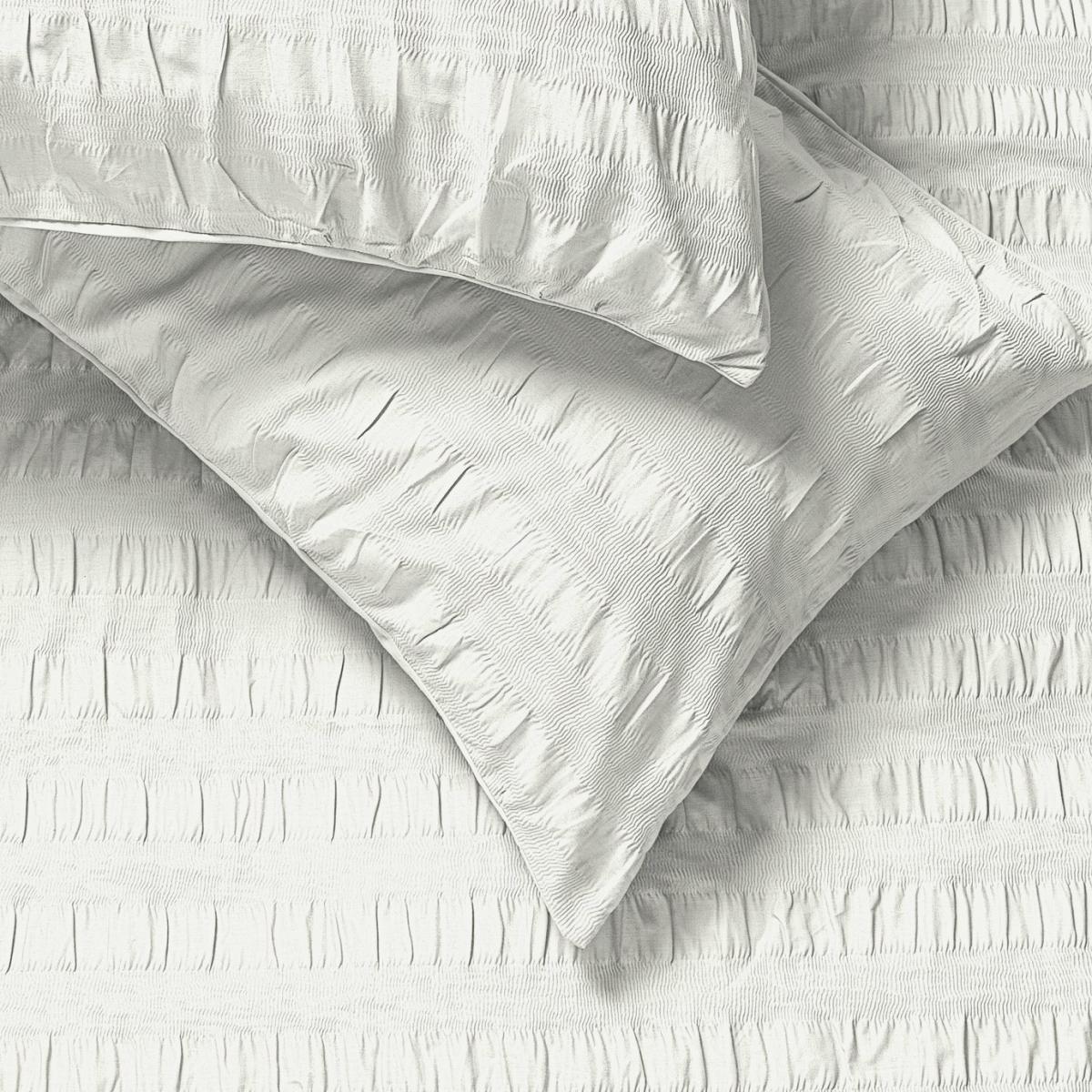 Light as a cloud. Our bright white seersucker duvet set is crisp, comfortable and cool. Decoratively stitched into puffed panels one side, with a soft smooth underside. It's dreamy, airy and perfect to bring a calm, fresh summer vibe home. This item carries the STANDARD 100 by OEKO-TEX logo, which means you can be certain that every component has been tested for harmful substances and is therefore harmless to human health. Finish: seersucker. 48% cotton , 52% recycled polyester. 144 thread count. Set includes 1 duvet cover and 2 pillowcases. Bed size: super king. Length 220cm, Width 260cm. Buttons for fastening. Standard pillowcase (s). Pillow case length 75cm, Width 50cm. Machine washable at 40 C. Suitable for tumble drying.