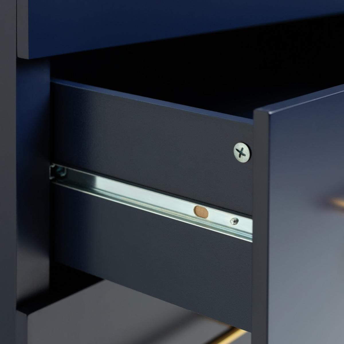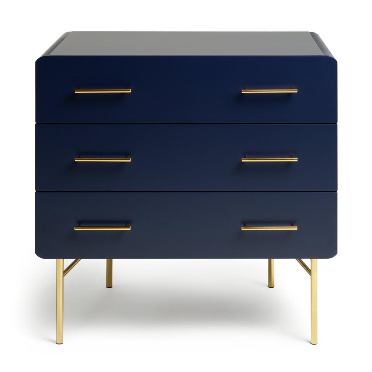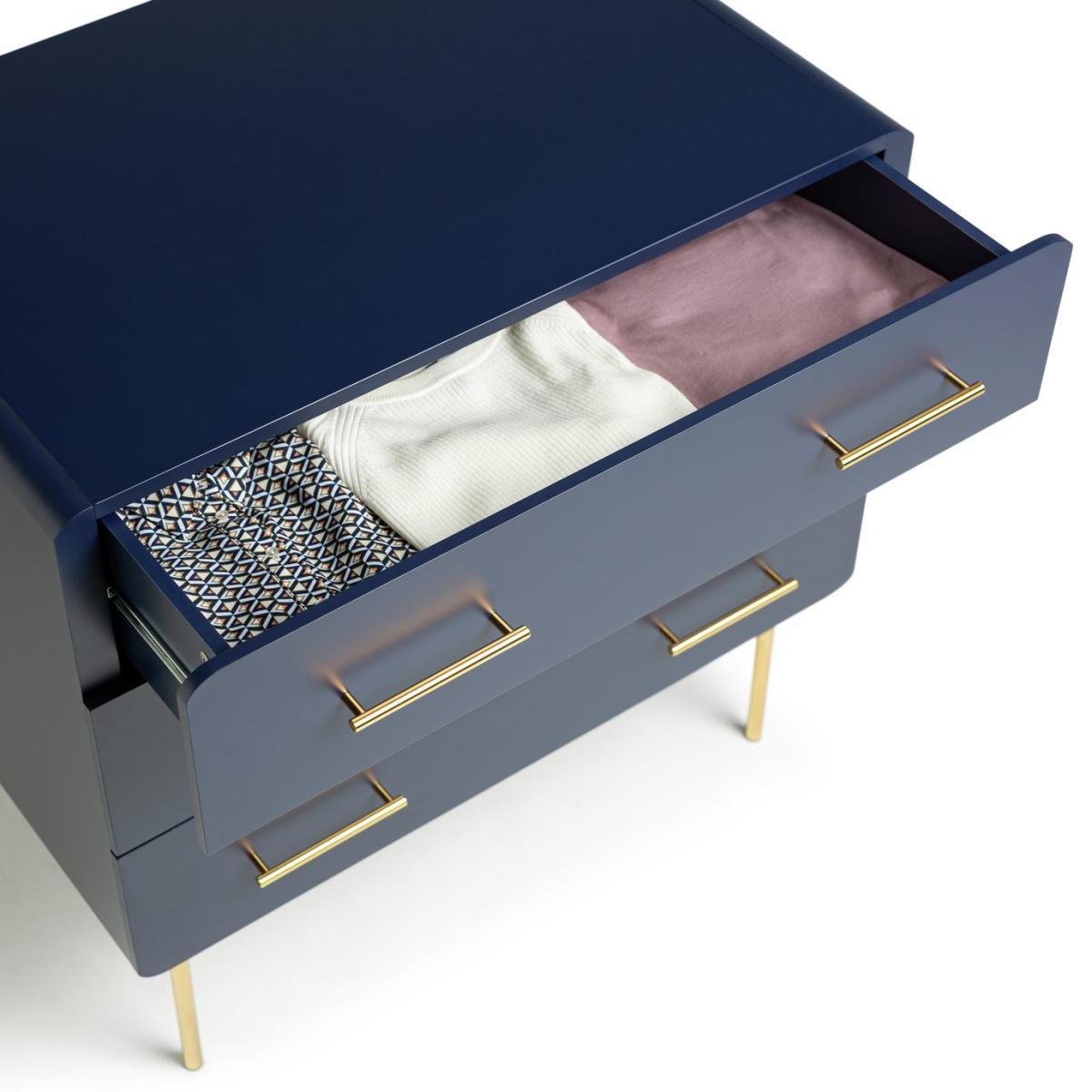 Gold and blue. So rich, so you. This elegant chest of drawers is classically stylish. We're loving how the slim gold plated steel handles and legs contrast with the Midnight blue finish. There's plenty of storage space. The six drawers open smoothly on metal runners. With room to keep jars, creams and other bedroom bits. A place for T-shirts, jumpers, and keeping socks and underwear nice and tidy. And room on top for a luscious lamp to add to the opulent mood.