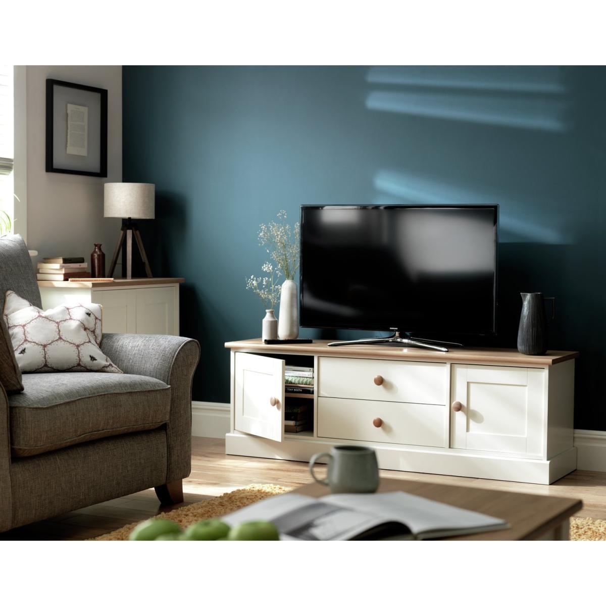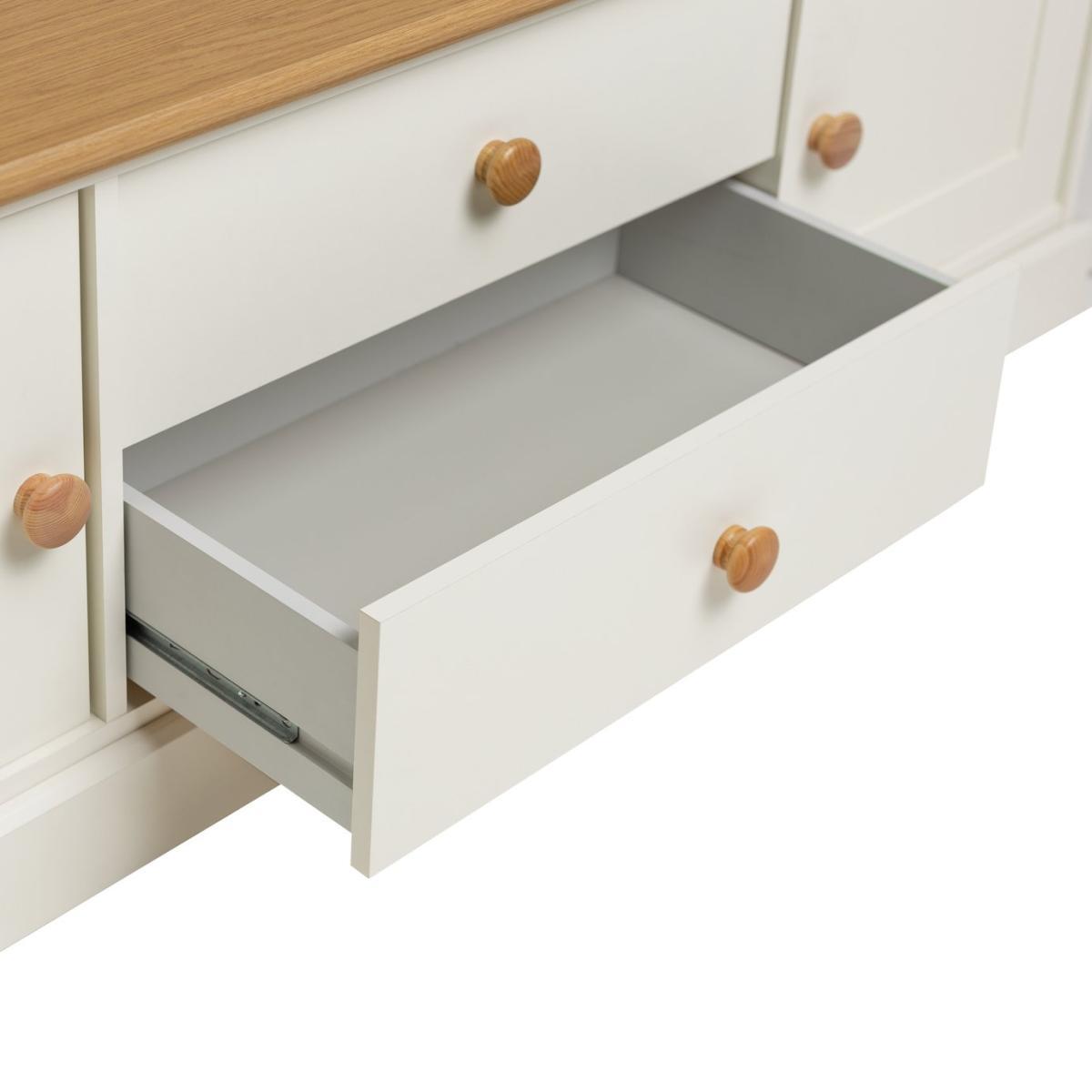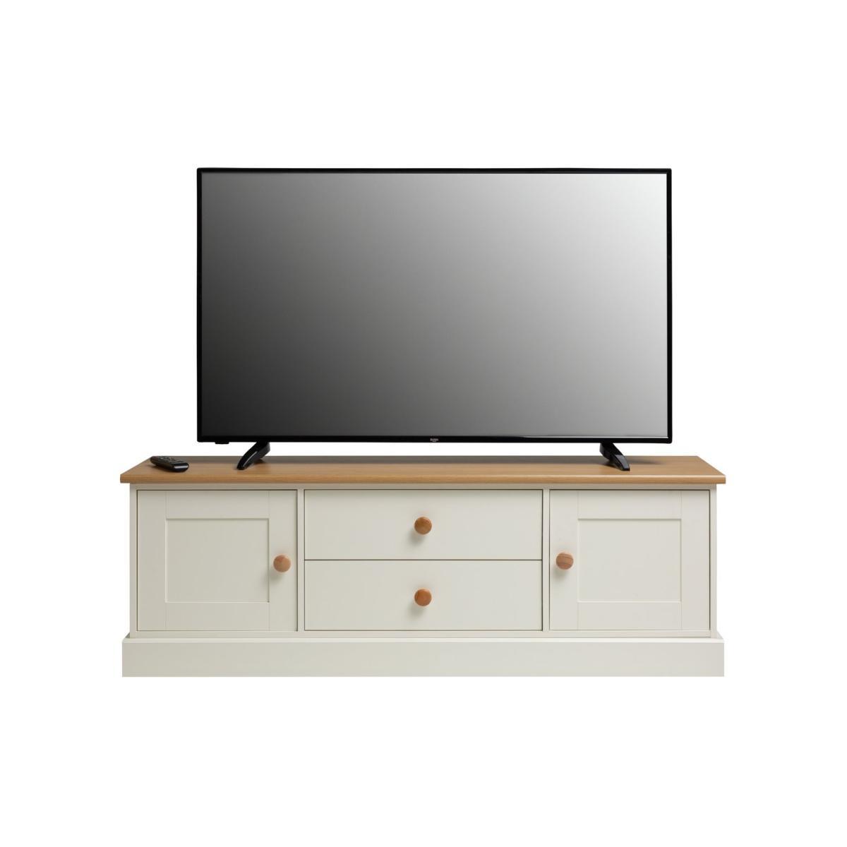 I love this media unit’s clean, versatile look that works well in both modern and country-style interiors. Its white finish and natural wooden top create a fresh, timeless aesthetic, making it easy to incorporate into spaces with neutral palettes or layered textures. It's practical too - the combination of two doors and drawers offers plenty of storage for media equipment, accessories, or even bits and bobs that need tidying away. When styling, consider pairing it with light, tactile accessories or some potted greenery to add warmth and personality. To keep the look cohesive, opt for media devices that complement the natural wood or understated colour scheme, and avoid clutter for a streamlined, balanced feel.
