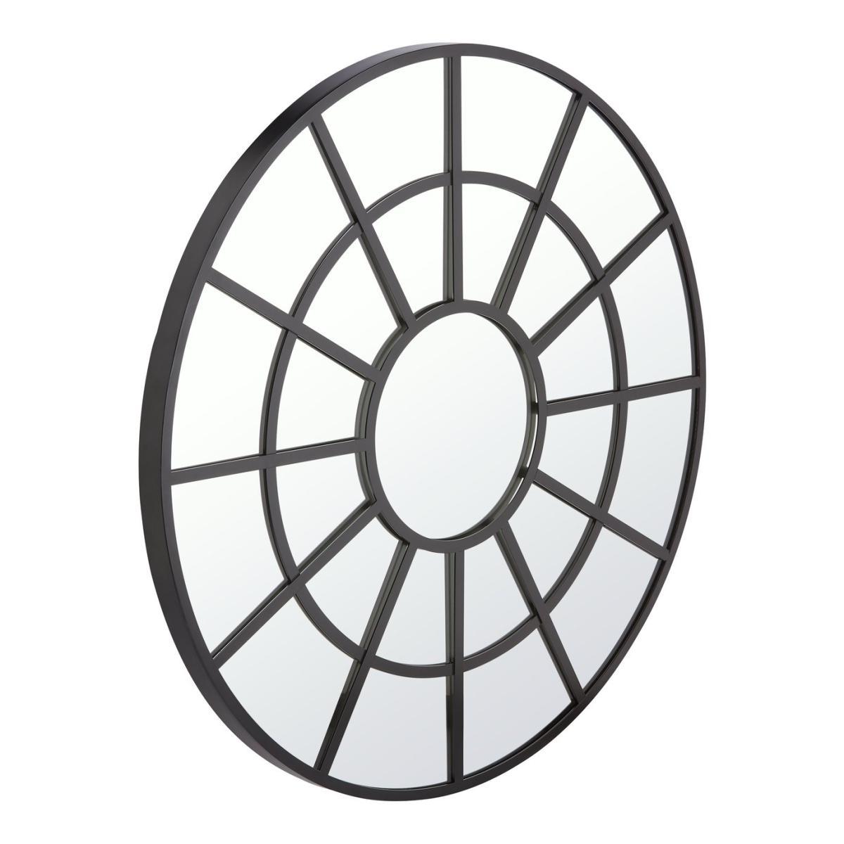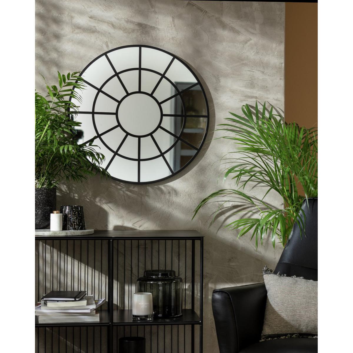 Sensational. Our round windowpane mirror is a slice of contemporary, loft-living style. The matte black metal overframe makes this circular porthole pattern pop. Hang it on a white wall alongside vibrant prints and a few tall plants for instant drama. A bold focal point for the lounge or bedroom, this statement mirror adds depth and space wherever it goes. Simply a stunner. Love the modern look? Stay on trend with more minimalist decor in our Industrial collection.