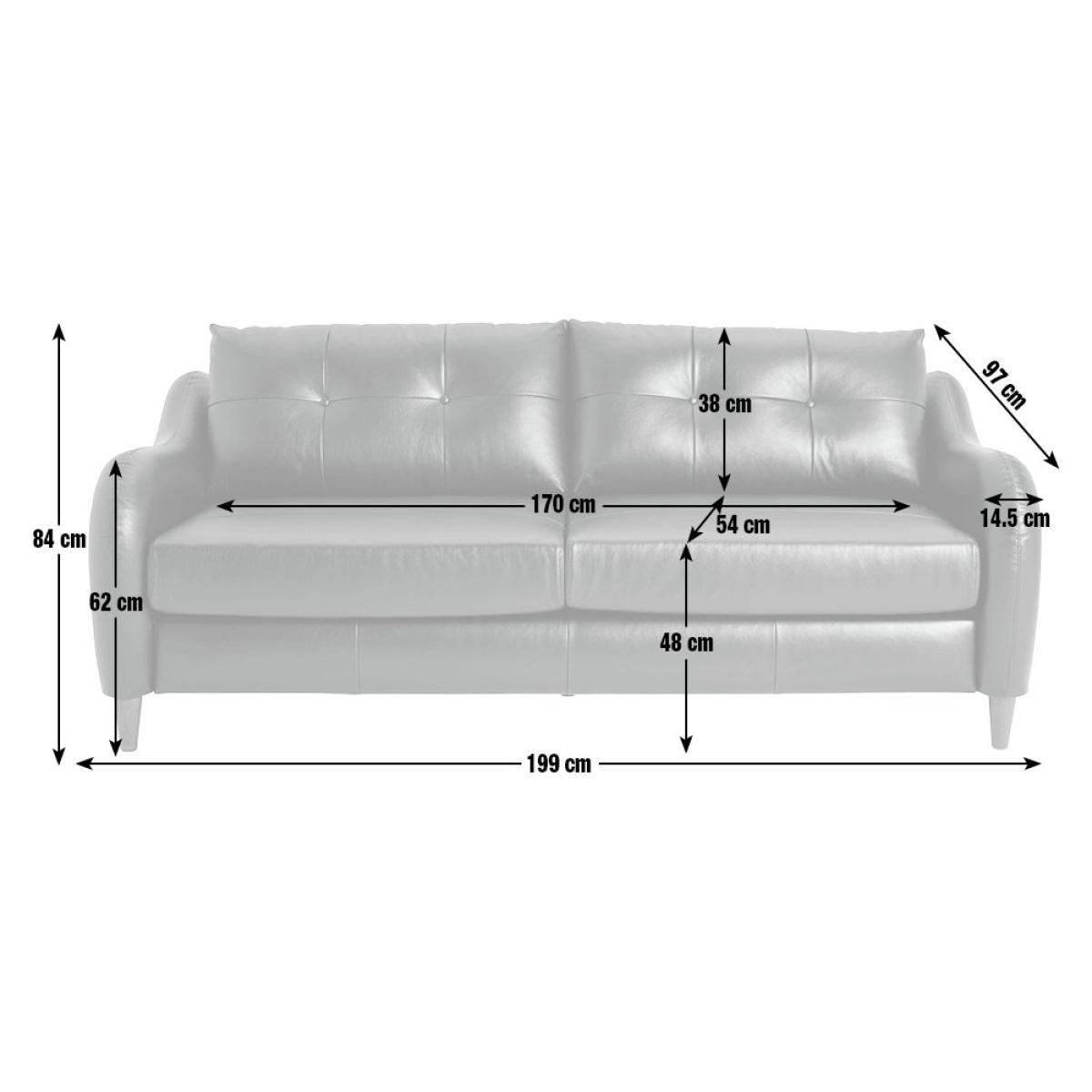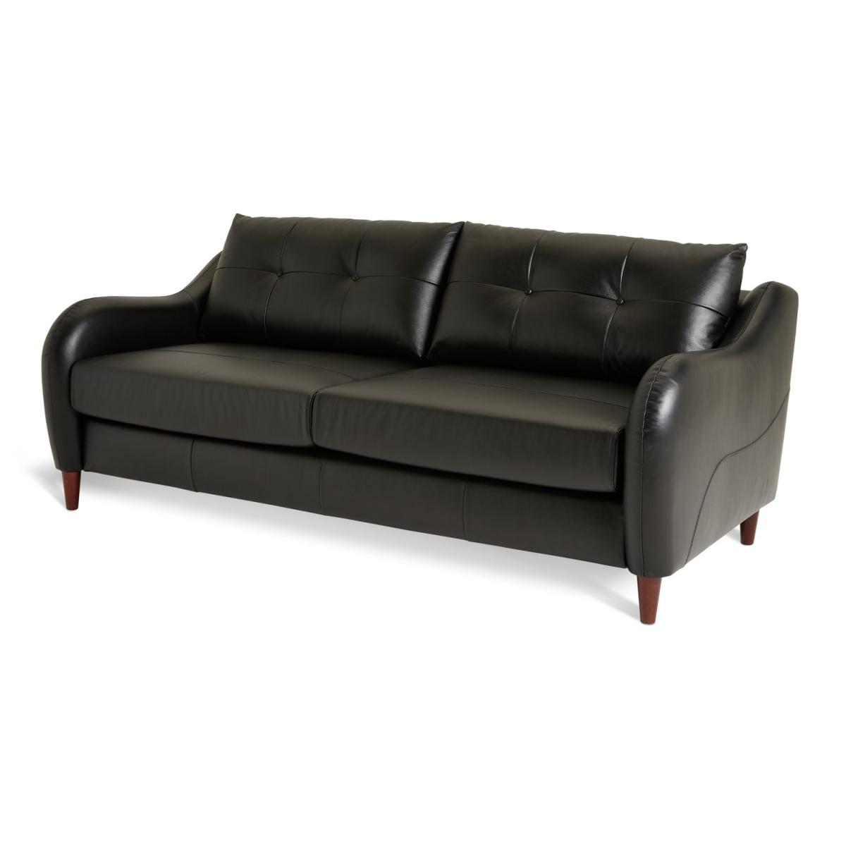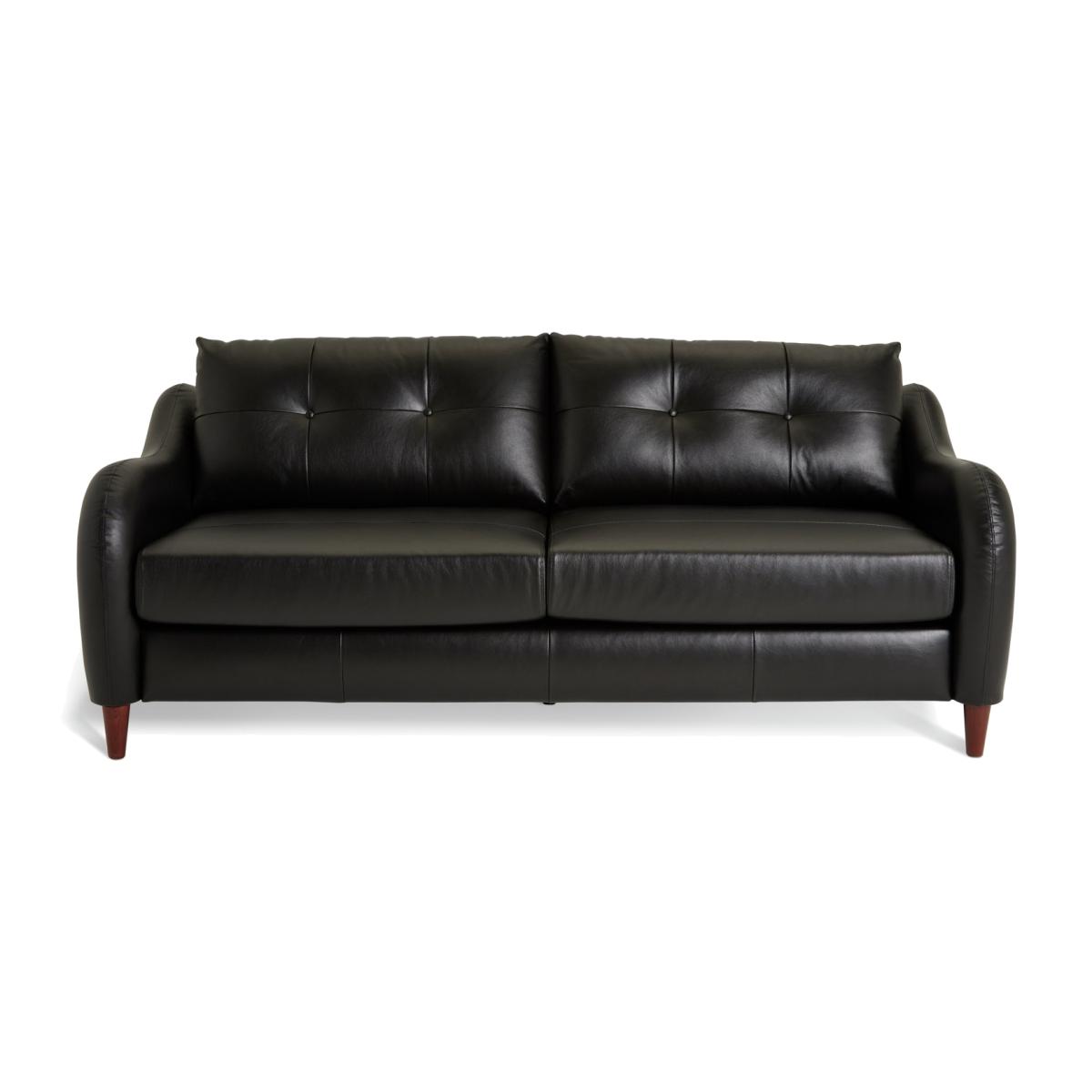 Get comfy with Winnie. Upholstered in pure top grain black leather, this 3-seater sofa with its curvaceous arms and buttoned detailing has timeless good looks. A joy to sit in too. Relax into the foam filled seats, nestle against plump, padded cushions and settle in for some luxe lounging. Part of the Winnie collection. Material: Top grain leather. Made from 100% leather. Wooden feet. Medium firm seat cushions. Removable seats with foam filling. Removable cushion(s) with fibre filling. Free fabric swatch available on this line. Dimensions: Size H84, W199, D97cm. Floor to seat height: 48cm. Depth of seat: 54cm. Height of seat back: 38cm. Width of seating area between arms: 170cm. Height of arm rest: 62cm. Weight 52kg. Professional clean only. Plump cushions regularly to maintain shape. Minimal assembly. Maximum individual user weight 110kg. Packaged dimensions: Package size H62, W201, D99cm. FSC certified meaning the materials used for this product are responsibly sourced. General information: Manufacturer's 2 year guarantee.
