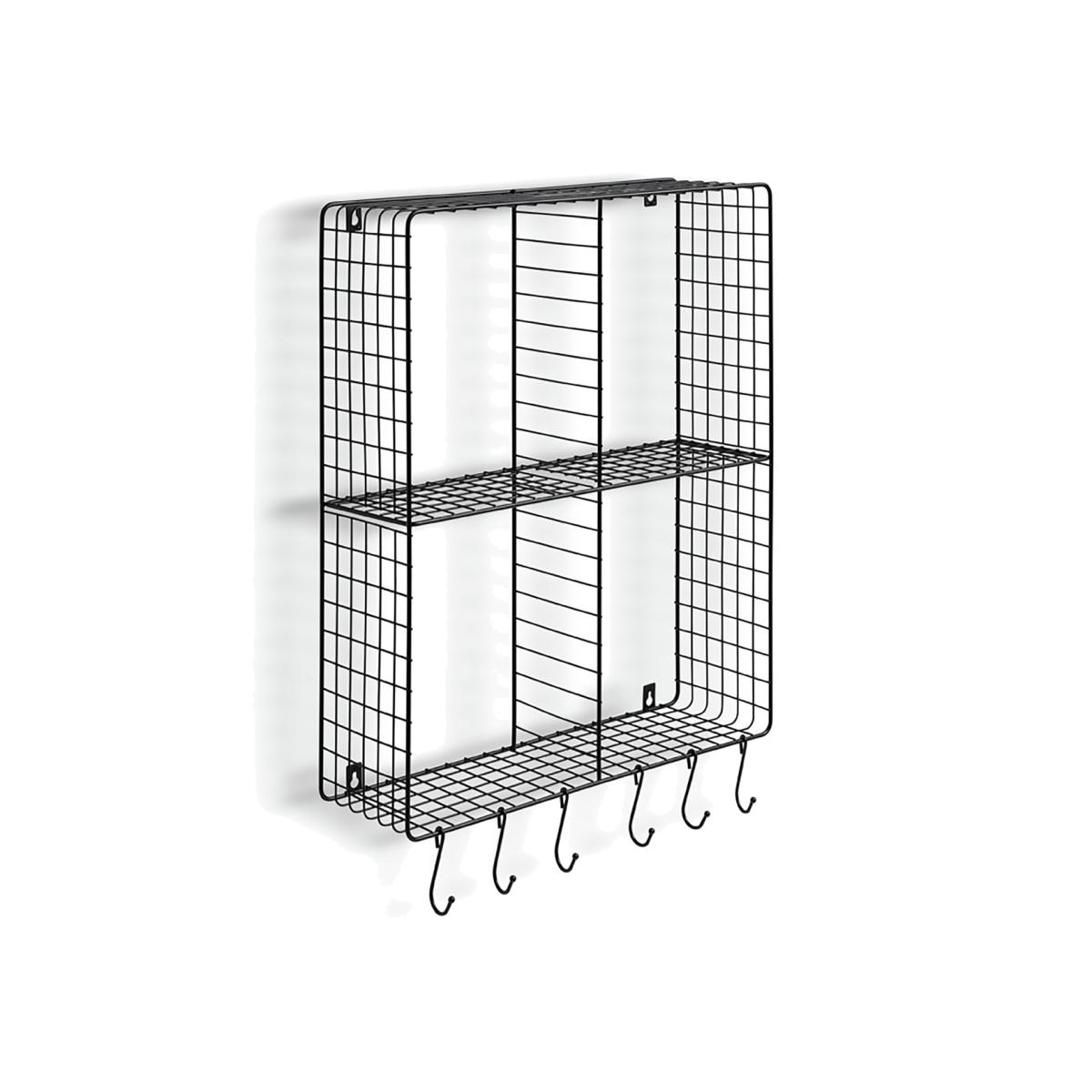 Indulge your industrial vibe. Our super-versatile shelving storage allows you to curate a different look in any room. Hang in your kitchen to display your spice collection, mugs and store your mail. Your keys need never go missing again with the convenient hooks we've added. Made from high quality steel and coated in modish black, it's a strong but subtle back drop to store and display anything and everything. We told you it was versatile. We've really nailed this trend. Made from steel with a metal finish. Size H60, W48.5, D18.73cm. Weight 1.71kg. Supports a maximum weight of 15kg. Fixings included. Fully assembled.