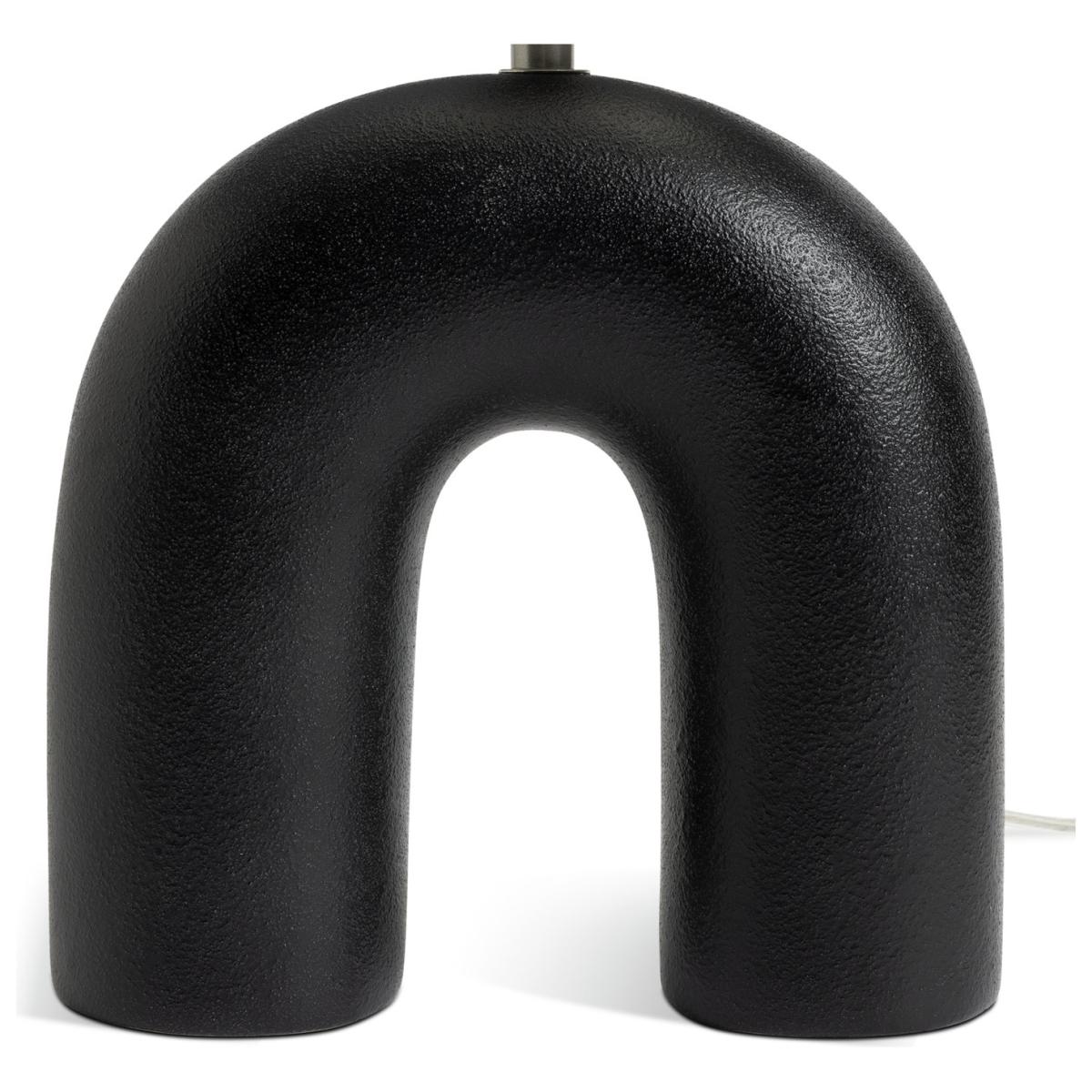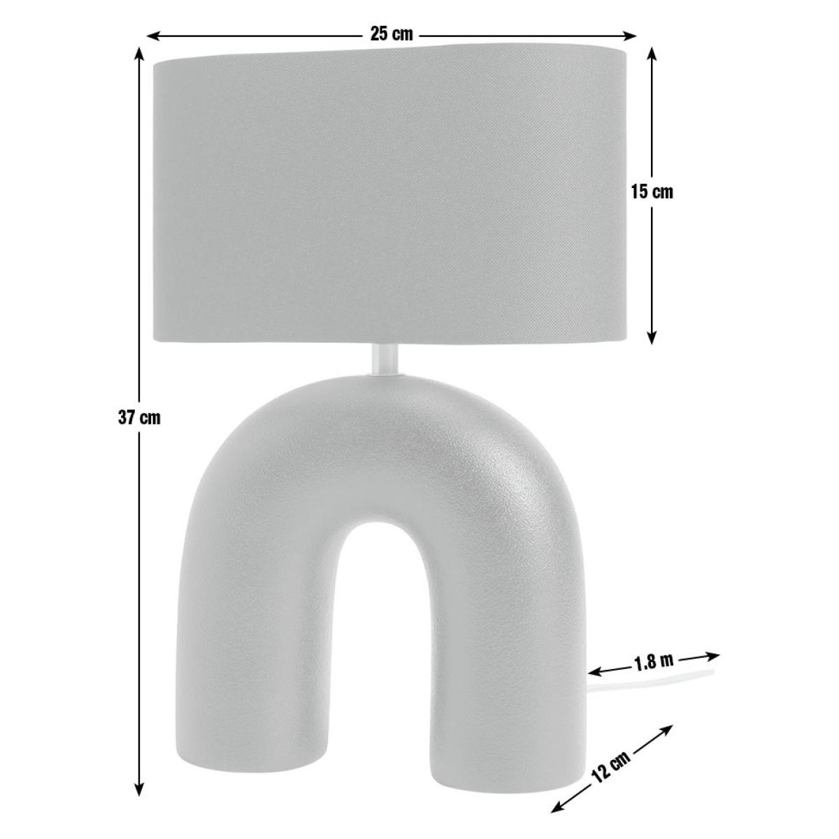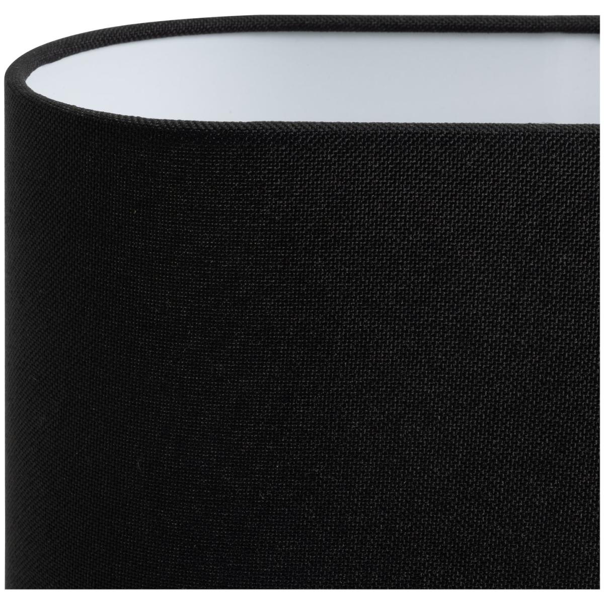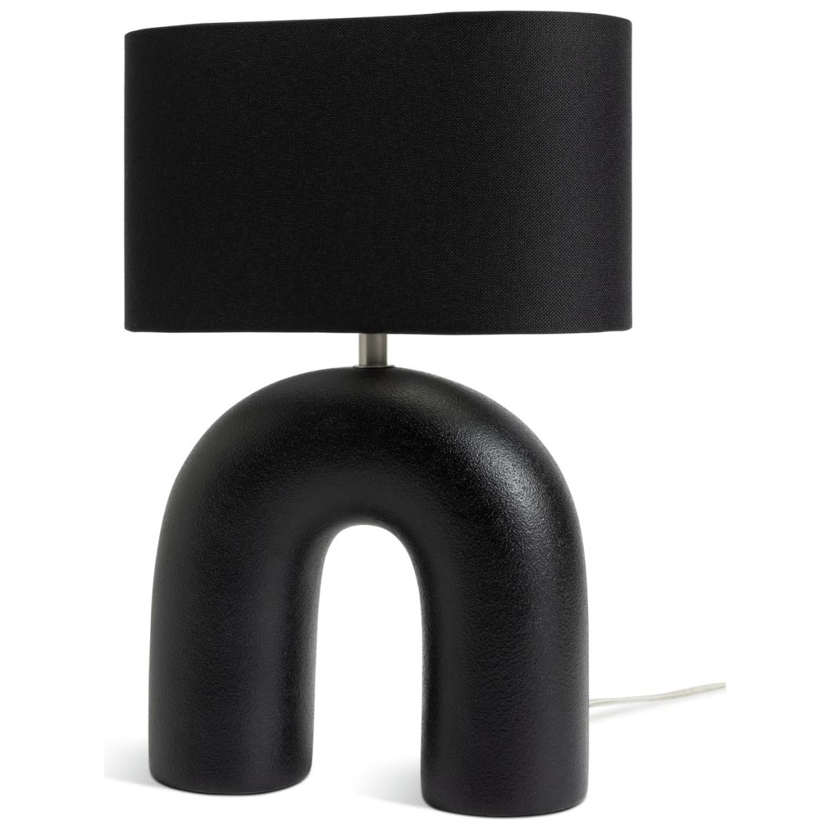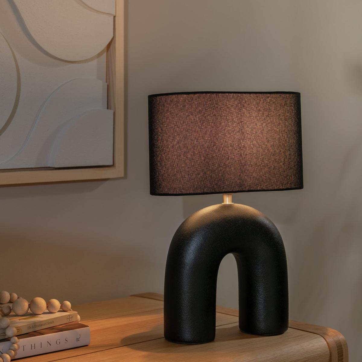 Delightfully distinctive. Our eye catching table lamp is a contemporary art dream. Made with a linen oval shade, sleek chrome detailing and a chunky curvaceous wishbone base. Lots of dimension, and all textured for a rich look and feel. Plus the inline switch means easy on, easy off. Really something. Dimensions: Overall size H37, W25, D12cm. Shade size H15, D25cm. Cord length 1.8m. Bulb Information: Bulbs required 1 x E14 small edison screw LED bulb(s) (not included). Recommended maximum wattage: 10 watts. General Information: Shade colour: black. Base colour: black. Shade material: linen. Base material: ceramic. In-line switch. IP rating 20 - not suitable for bathroom use. Minimal assembly. Product is mains powered plug in. This lighting product is a class 2 fitting. Manufacturer's 1 year guarantee.