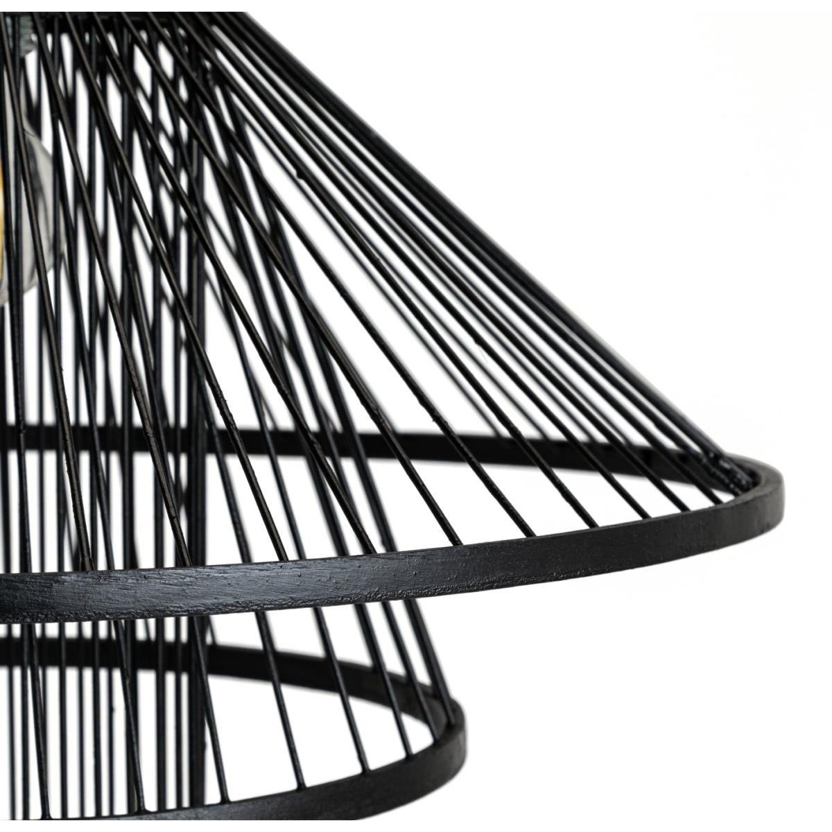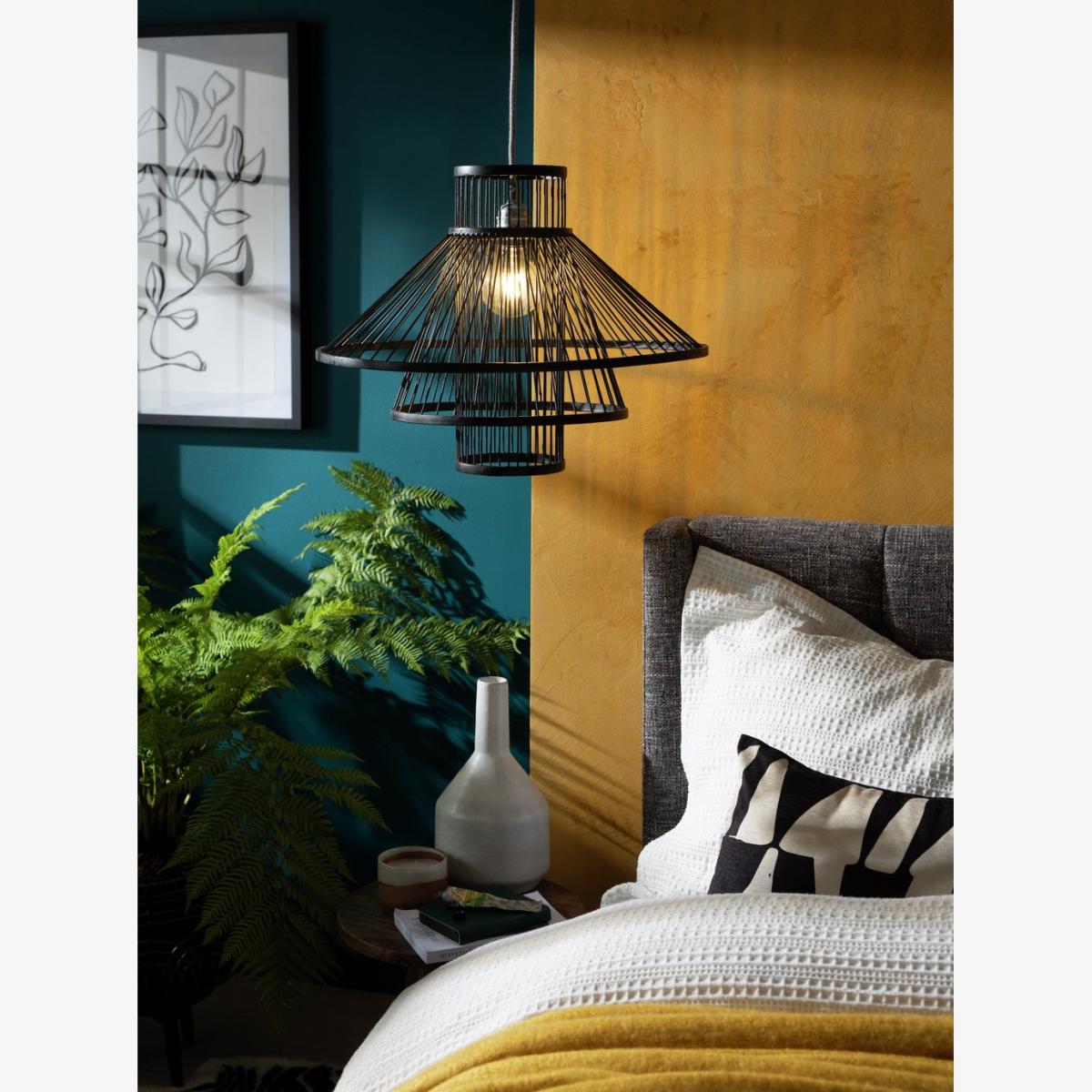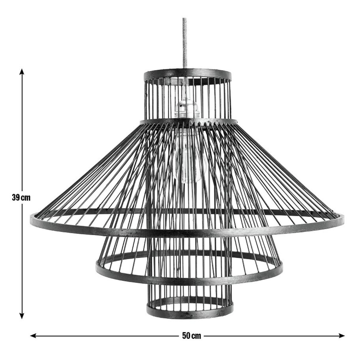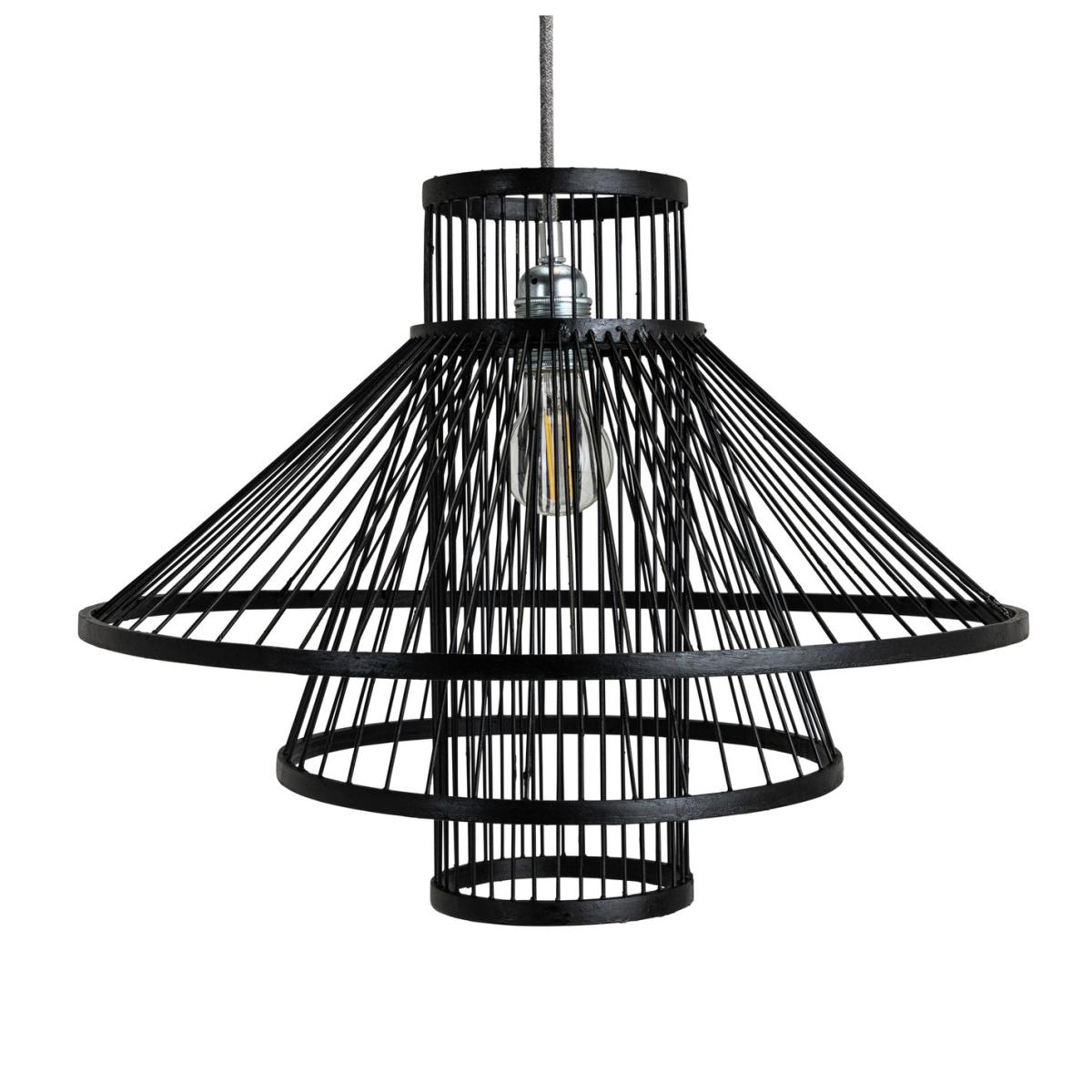 Three tiers for this stunning shade. With its contemporary cage design this black bamboo pendant shade demands centre stage. And there's never a dull moment. When the light shines through the 3 woven canopies you can enjoy your own shadow show. Very theatrical. A bold look for a lounge, bedroom, or dining room. Dramatically dark, naturally exotic. Easy to fit, this super shade requires no assembly. Just attach to your current light fitting, and voila! Made from bamboo. Size H39cm, Diameter 50cm. Recommended maximum bulb wattage 10 watts. Supplied assembled. Easy fit shade. Manufacturer's 1 year guarantee.