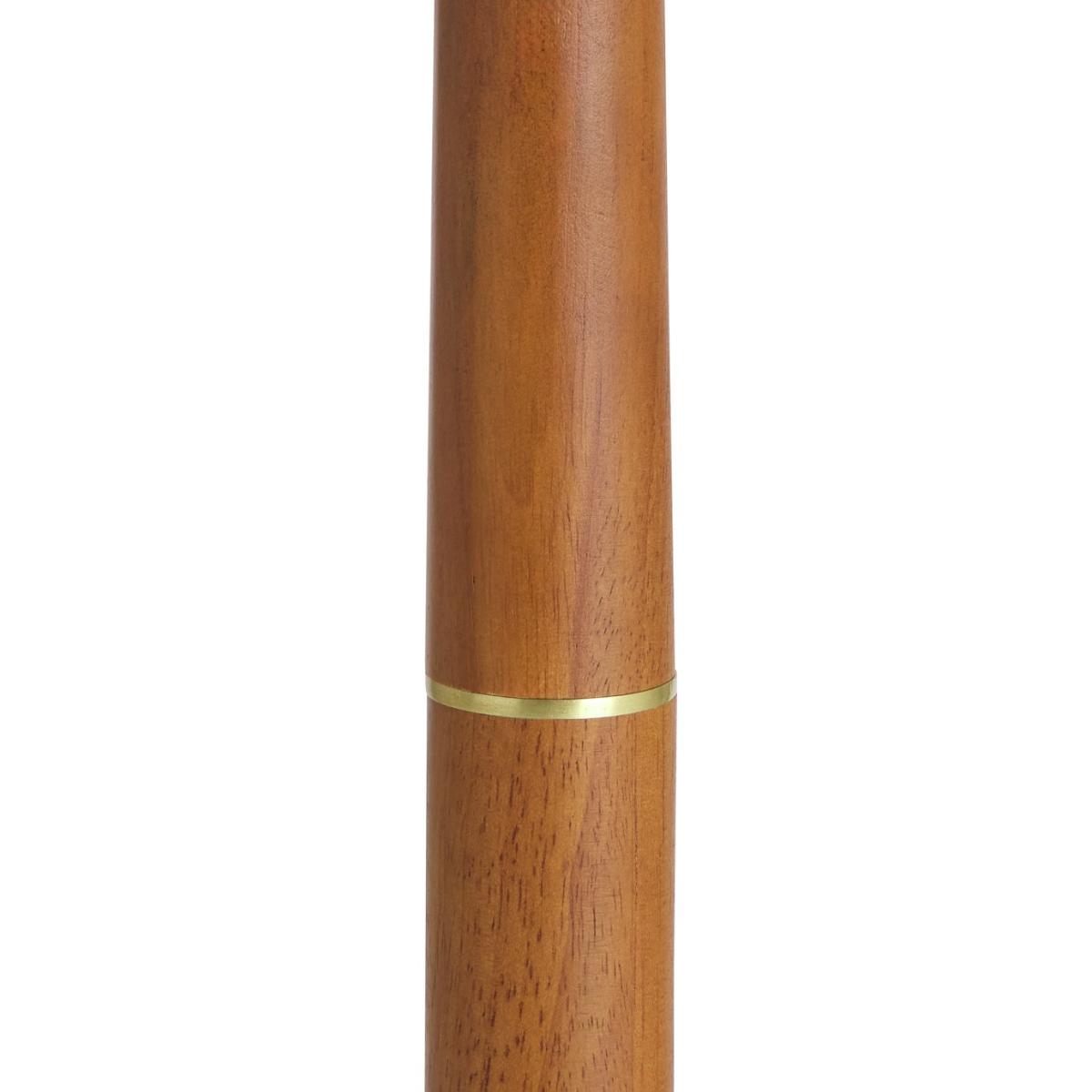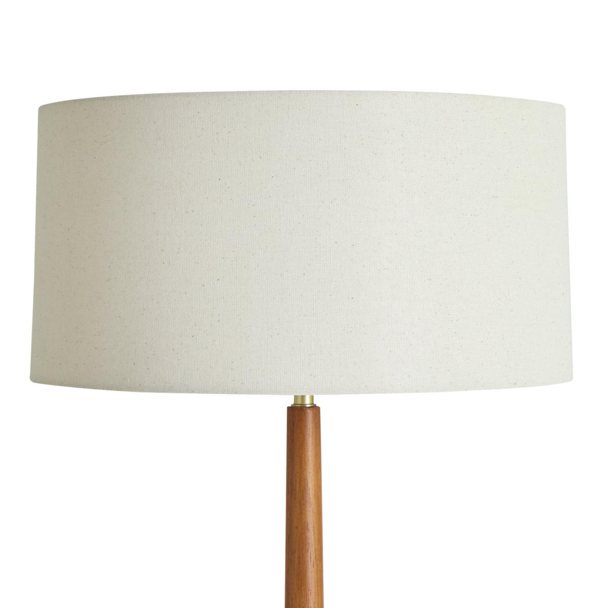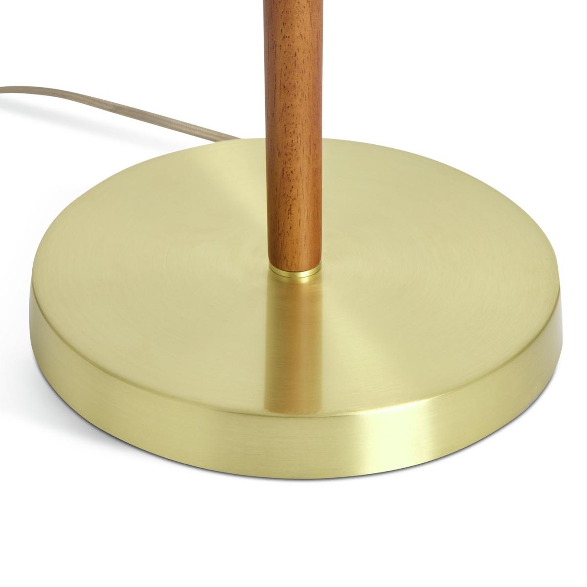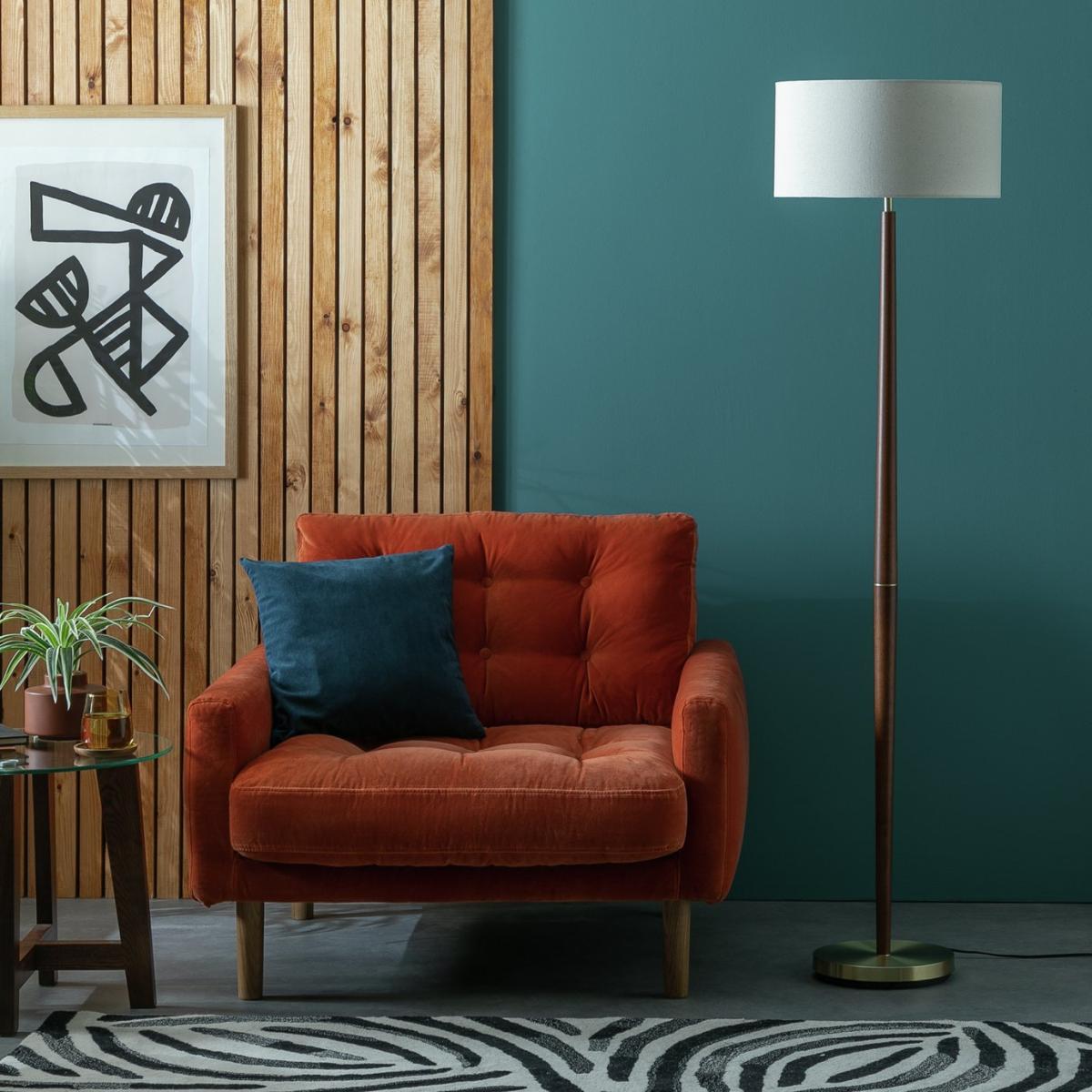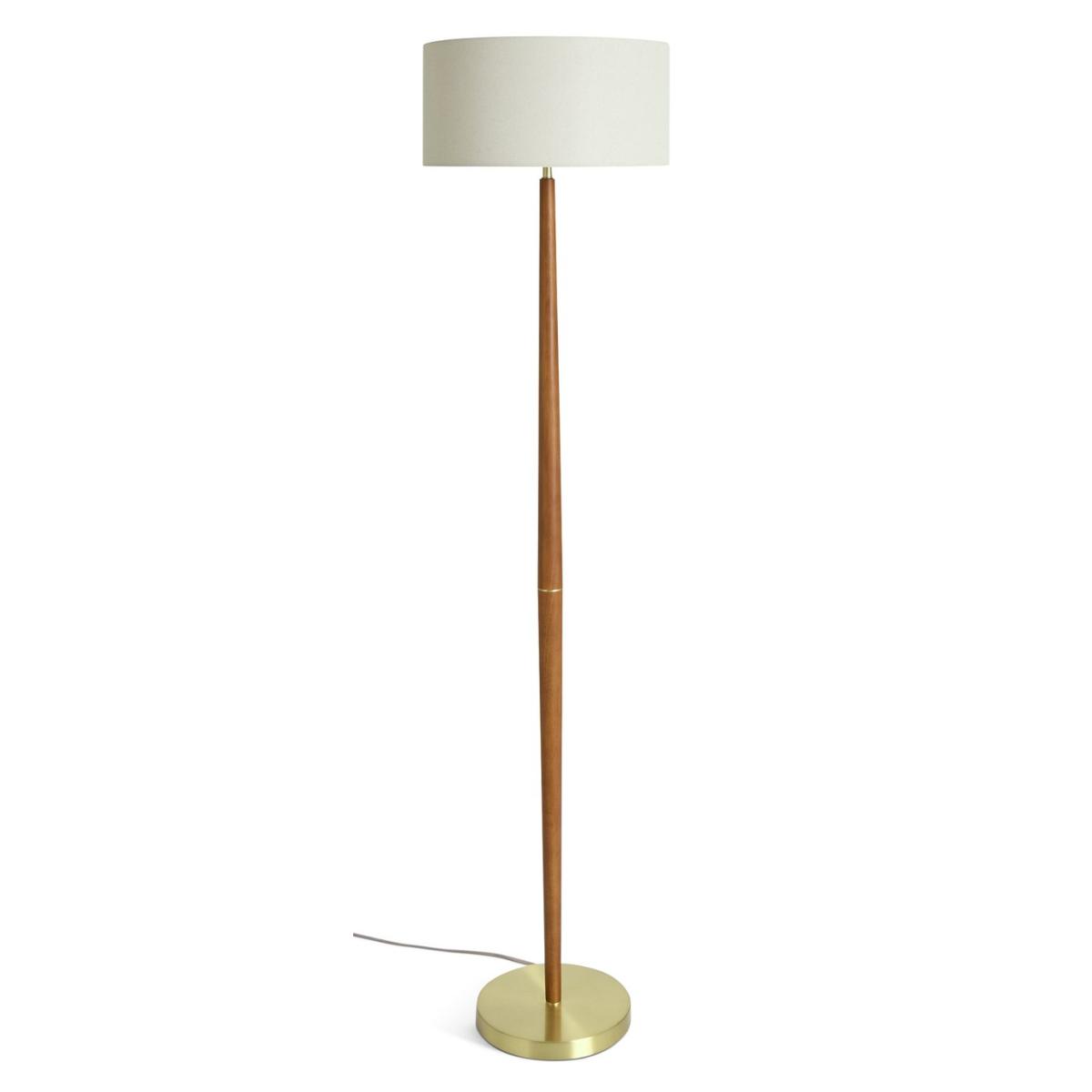 From top to toe, this tall and slender floor lamp strikes a pose. With its wooden stem, antique brass base and clean contemporary shade, it's a lesson in understated glamour. Pop it next to a reading chair, sofa or desk and let the soft, downward glow do its thing. Mid-century inspiration meets modern minimalism. Dimensions: Size H157, W40, Diameter 40cm. Diameter of base 25cm. Shade size H20, D 40cm. Cord length 2m. Bulb Information: Bulb required 1 x classic E27 edison screw LED (not included). 15 watts. LED bulb only. General Information: Shade material: faux linen. Base material: metal. Foot switch. IP 20. Minimal assembly. Product is mains powered plug in. This lighting product is a class 2 fitting. Weight 4kg. By choosing FSC certified products, you are supporting responsible management of the world's forests. Manufacturer's 1 year guarantee.
