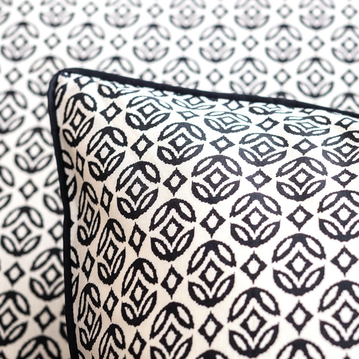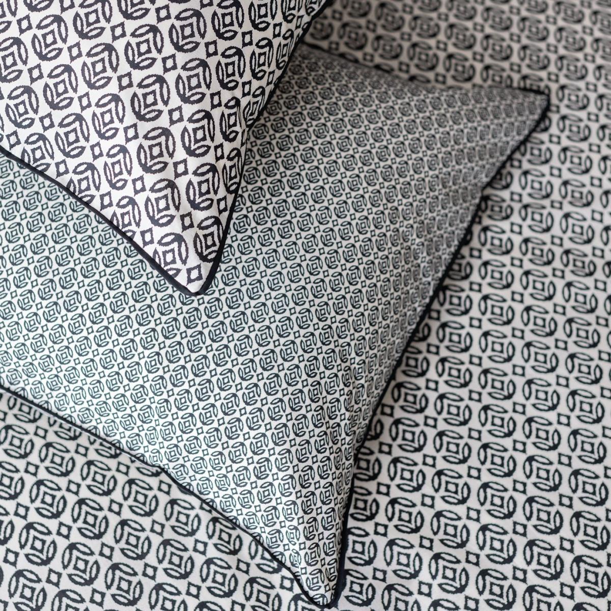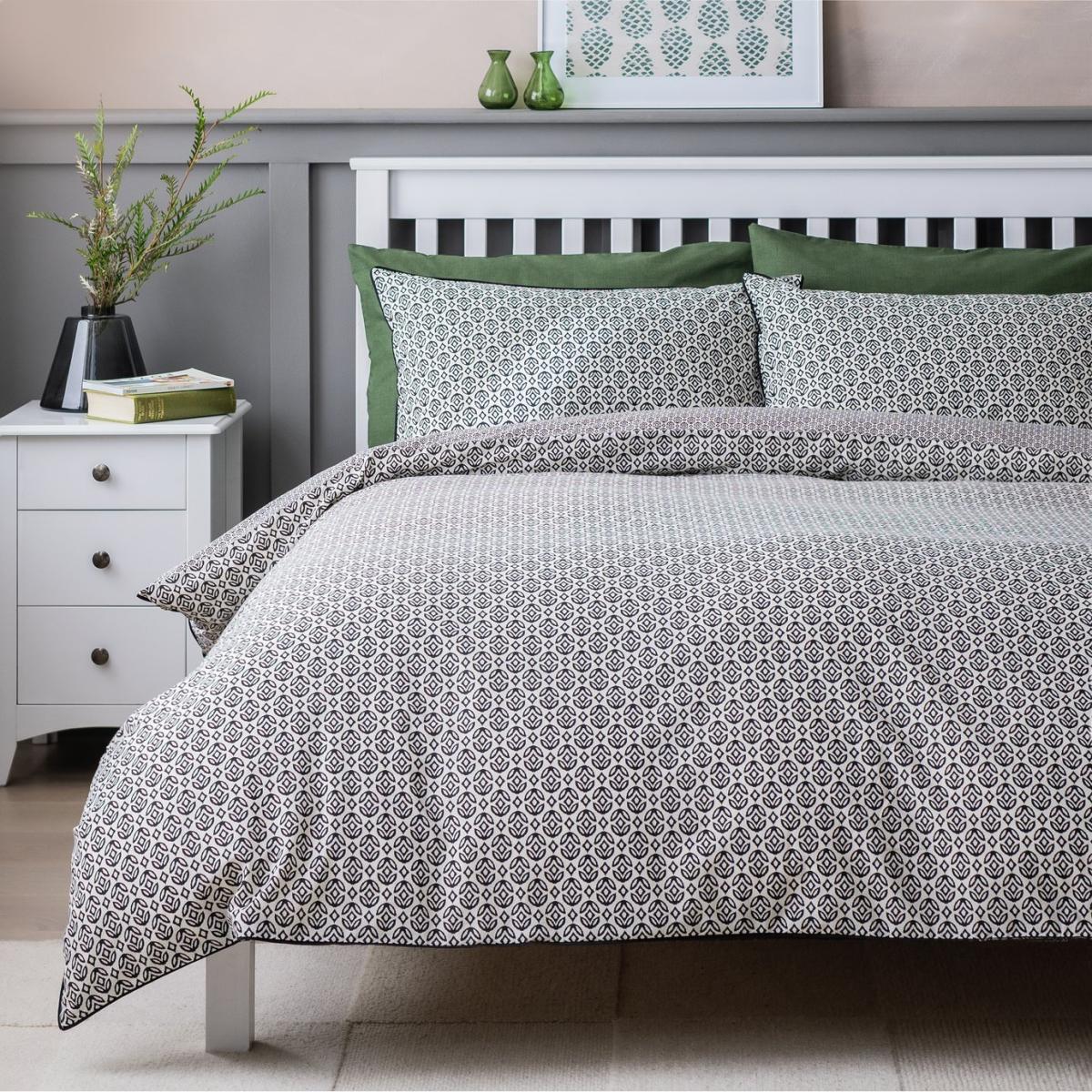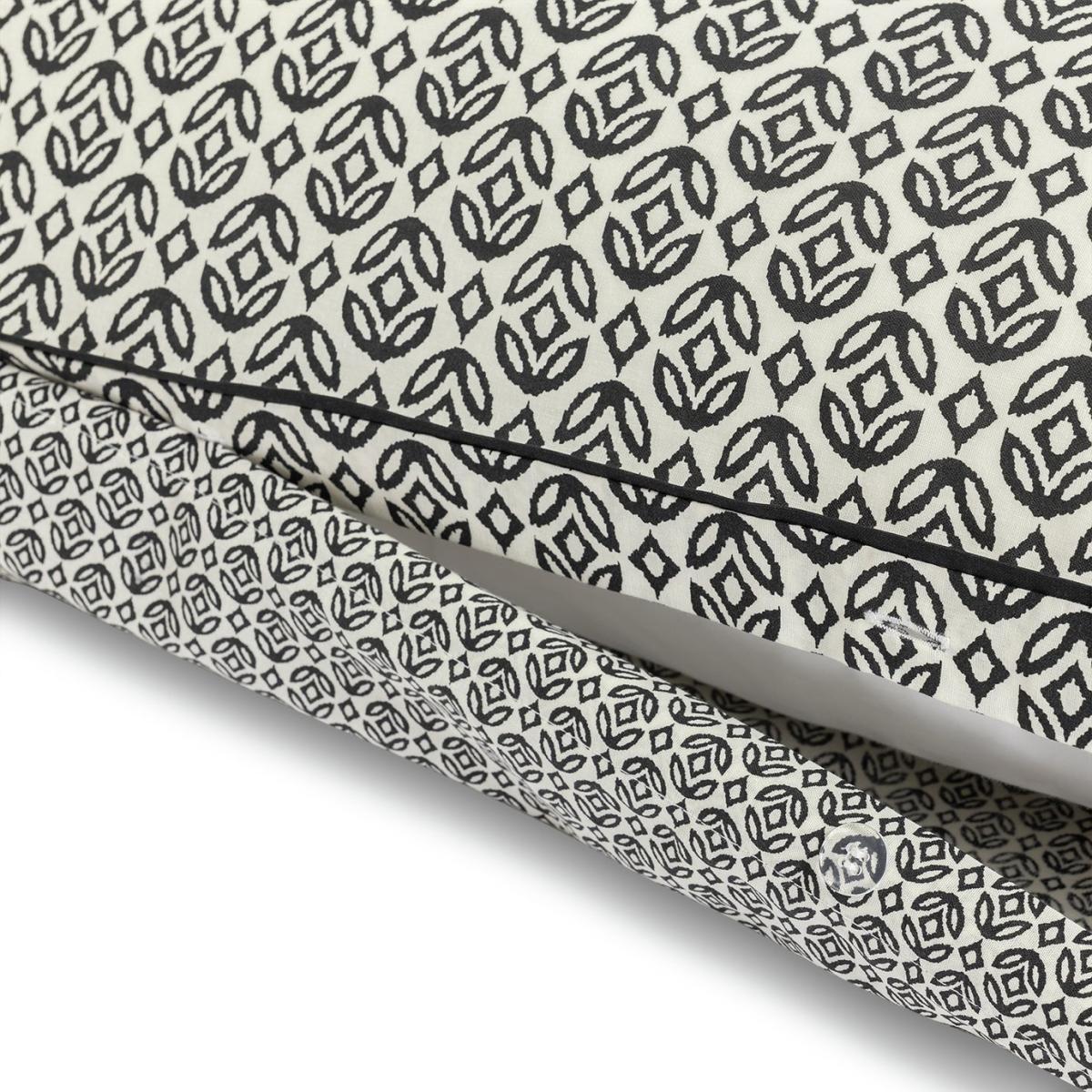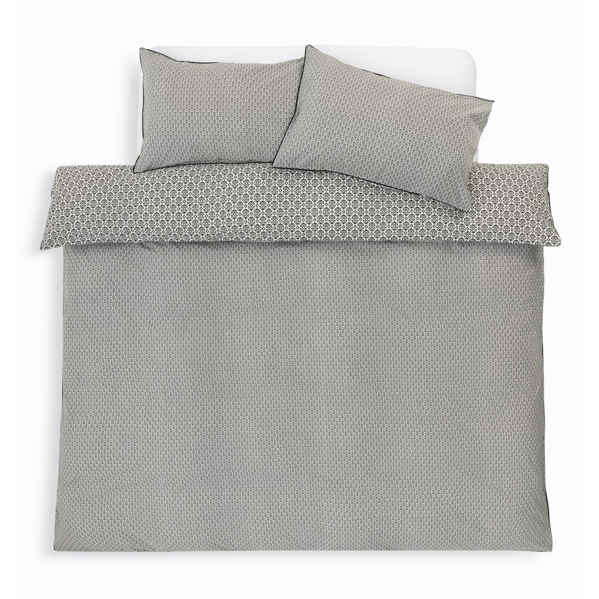 Snuggle into this gorgeous geo bedding set. In a monochrome palette with a woodblock style repeat pattern print. Reversible, with the same design in a smaller repeat pattern. Both duvet cover and pillowcases are edged with black piping for a classic finish. 50% cotton, 50% recycled polyester. 144 thread count. Set includes 1 duvet cover and 2 pillowcases. Bed size: king size. Length 220cm, Width 230cm. Reversible. Standard pillowcase (s). Pillow case length 75cm, Width 50cm. Reversible pillowcase (s). Suitable for tumble drying.