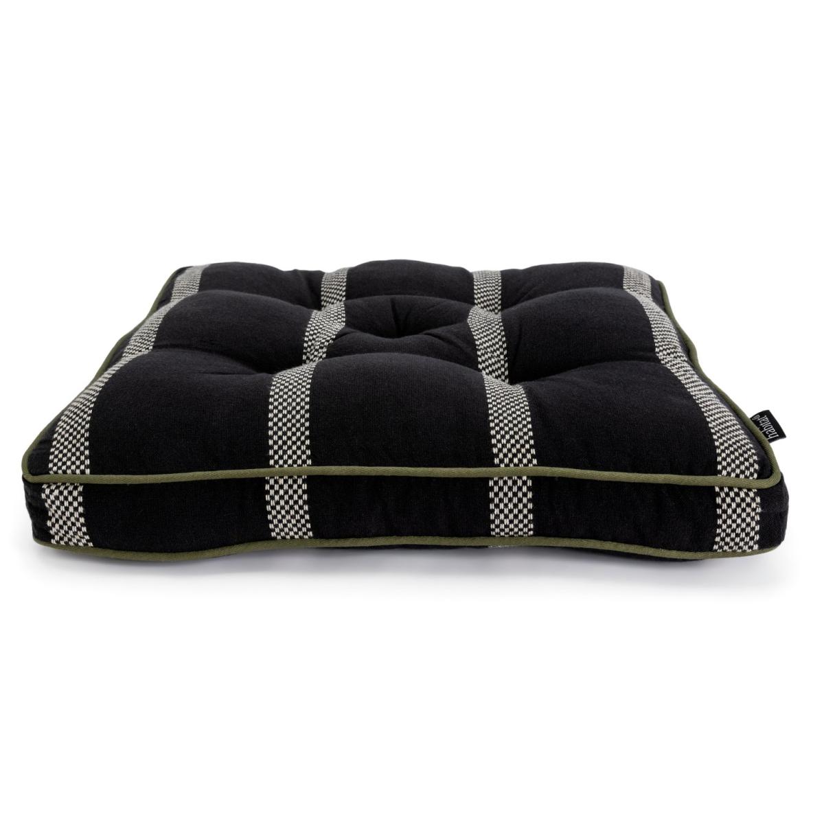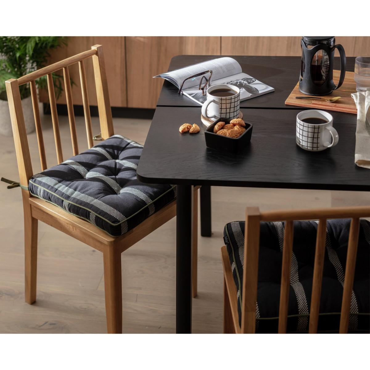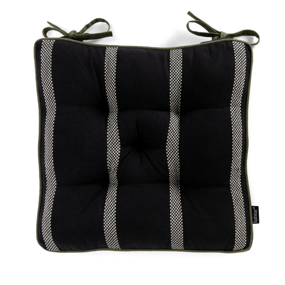 Designed exclusively in-house, this pair of black and check stripe seat pads are a smart way to add instant comfort and style to a chair. Plumply stuffed with recycled wadding, each cushion is finished with dark green piping that matches the green ties. From tea towels to tablecloths, dinnerware to glassware, we've lots of simple ways to bring home a pop of designer cool. Cotton cover. Recycled Polyester filling. Secured by ties. Size L40, W40cm. Sponge clean only. Manufacturer's 1 year guarantee.