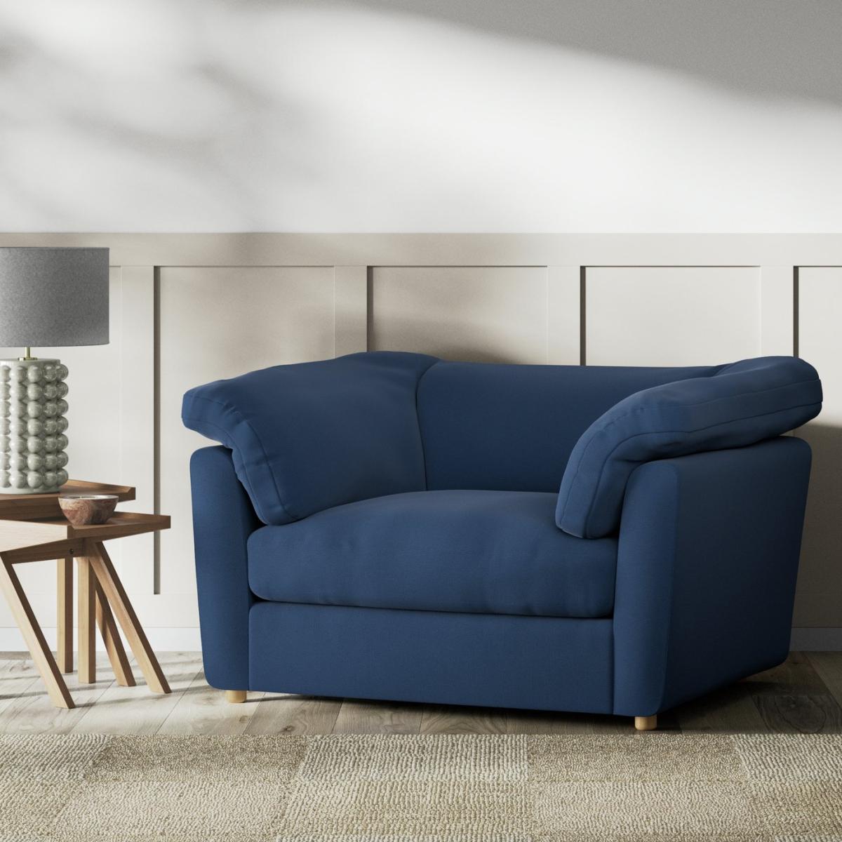 When it's made for you, you know you'll love it. Spacious for one, cosy for two, the inviting Wynn cuddle chair takes relaxation to the next level. Its generous retro style with wrap around back and ARM cushions, is stuffed with sink in softness. The supportive foam is topped with a feather filled duvet for a leisurely laid-back design offering ultimate comfort. Upholstered in Aquaclean Chenille, the Wynn combines a soft feel with easy clean durability. Practical as well as sumptuous, the seats, backs and ARM pads are all removable for easy plumping and cleaning. Handmade to order in the UK. The Wynn uses quality materials and traditional techniques for furniture that's unique to you. Available in a choice of sizes and fabrics including Aquaclean technology protection built into the yarn, which is easy to clean with just water. Part of the Wynn collection. Material: Made from 100% polyester. Wooden feet. Removable seat with feather and foam filling. Removable cushion(s) with feather filling. Dimensions: Size H75, W136.5, D105cm. Floor to seat height: 47cm. Depth of seat: 69cm. Height of seat back: 28cm. Width of seating area between arms: 56.5cm. Height of ARM rest: 75cm. Packaged dimensions: Package size H77, W138.5, D109cm. General information: We do more than deliver your product, we unpack, set it up and take away the packaging. Manufactured in the UK using components sourced globally. Professional clean only. Plump cushions regularly to maintain shape. Manufacturer's 15 year frame guarantee.