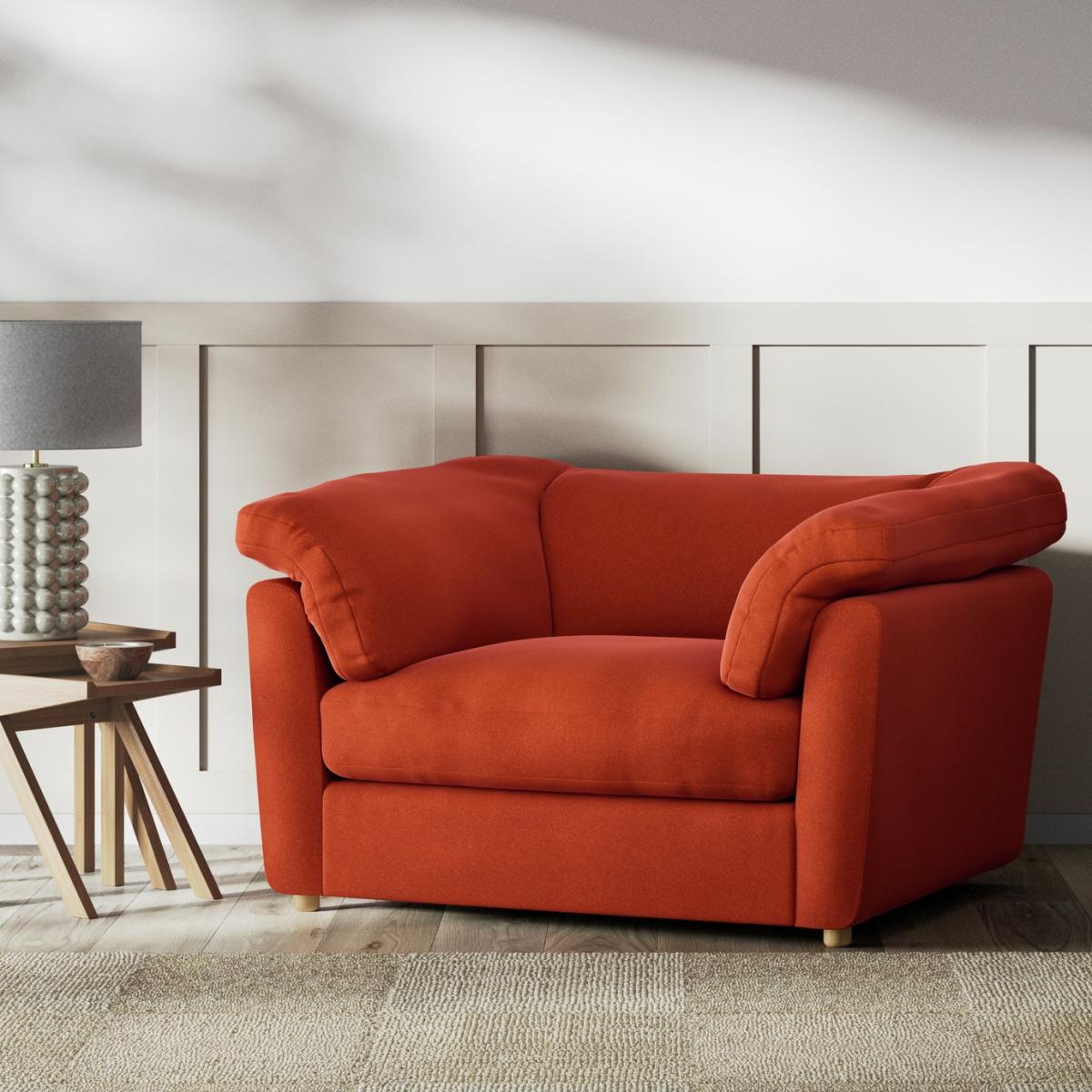 When it's made for you, you know you'll love it. Spacious for one, cosy for two, the inviting Wynn cuddle chair takes relaxation to the next level. Its generous retro style with wrap around back and ARM cushions, is stuffed with sink in softness. The supportive foam is topped with a feather filled duvet for a leisurely laid-back design offering ultimate comfort. Upholstered in rich Velvet, the Wynn takes on a luxe look. Practical as well as sumptuous, the seats, backs and ARM pads are all removable for easy plumping and cleaning. Handmade to order in the UK. The Wynn uses quality materials and traditional techniques for furniture that's unique to you. Available in a choice of sizes and fabrics including Aquaclean technology protection built into the yarn, which is easy to clean with just water. Part of the Wynn collection. Material: Made from 100% recycled polyester. Wooden feet. Removable seat with feather and foam filling. Removable cushion(s) with feather filling. Dimensions: Size H75, W136.5, D105cm. Floor to seat height: 47cm. Depth of seat: 69cm. Height of seat back: 28cm. Width of seating area between arms: 56.5cm. Height of ARM rest: 75cm. Packaged dimensions: Package size H77, W138.5, D109cm. General information: We do more than deliver your product, we unpack, set it up and take away the packaging. Manufactured in the UK using components sourced globally. Professional clean only. Plump cushions regularly to maintain shape. Manufacturer's 15 year frame guarantee.