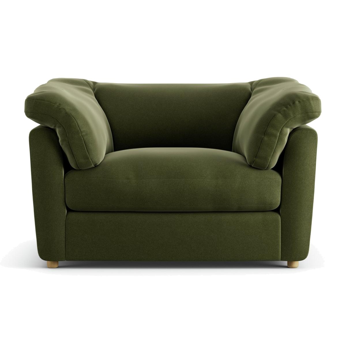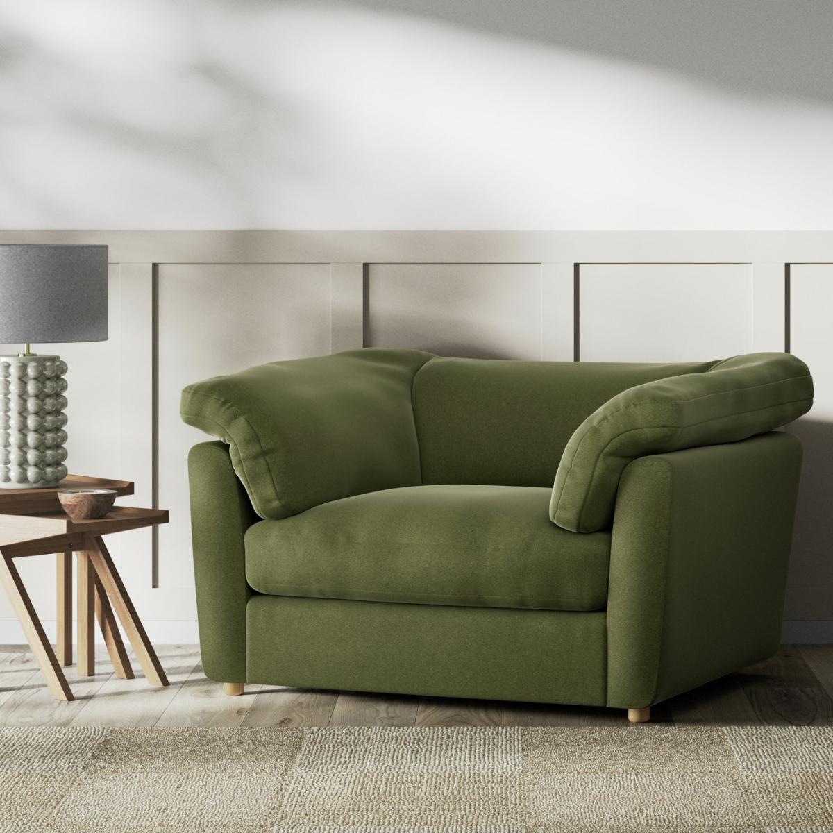 When it's made for you, you know you'll love it. Spacious for one, cosy for two, the inviting Wynn cuddle chair takes relaxation to the next level. Its generous retro style with wrap around back and ARM cushions, is stuffed with sink in softness. The supportive foam is topped with a feather filled duvet for a leisurely laid-back design offering ultimate comfort. Upholstered in rich Velvet, the Wynn takes on a luxe look. Practical as well as sumptuous, the seats, backs and ARM pads are all removable for easy plumping and cleaning. Handmade to order in the UK. The Wynn uses quality materials and traditional techniques for furniture that's unique to you. Available in a choice of sizes and fabrics including Aquaclean technology protection built into the yarn, which is easy to clean with just water. Part of the Wynn collection. Material: Made from 100% recycled polyester. Wooden feet. Removable seat with feather and foam filling. Removable cushion(s) with feather filling. Dimensions: Size H75, W136.5, D105cm. Floor to seat height: 47cm. Depth of seat: 69cm. Height of seat back: 28cm. Width of seating area between arms: 56.5cm. Height of ARM rest: 75cm. Packaged dimensions: Package size H77, W138.5, D109cm. General information: We do more than deliver your product, we unpack, set it up and take away the packaging. Manufactured in the UK using components sourced globally. Professional clean only. Plump cushions regularly to maintain shape. Manufacturer's 15 year frame guarantee.