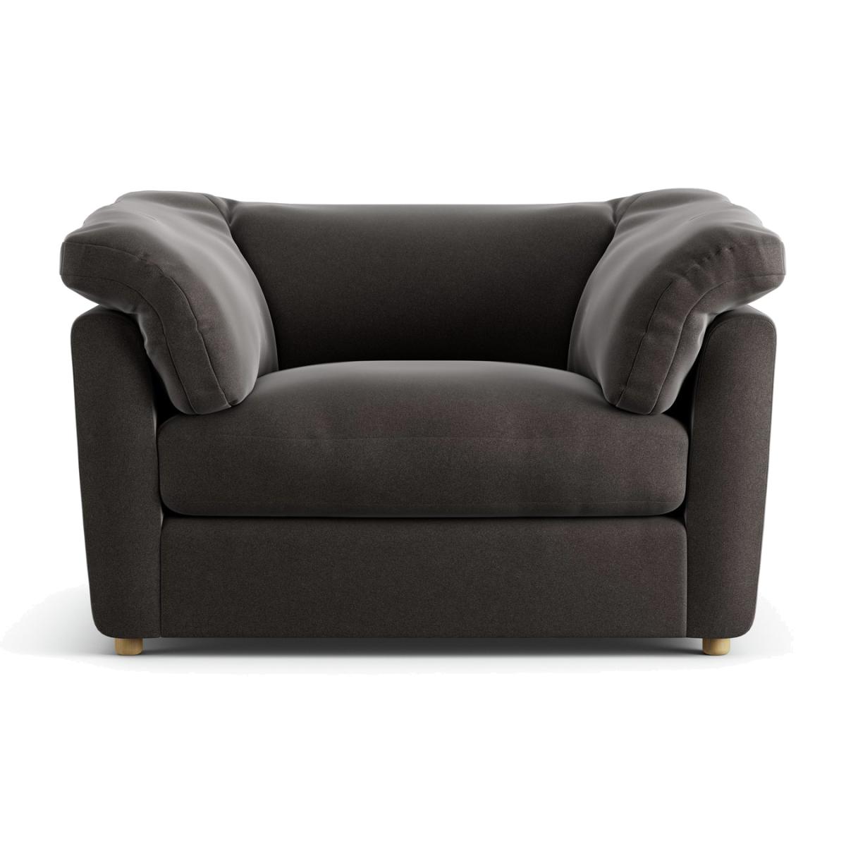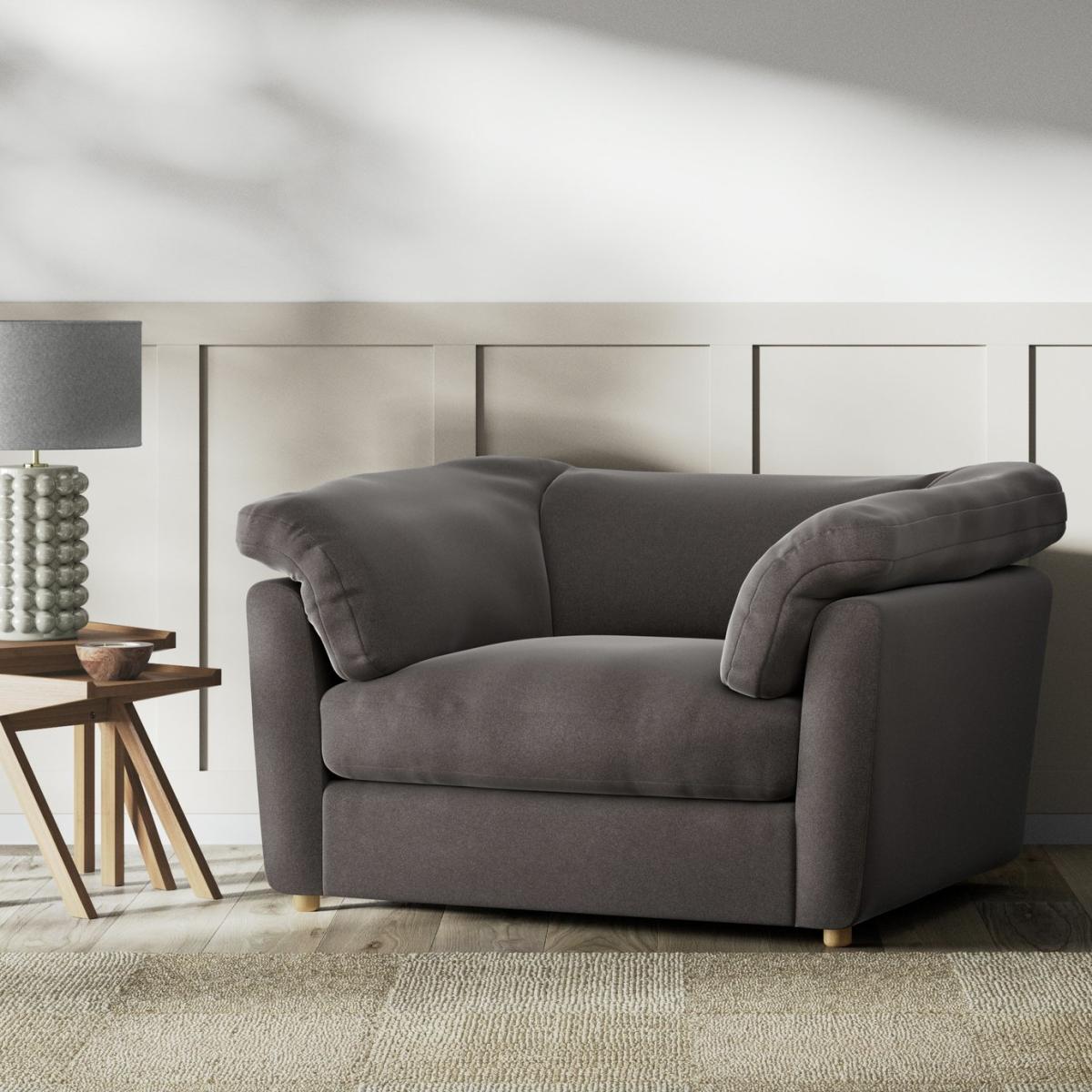 When it's made for you, you know you'll love it. Spacious for one, cosy for two, the inviting Wynn cuddle chair takes relaxation to the next level. Its generous retro style with wrap around back and ARM cushions, is stuffed with sink in softness. The supportive foam is topped with a feather-filled duvet for a leisurely, laid-back design offering ultimate comfort. Upholstered in rich Velvet, the Wynn takes on a luxe look. Practical as well as sumptuous, the seats, backs and ARM pads are all removable for easy plumping and cleaning. Handmade to order in the UK. The Wynn uses quality materials and traditional techniques for furniture that's unique to you. Available in a choice of sizes and fabrics including Aquaclean technology protection built into the yarn, which is easy to clean with just water. Part of the Wynn collection. Material: Made from 100% recycled polyester. Wooden feet. Removable seat with feather and foam filling. Removable cushion(s) with feather filling. Dimensions: Size H75, W136.5, D105cm. Floor to seat height: 47cm. Depth of seat: 69cm. Height of seat back: 28cm. Width of seating area between arms: 56.5cm. Height of ARM rest: 75cm. Packaged dimensions: Package size H77, W138.5, D109cm. General information: We do more than deliver your product, we unpack, set it up and take away the packaging. Manufactured in the UK using components sourced globally. Professional clean only. Plump cushions regularly to maintain shape. Manufacturer's 15 year frame guarantee.