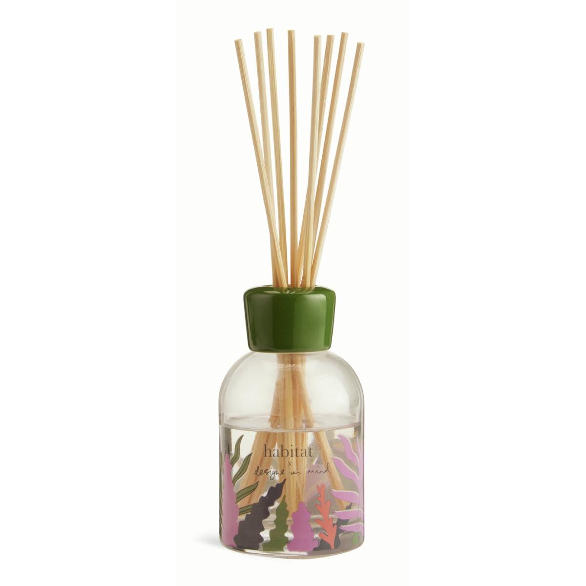 Unwind with Designs in Mind. This beautifully blissful scented diffuser has notes of lychee and pear. A fruity fragrance just right for some well-deserved me time. The colourful glass bottle with a botanical pattern matches its invigorating aroma in every way. Part of the Habitat and Design In Mind, imaginative mood enhancing collection. Bright Skies scent. Scent lasts: 12 weeks. Reed Material: rattan. Includes glass diffuser bottle, rattan reeds, fragrance oil. 90ml capacity. Size H8.2, W6.3, D6.3cm. Designs in Mind.