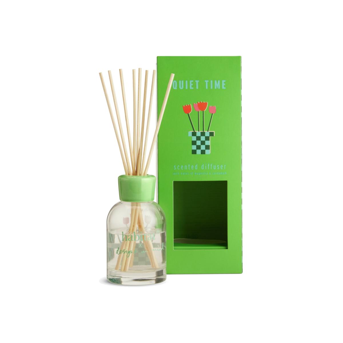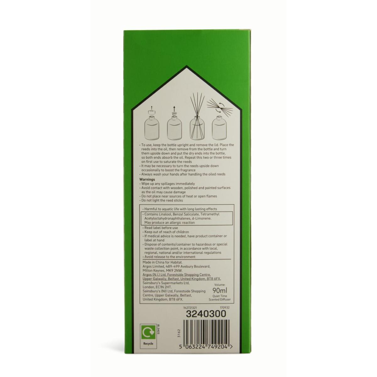 Enjoy this beautifully aromatic scented diffuser with notes of magnolia and cardamom. A calming fragrance that's just right for some well-deserved me time. Part of the Habitat and Design In Mind, imaginative mood enhancing collection. Quiet time scent. Scent lasts: 12 weeks. Reed Material: Rattan. Includes glass bottle, reeds, fragrance oil. 90ml capacity. Size H8.2, W6.3, D6.3cm. Designs in Mind.