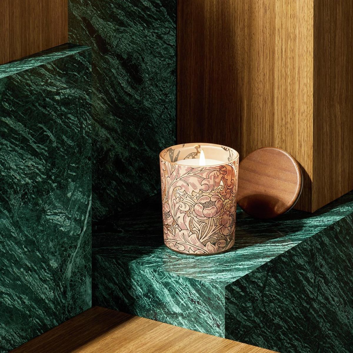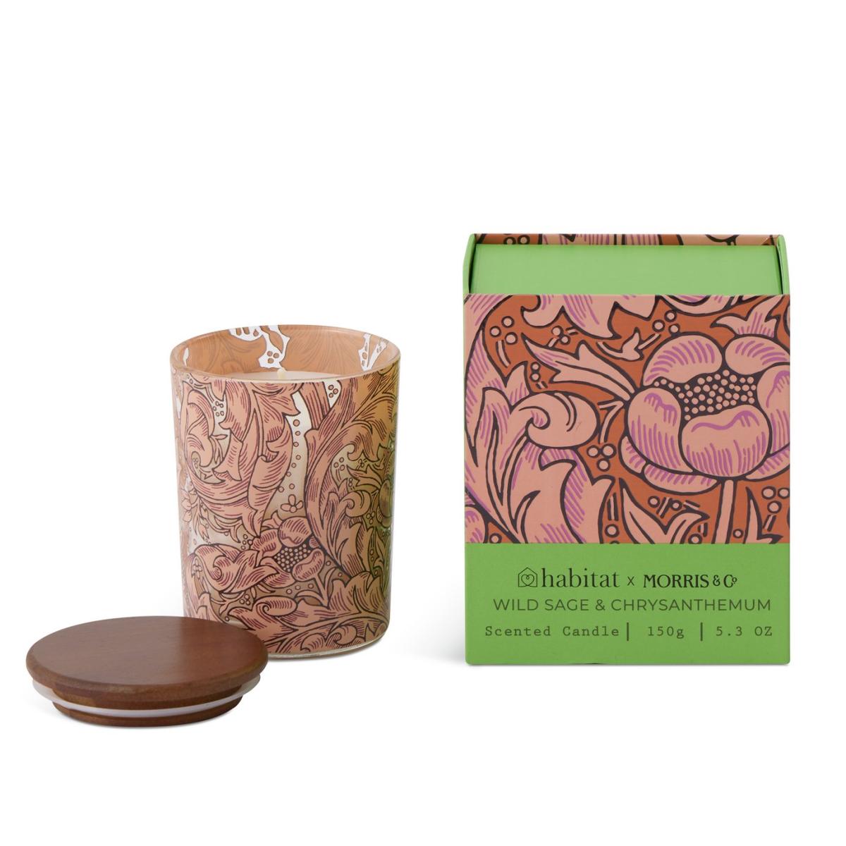 An impactful candle from Habitat x Morris & Co. Featuring the Batchelors Button print on the glass, topped with a lovely wooden lid and presented in a beautiful giftable box. Then immerse yourself in the sophisticated aroma of Wild Sage and Chrysanthemum. This floral scent blends Rhubarb Leaf with Lavender alongside smouldering smoky notes evoking the allure of timeless craftsmanship. Habitat x Morris & Co. A celebration of British design heritage with a fresh take on the iconic prints of William Morris. Part of the Habitat x Morris & Co. Collection. Wild Sage and Chrysanthemum scent. Paraffin wax. Approximate burn time 28 hours. Size H9, W7, D9cm. Diameter 7cm.