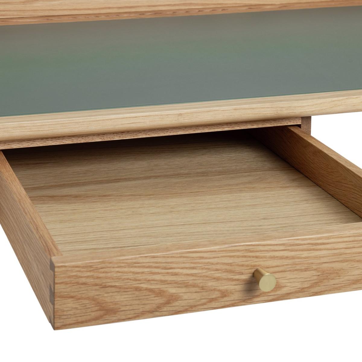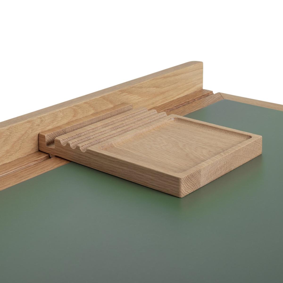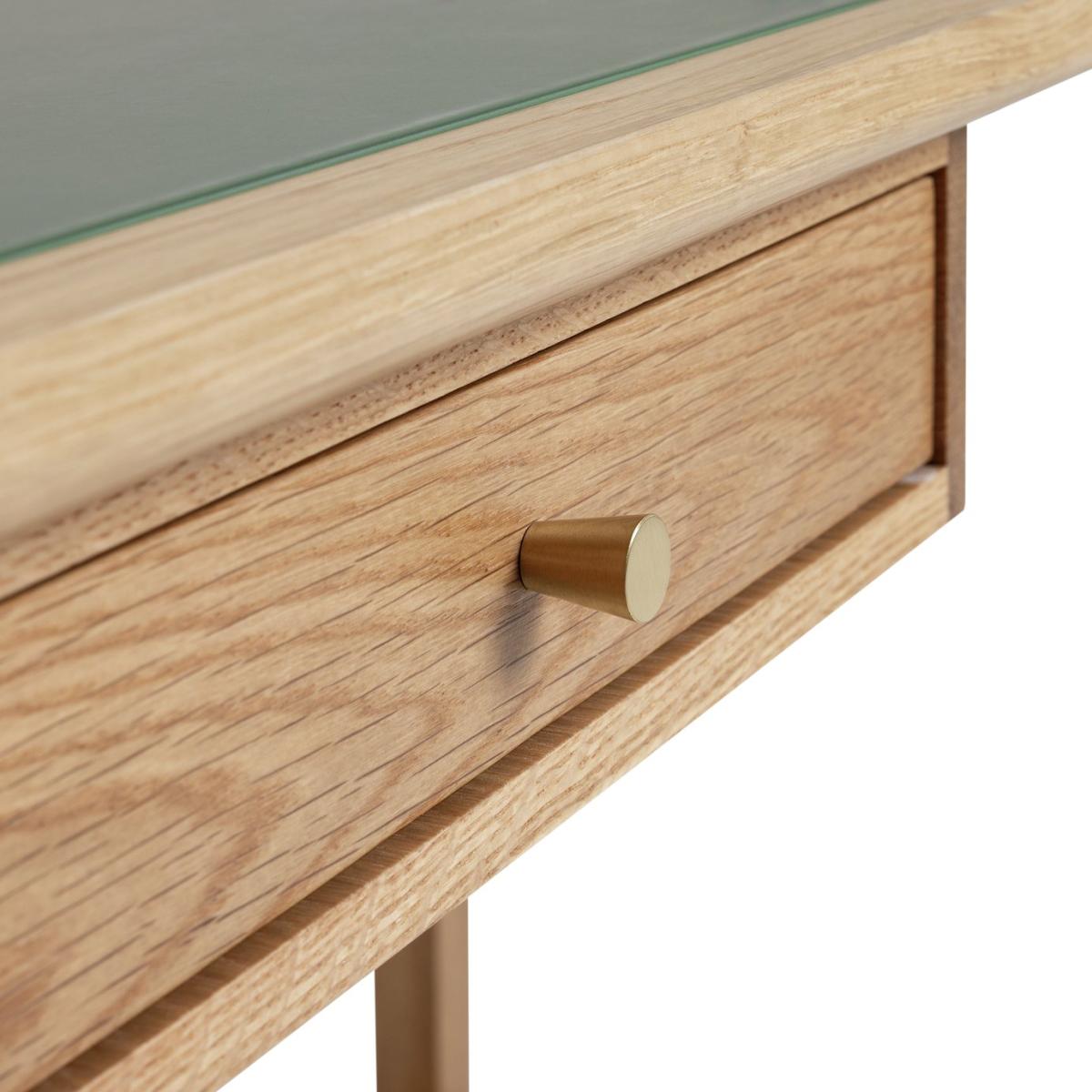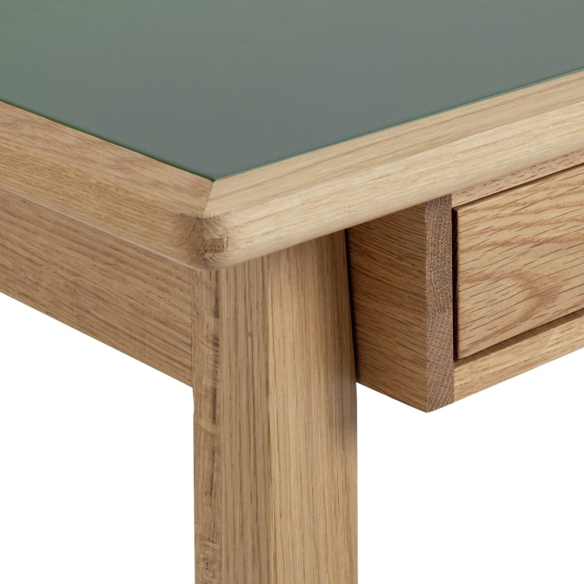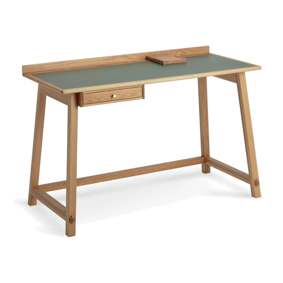 Our Canterbury writing desk is a beautiful, honest and hand finished piece of furniture from Habitat x Morris & Co. Designed to be cherished by generations, who value the skill and detailed craftsmanship invested in this Arts & Craft inspired desk. It features an oak pen holder that slides in its own groove and a pull-out drawer for essential stationery. Highly practical, it has a warm and attractive grain on the solid oak and oak veneer frame and a wipe-clean top in moss green. A naturally pleasing piece that's compact and easy to place. Habitat x Morris & Co. A celebration of British design heritage inspired by the fundamentally important principles of the iconic William Morris. To produce authentically timeless pieces that are the epitome of utility and beauty. Part of the Habitat x Morris & Co collection. Made from wood and MDF with Metal handles. 1 drawer. Packed flat - 2 people recommended. If this product is over 60cm high it must be securely attached to the wall to prevent overturning. General information: Manufacturer's 1 year guarantee. Dimensions: Size H76, W120, D56cm. Under desk chair space H66, W98cm. Maximum load capacity of desk 30kg. Weight 25.5kg. Packaged dimensions: Package dimensions H16, W130.5, D89cm. FSC certified meaning the materials used for this product are responsibly sourced.