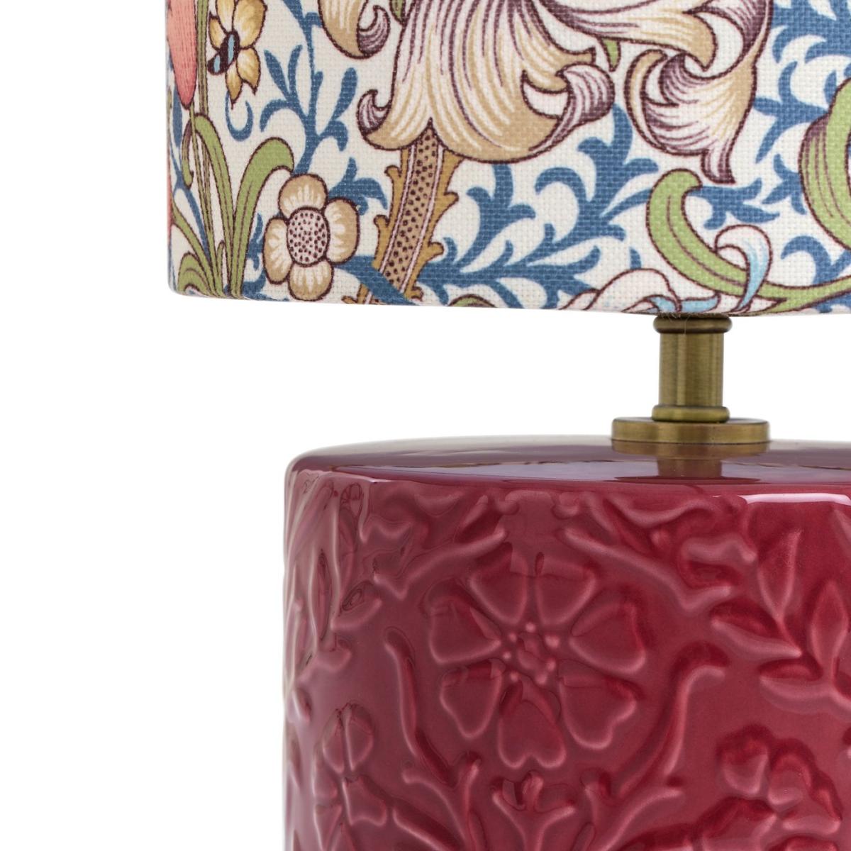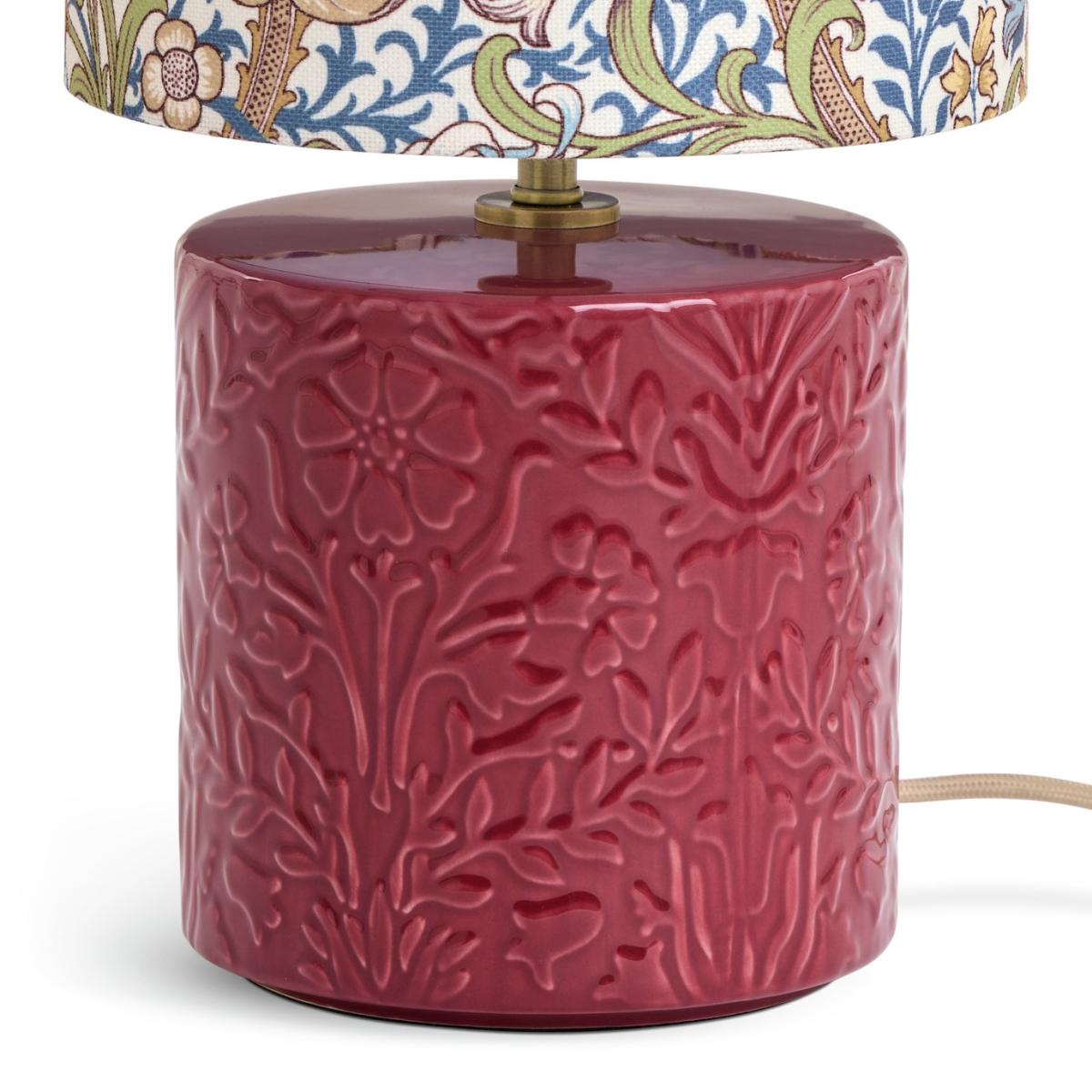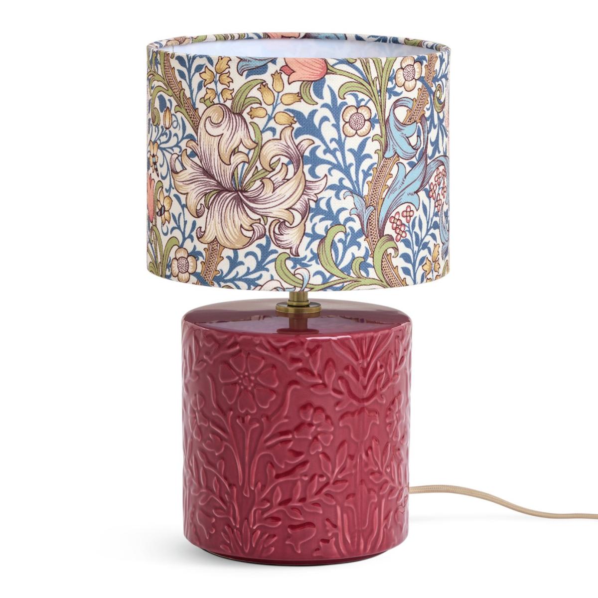 Swirling lily stems and tendrils adorn the shade of this elegant Arts & Crafts inspired table lamp. Soft blues and pops of coral sit alongside antique yellow flowers. A re-imagining of the glorious Golden Lily design by Habitat x Morris & Co. The ceramic base is embossed with intricate florals from the William Morris archives. Dramatic by day with a soft ambient glow at nightfall, it's all in the decorative detail. Habitat x Morris & Co. A celebration of British design heritage with a fresh take on the iconic prints of William Morris. Part of the Habitat x Morris & Co. Collection. Dimensions: Overall size H32.5, W20, D20 cm. Diameter 20cm. Shade size H15, D20cm. Diameter of base 15cm. Cord length 1.8m. Bulb Information: Bulbs required 1 x candle E14 small edison screw LED bulb(s)(not included). Recommended maximum wattage: 10 watts. LED bulb only. General Information: Shade colour: multicoloured. Base colour: red. Shade material: polyester. Base material: stoneware. In-line switch. IP rating 20. Minimal assembly. Product is mains powered plug in. This lighting product is a class 2 fitting. Manufacturer's 1 year guarantee.