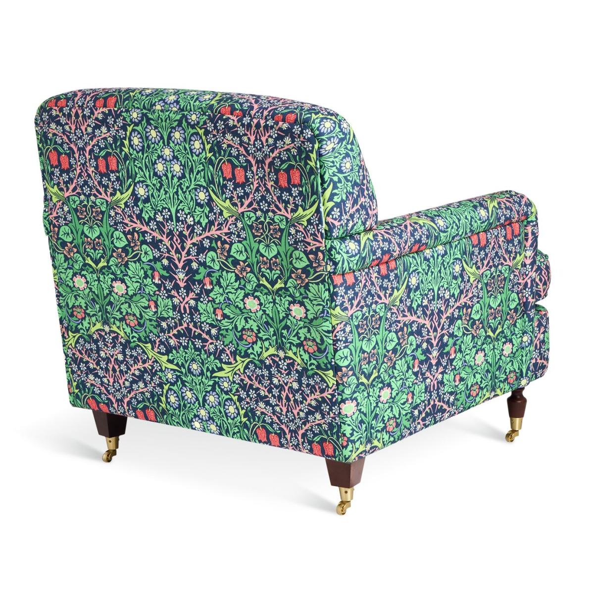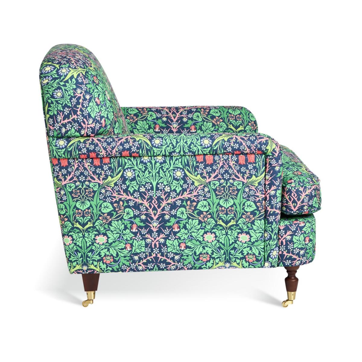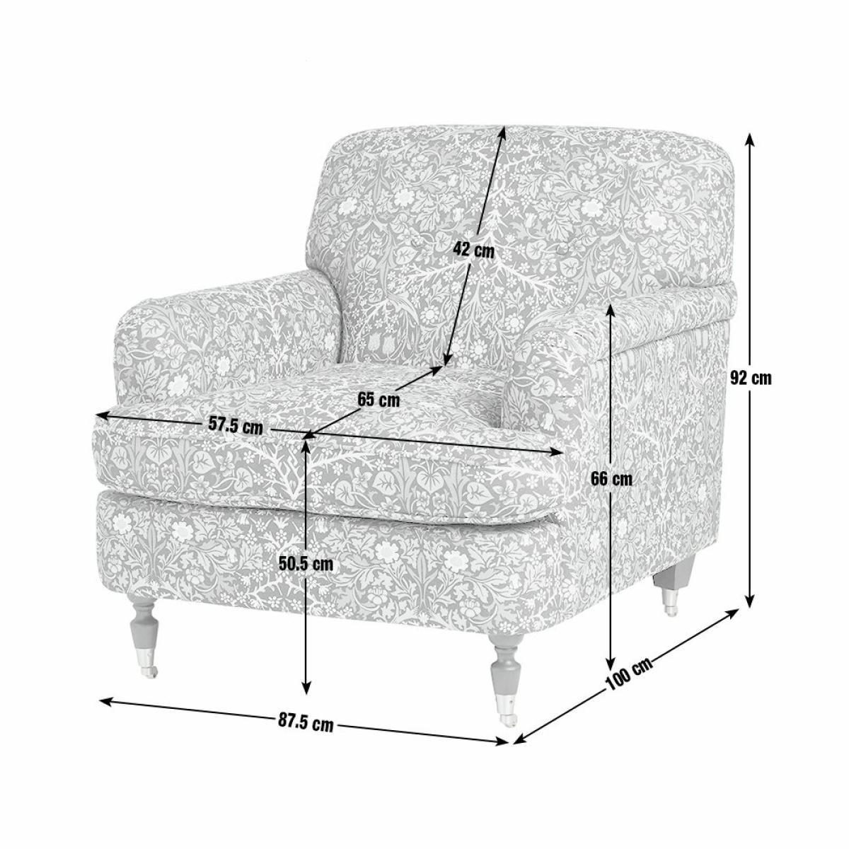 From Habitat x Morris & Co. Comes this Merton armchair. A fusion of English country design and the romantic, nature-inspired patterns of William Morris. Upholstered in the distinctive Blackthorn print, it's an eye-catching piece. With a frame made from solid oak, a comfortably cushioned, pocket sprung seat, supportive padded back and low and convenient arms. It's made for lounging and relaxing. Habitat x Morris & Co. A celebration of British design heritage with a fresh take on the iconic prints of William Morris. Part of the Habitat x Morris & Co. Collection. Material: Made from 100% polyester. Castor feet. Removable seat with pocket sprung and foam filling. Fixed cushion(s) with foam filling. Dimensions: Size H92, W87.5, D100cm. Floor to seat height: 50.5cm. Depth of seat: 65cm. Height of seat back: 42cm. Width of seating area between arms: 57.5cm. Height of arm rest: 66cm. Weight: 37.8kg. Packaged dimensions: Package size H81, W90.5, D103cm. General information: Wipe clean or lightly vacuum. Minimal assembly - just add feet. Maximum individual user weight 110kg. Manufacturer's 10 year guarantee.