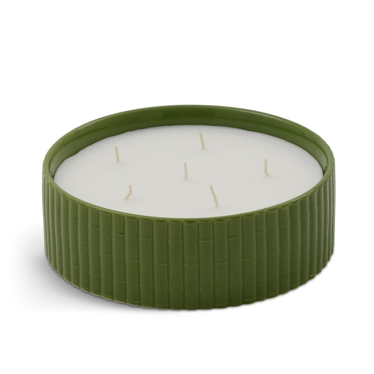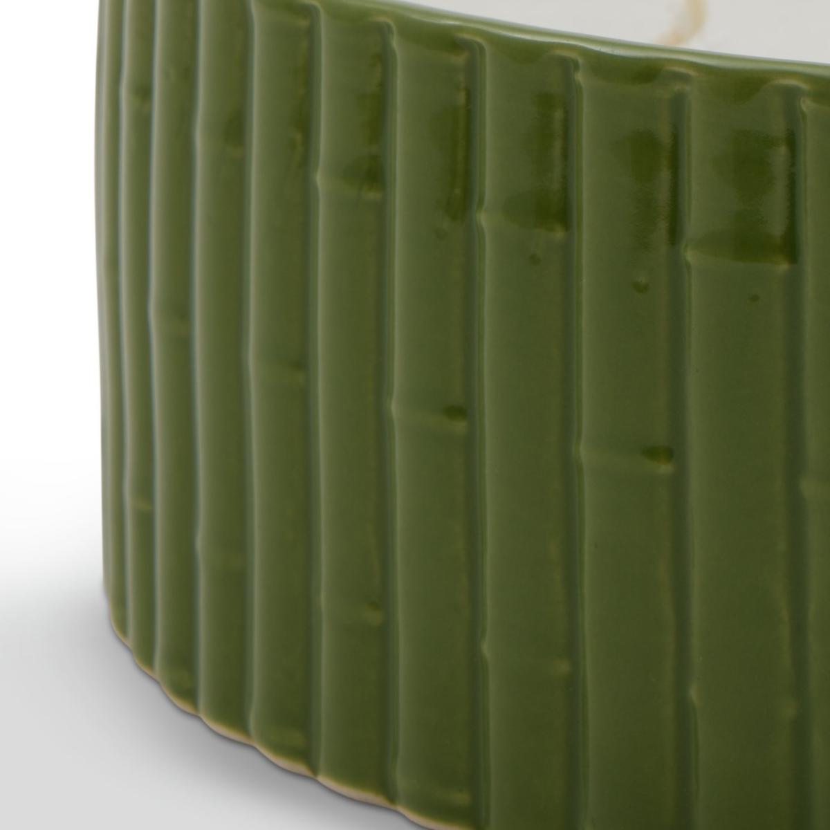 This extra-large, scented candle makes an impressive, artisanal centre piece. Inspired by the cane furniture at William Morris' Wightwick Manor, the ceramic holder has a textured bamboo design. Bathed in rich green pooling glaze, it's a tribute to the arts and crafts movement. Light and enjoy the exotic fragrant blend of bamboo, leather and patchouli, cade wood and incense. Habitat x Morris & Co. A celebration of British design heritage with a fresh take on the iconic prints of William Morris. Part of the Habitat x Morris & Co. Collection. Leather & Patchouli scent. Paraffin wax. Approximate burn time 38 hours. Size H7, W20, D7cm. Diameter 20cm.