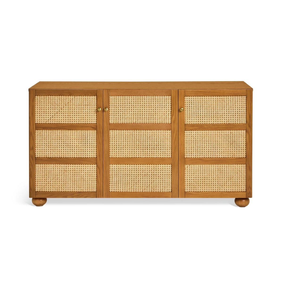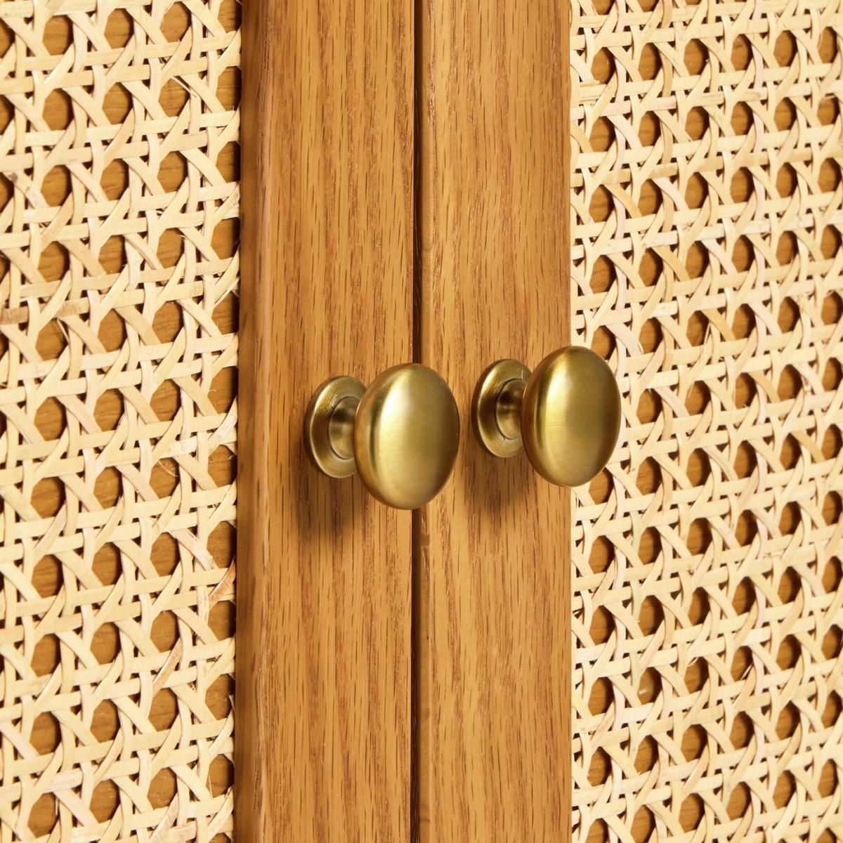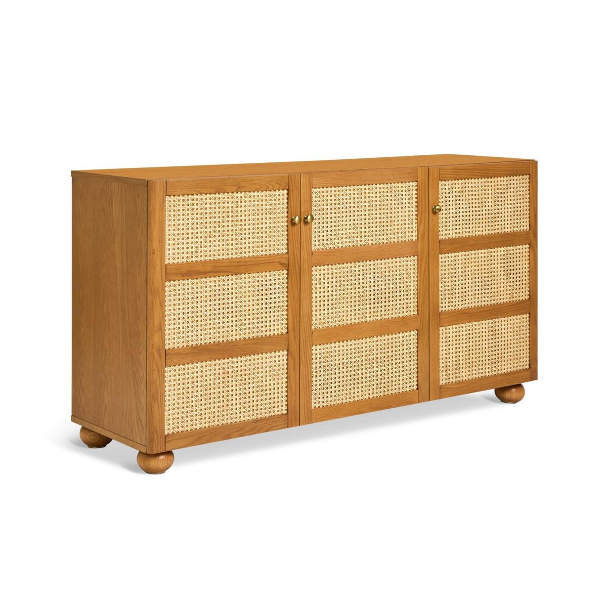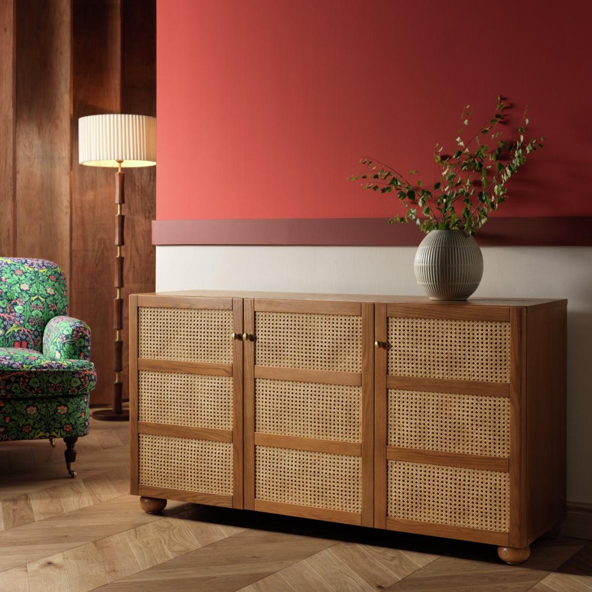 This dramatic sideboard was inspired by the cane furniture at William Morris' Wightwick Manor. The natural beauty of the dark stained oak veneer perfectly frames the lightness of the cane panels. Behind the 2 doors, 6 shelves provide ample storage space. Habitat x Morris & Co. A celebration of British design heritage with a fresh take on the iconic prints of William Morris. Part of the Habitat x Morris & Co. Collection. Made from oak and MDF with a walnut stain finish. Size H 80.3, W 150, D45cm. Gold coloured handles. 3 doors. 3 fixed shelves. Weight 57kg. Self-assembly - 2 people recommended. Maximum load weight 120kg. If this product is over 60cm high it must be securely attached to the wall to prevent overturning. Package Dimensions: Package 1 dimensions: H16, W105, D58cm. Package 1 weight: 29.8kg. Package 2 dimensions: H14, W158.5, D50cm. Package 2 weight: 33.26kg. By choosing FSC certified products, you are supporting responsible management of the world's forests. Manufacturer's 1 year guarantee.