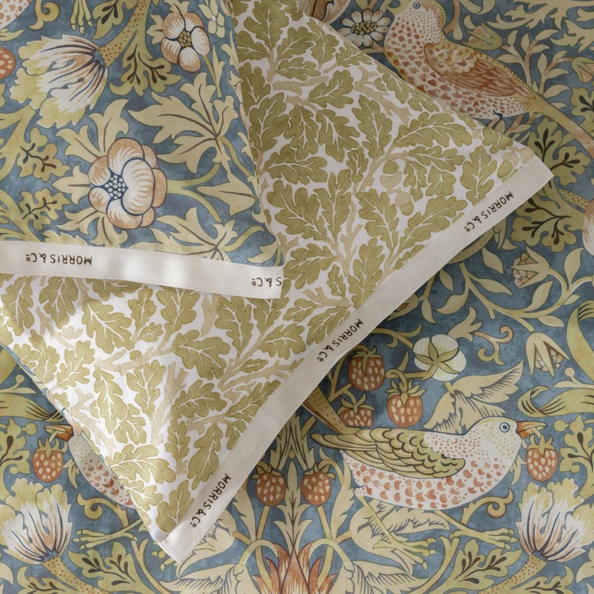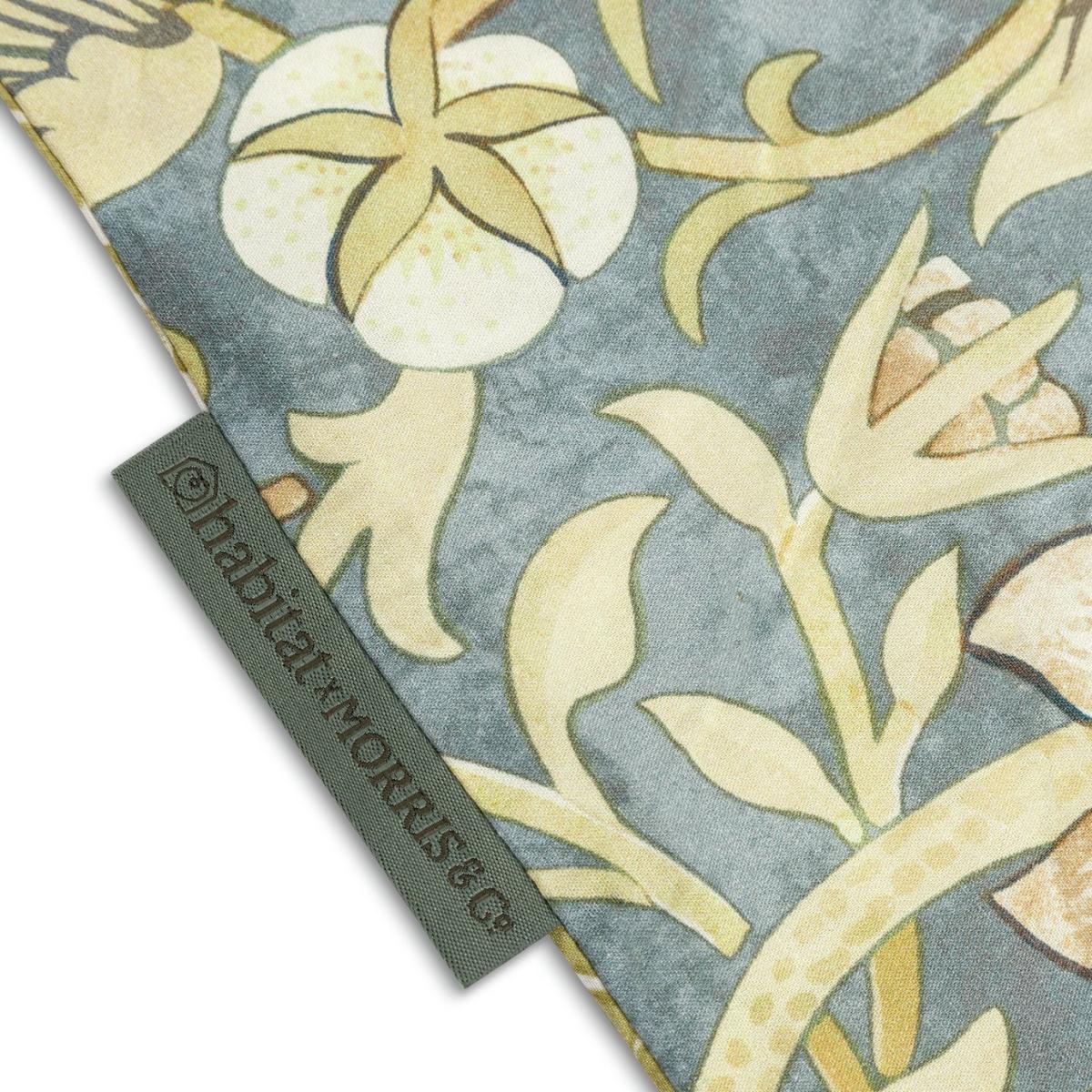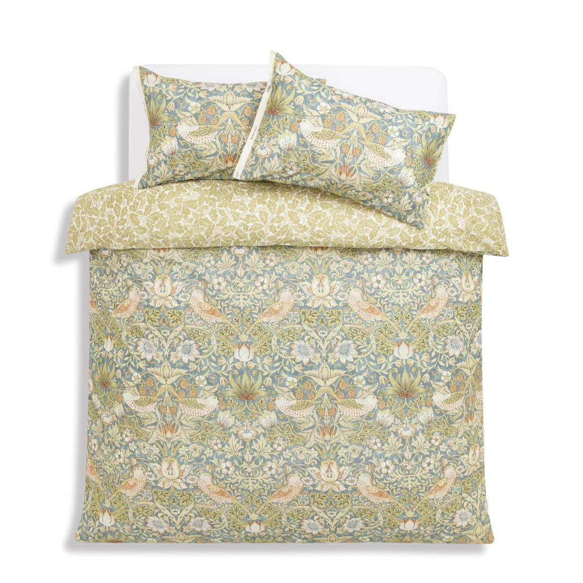 Nestle down at night. This Strawberry Thief bedding set blends naturalistic design with a small-scale pattern of garden birds and fruit backed by a rambling oak leaf print. Made from 100% cotton with a 180-thread count, it has a soft smooth finish to give a comfortable feel, and a soothing neutral underside for a harmonious turnback. While pillowcases carry a selvedge edge detail featuring the recognised logo, Morris & Co. Habitat x Morris & Co. A celebration of British design heritage with a fresh take on the iconic prints of William Morris. Authentically timeless pieces designed for the future. Part of the Habitat x Morris Co. Collection. 100% cotton. 180 thread count. Set includes 1 duvet cover and 2 pillowcases. Bed size: king size. Length 220cm, Width 230cm. Reversible. Buttons for fastening. Standard pillowcase (s). Pillow case length 75cm, Width 50cm. Machine washable. Suitable for tumble drying.