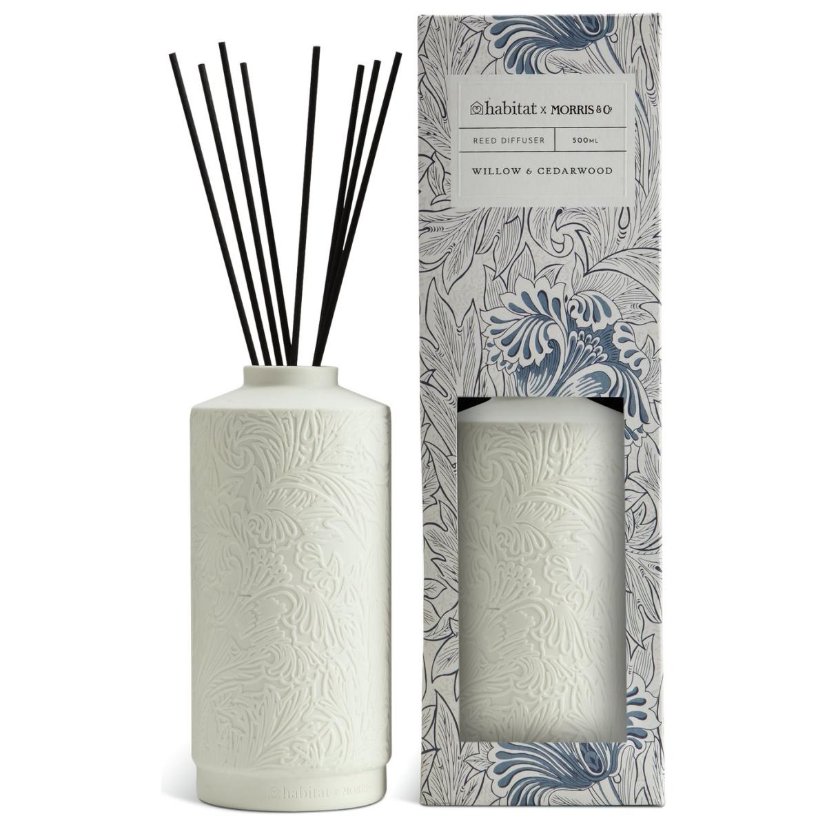 Wonderfully aromatic and beautifully presented from Habitat x Morris & Co. This reed diffuser is designed to perfume a room. First the scent. Warm woody base tones mingle with notes of aromatic spices and gentle florals. Now the look. The fragrance is captured in a tall cream ceramic holder etched with a distinguished William Morris pattern. Habitat x Morris & Co. A celebration of British design heritage with a fresh take on the iconic prints of William Morris. Authentically timeless pieces designed for the future. Part of the Habitat x Morris & Co. Collection. Willow & Cedarwood scent. Scent lasts: 50 weeks. Refills available. Reed Material: Rattan. Includes Diffuser, fragrance, reeds. Gift boxed. 500ml capacity. Size H31, W16, Diameter 9.5cm.