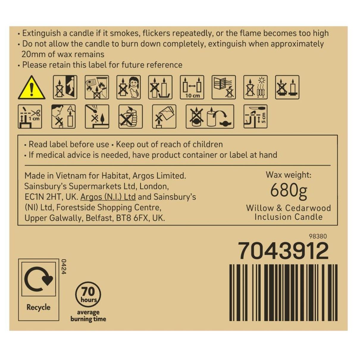 Wonderfully aromatic and beautifully presented from Habitat x Morris & Co. This large pillar candle is designed to perfume a room. First the scent. Warm woody base tones mingle with notes of aromatic spices and gentle florals. Now the look. Organic botanicals are captured in creamy wax. With 70 hrs of burn time this candle makes a long lasting, naturally stunning table decoration. Habitat x Morris & Co. A celebration of British design heritage with a fresh take on the iconic prints of William Morris. Authentically timeless pieces designed for the future. Part of the Habitat x Morris & Co. Collection. Willow & Cedarwood scent. Paraffin wax. Approximate burn time 70 hours. Size H10.2, Diameter 10.2cm.