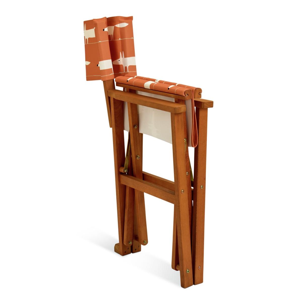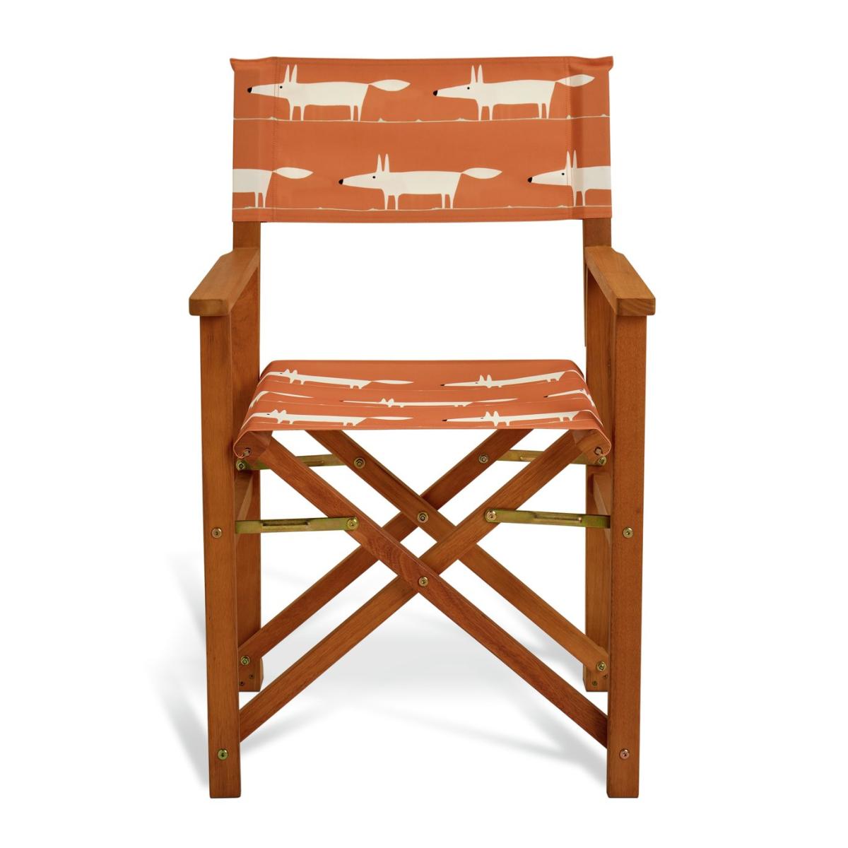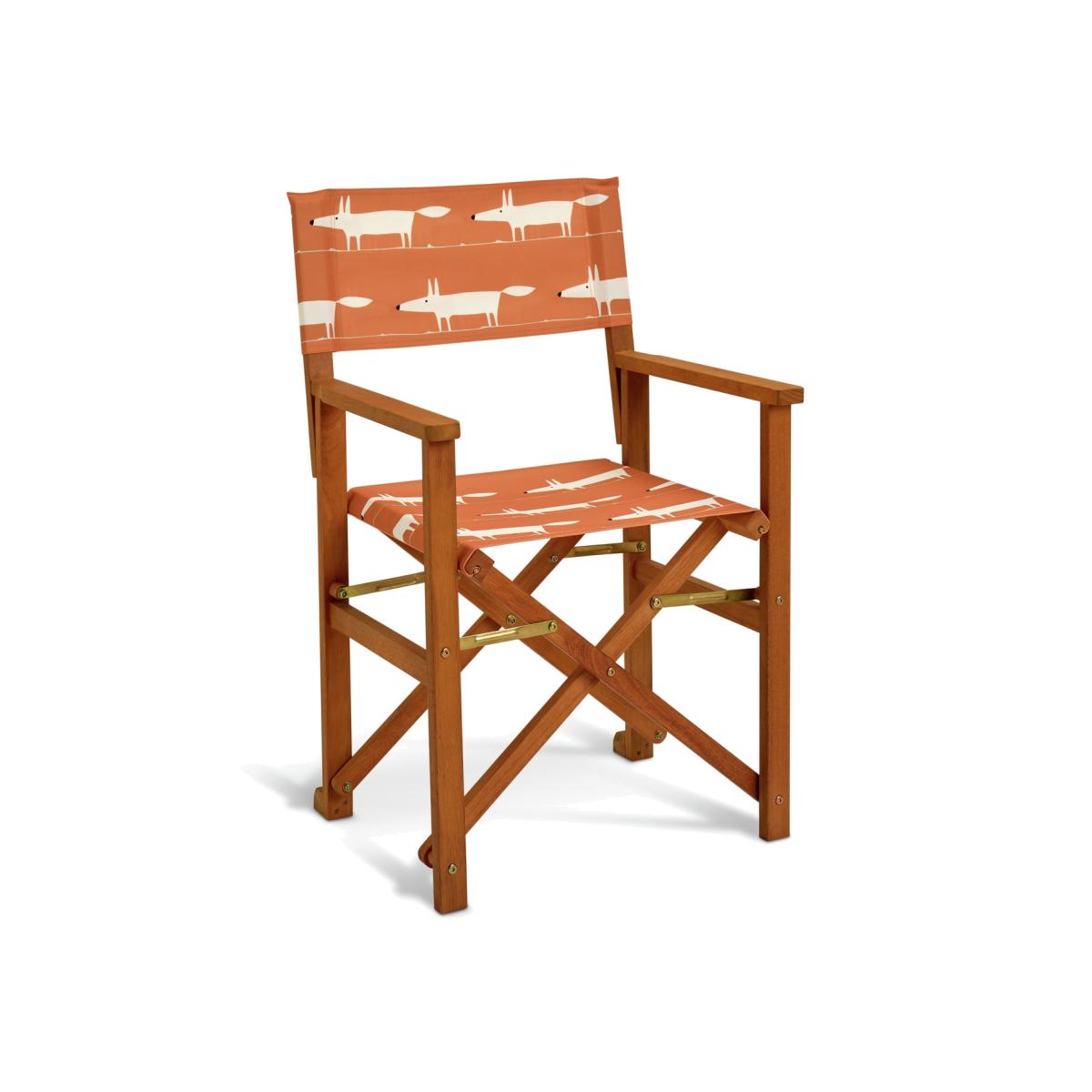Our folding director chair is a timeless design, perfect for outdoor relaxation. Crafted with durable FSC-certified timber and a comfortable canvas sling, it offers both style and function. Its retro Mr Fox in warm orange pattern adds a playful touch, while its foldable frame makes for easy storage. Part of the Scion collection. Eucalyptus frame. Chair seat and back made from polyester. Folds for storage. Dimensions: Size H90, W58.5, D51cm. Weight 5kg. Seat height from ground 46cm. Arm rest height from ground 64cm. Seating area size W50.5, D43.5cm. Maximum user weight 110kg. Folded size H90, W51, D16.5cm. Package Dimensions: Package 1 dimensions: H93, W54, D58.5cm. Package 1 weight:23kg. General information: Fully assembled. Store inside when not in use. Cover or store inside in winter months to prolong life of product. FSC certified meaning the materials used for this product are responsibly sourced. Manufacturer's 1 year guarantee.