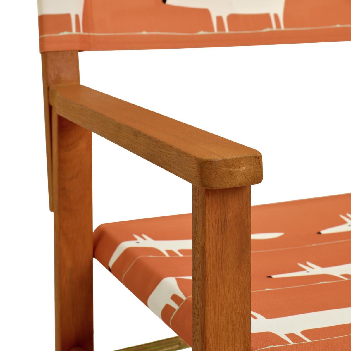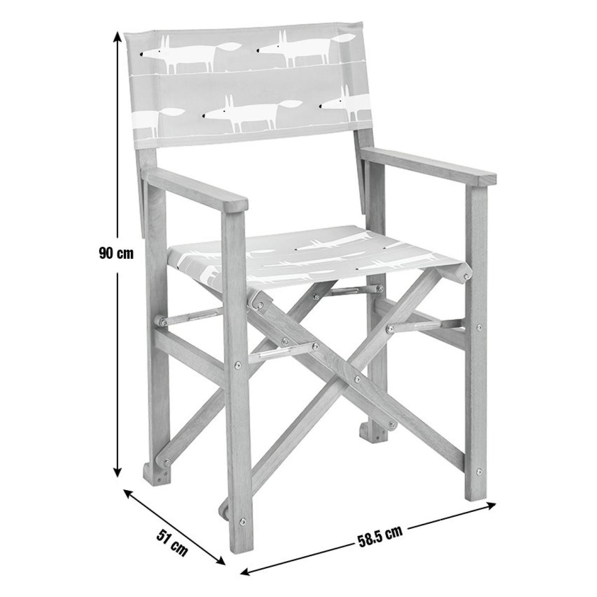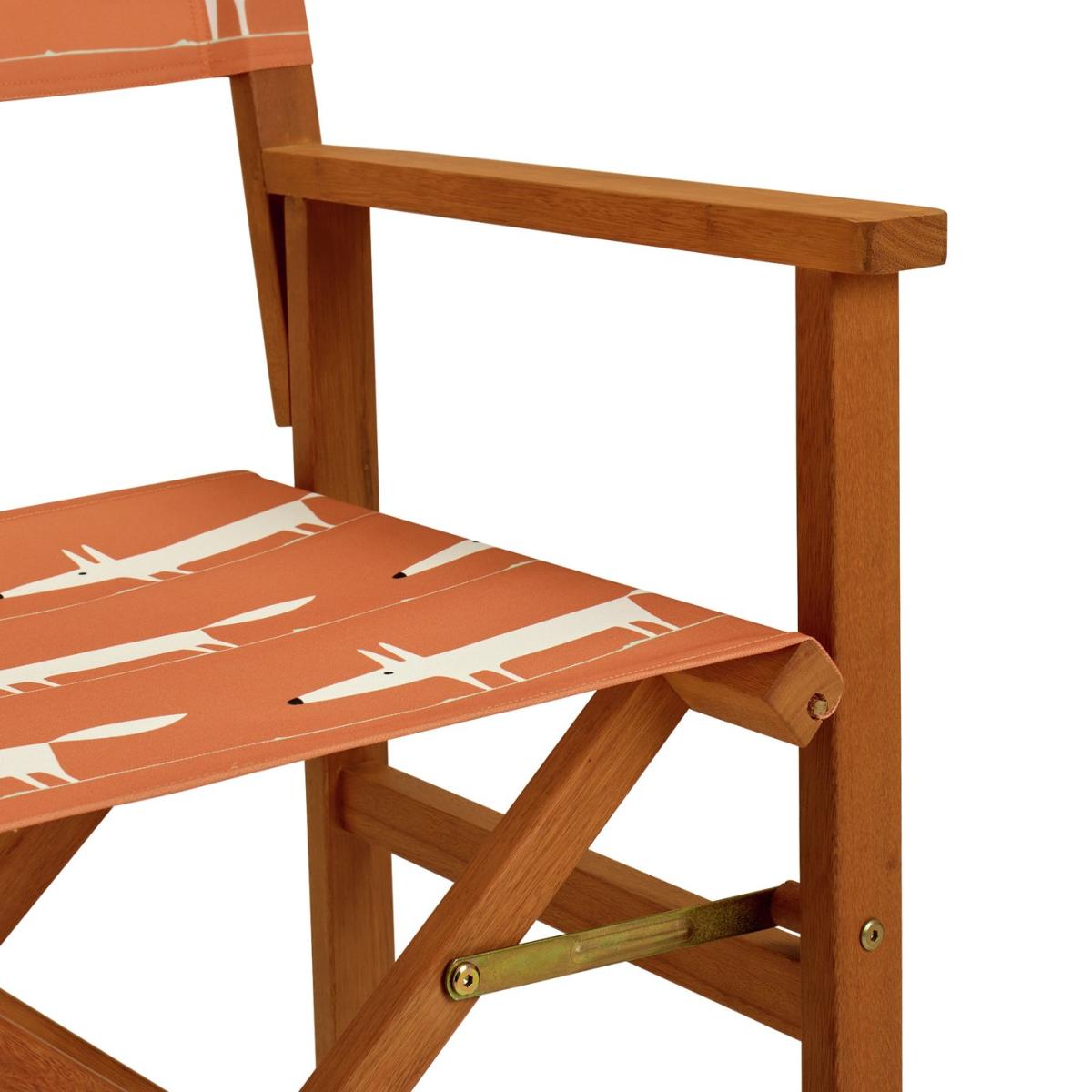 Our folding director chair is a timeless design, perfect for outdoor relaxation. Crafted with durable FSC-certified timber and a comfortable canvas sling, it offers both style and function. Its retro Mr Fox in warm orange pattern adds a playful touch, while its foldable frame makes for easy storage. Part of the Scion collection. Eucalyptus frame. Chair seat and back made from polyester. Folds for storage. Dimensions: Size H90, W58.5, D51cm. Weight 5kg. Seat height from ground 46cm. Arm rest height from ground 64cm. Seating area size W50.5, D43.5cm. Maximum user weight 110kg. Folded size H90, W51, D16.5cm. Package Dimensions: Package 1 dimensions: H93, W54, D58.5cm. Package 1 weight:23kg. General information: Fully assembled. Store inside when not in use. Cover or store inside in winter months to prolong life of product. FSC certified meaning the materials used for this product are responsibly sourced. Manufacturer's 1 year guarantee.