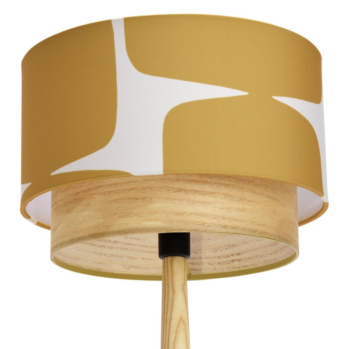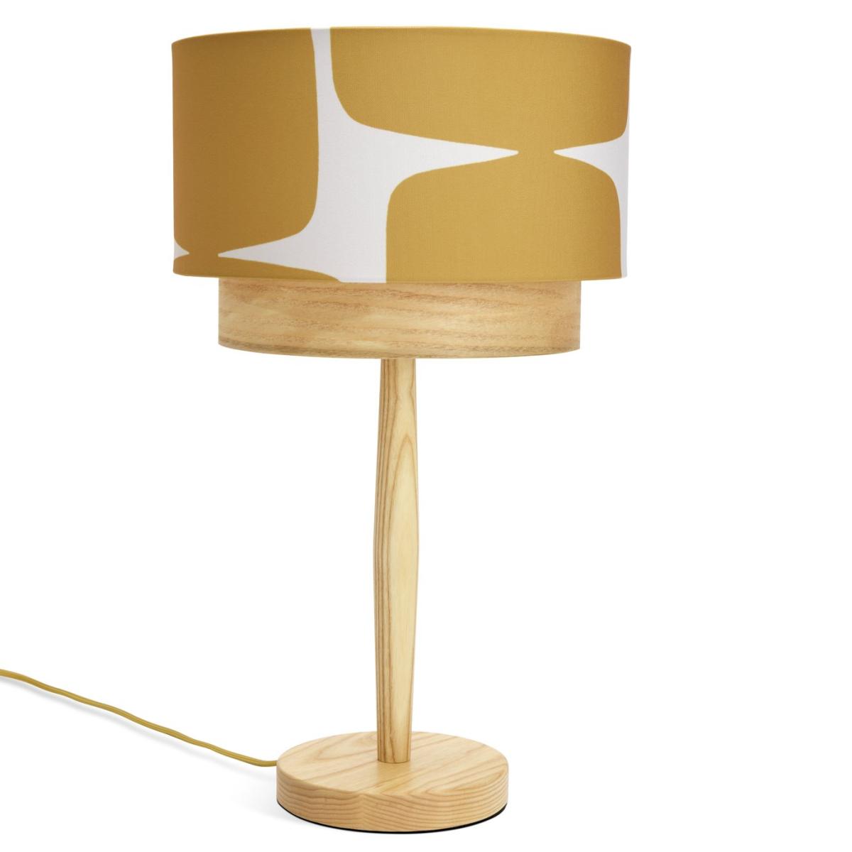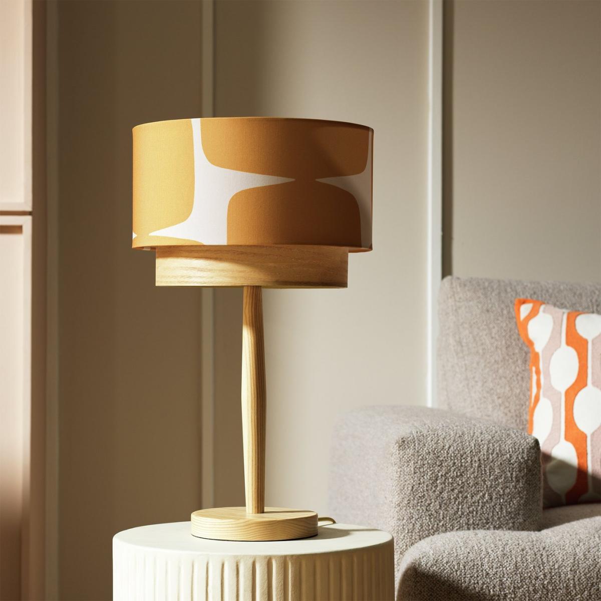 Bring some Scandi style to the room with this stylish table lamp. Showcasing a base carved from solid ash and a dramatic linen-look 2-tier shade. Uniquely designed with the iconic Lohko design. We have joined forces with Scion, a British brand that joyfully mixes bold pattern and confident colour with Scandi influences. Our new exclusive Habitat x Scion collaboration combines our design team's expertise, exploring Scion's iconic portfolio of prints, together bringing a harmonious blend of retro aesthetics and playful energy to our homewares range. Part of the Habitat x Scion collection. Dimensions: Overall size H51, W30, D30 cm. Diameter 30cm. Shade size H30, D20cm. Diameter of base 16cm. Cord length 1.8m. Bulb Information: Bulbs required 1 x candle. E14 small edison screwLE D bulb(s)(not included). General Information: Shade colour: mustard. Base colour: natural. Shade material: polyester. Base material: ash wood. In-line switch. IP rating 20. Minimal assembly. Product is mains powered plug in. This lighting product is a class 2 fitting. Manufacturer's 1 year guarantee. FSC certified meaning the materials used for this product are responsibly sourced.