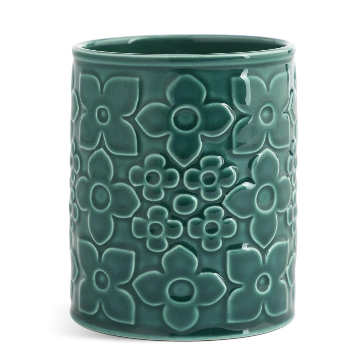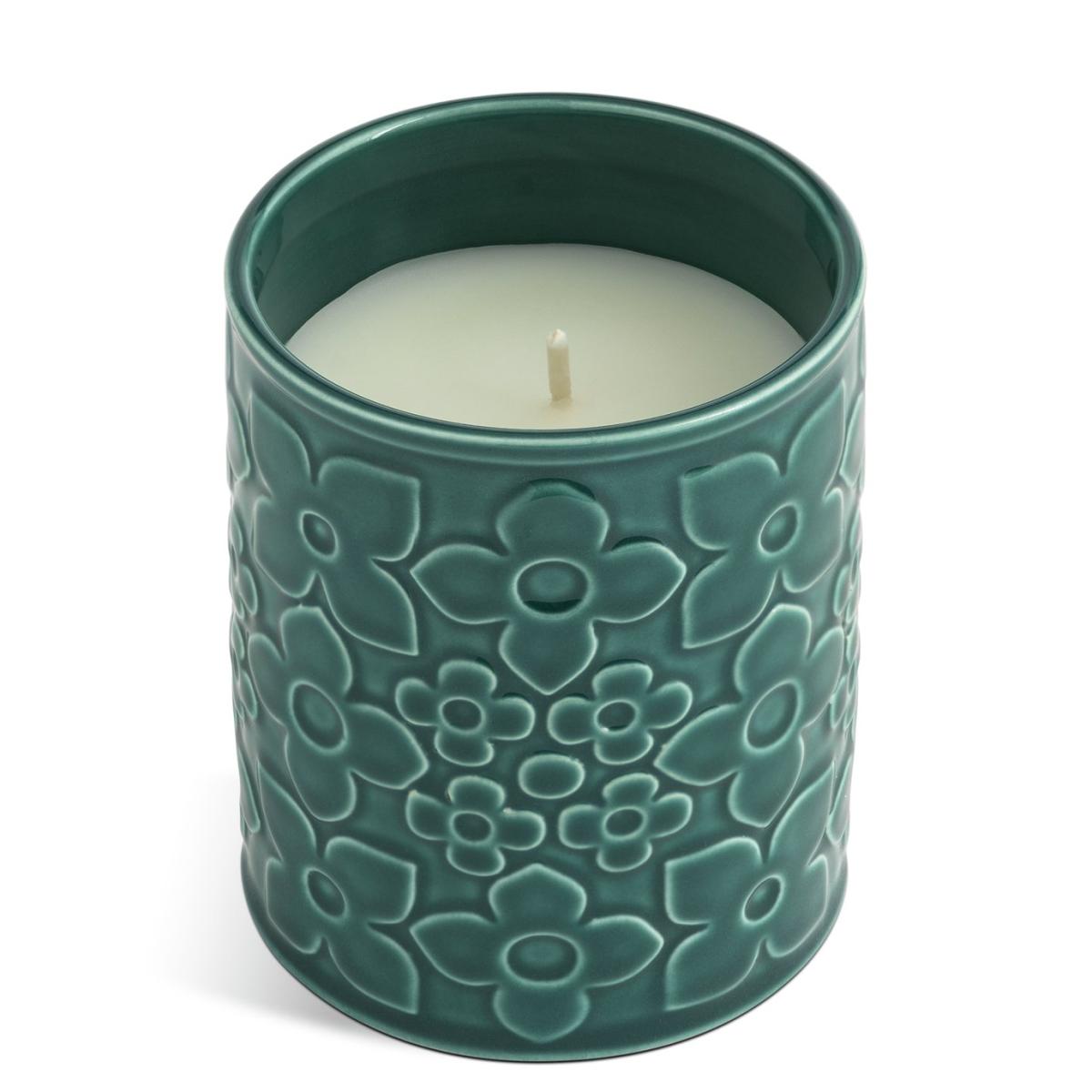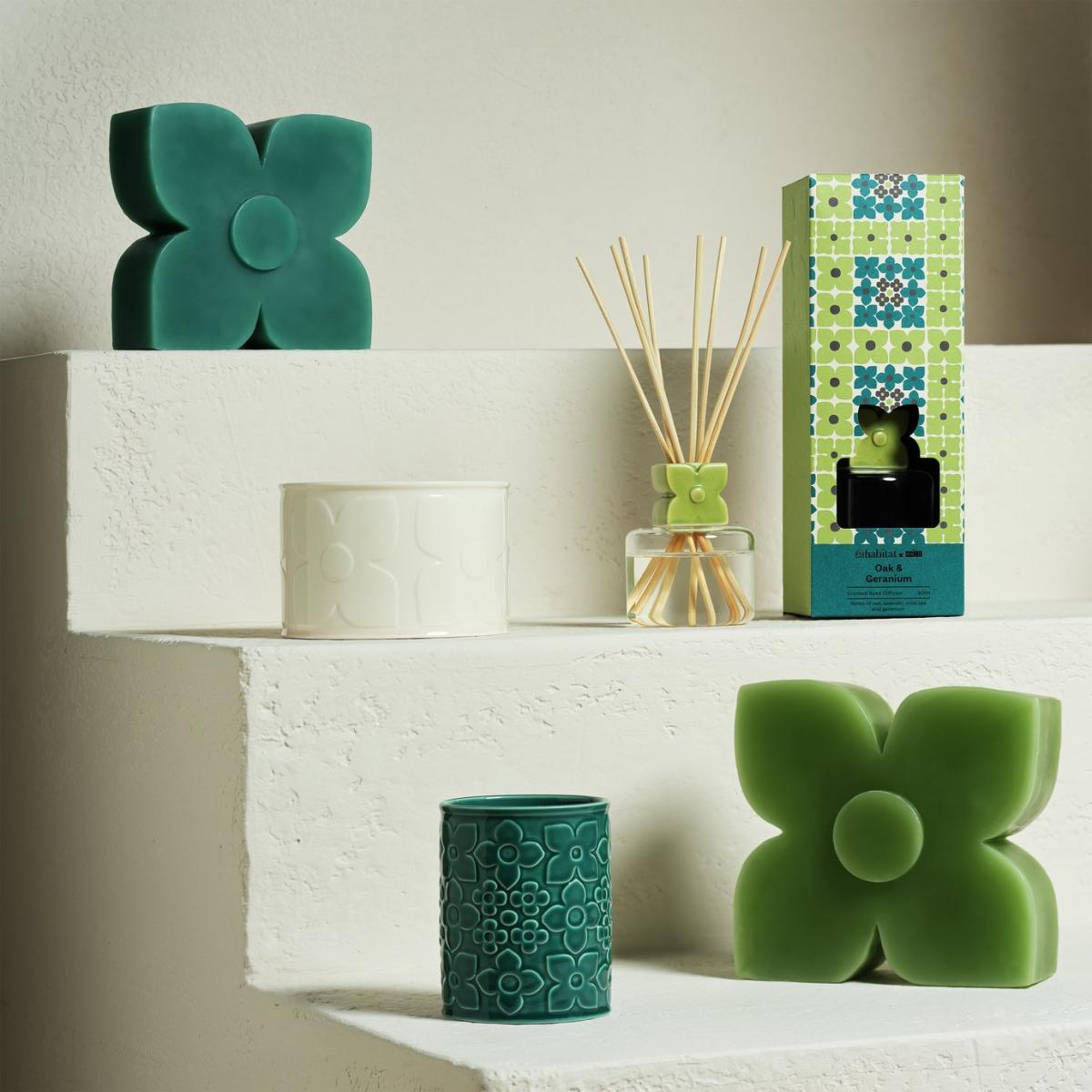 Bring home the scent of Oak and Geranium with this designer candle with base notes of calming lavender and green tea. The teal ceramic holder showcases the Scion Prairie pattern. A fashionable fragrant way to bring an atmospheric perfumed ambience to a room. We have joined forces with Scion, a British brand that joyfully mixes bold pattern and confident colour with Scandi influences. Our new exclusive Habitat x Scion collaboration combines our design team's expertise, exploring Scion's iconic portfolio of prints, together bringing a harmonious blend of retro aesthetics and playful energy to our homewares range. Part of the Habitat x Scion collection. Oak & Geranium scent. Paraffin wax. Approximate burn time 27 hours. Size H9, Diameter 7cm.