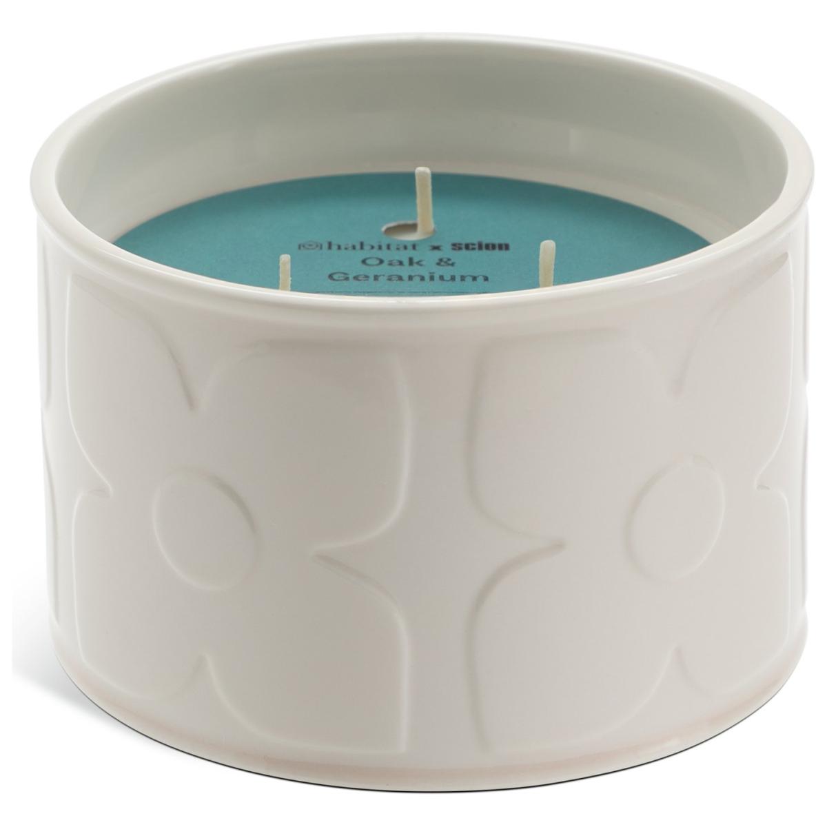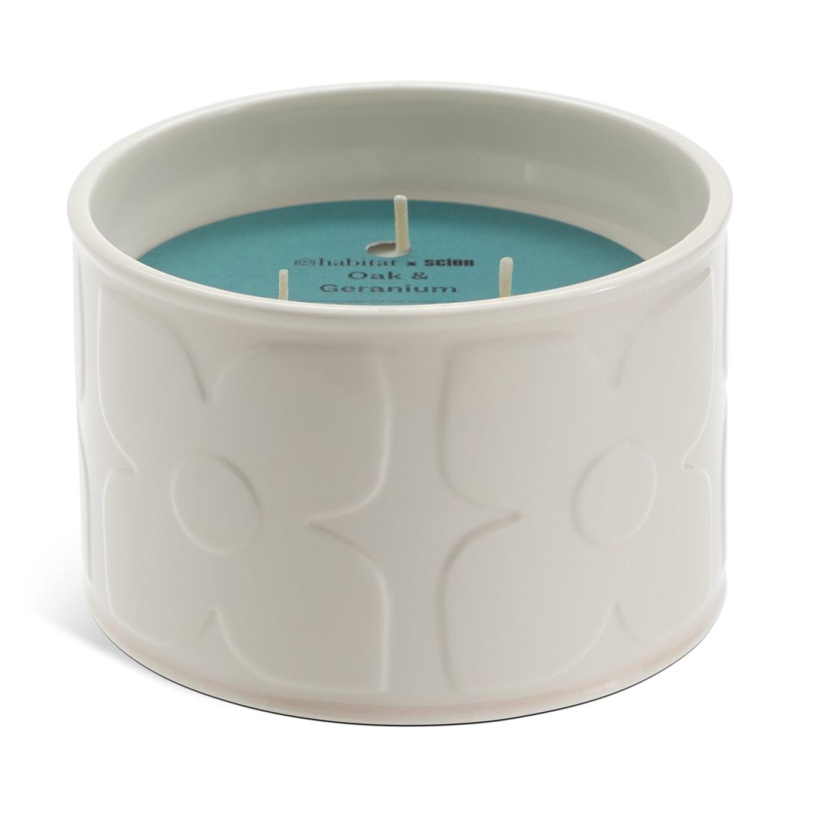 Bring home the scent of Oak and Geranium with this designer multi-wick candle with base notes of calming lavender and green tea. The ceramic holder showcases the Scion Prairie pattern. A fashionable fragrant way to bring an atmospheric perfumed ambience to a room. We have joined forces with Scion, a British brand that joyfully mixes bold pattern and confident colour with Scandi influences. Our new exclusive Habitat x Scion collaboration combines our design team's expertise, exploring Scion's iconic portfolio of prints, together bringing a harmonious blend of retro aesthetics and playful energy to our homewares range. Part of the Habitat x Scion collection. Oak & Geranium scent. Paraffin wax. Approximate burn time 25 hours. Size H7.5, Diameter 11cm.