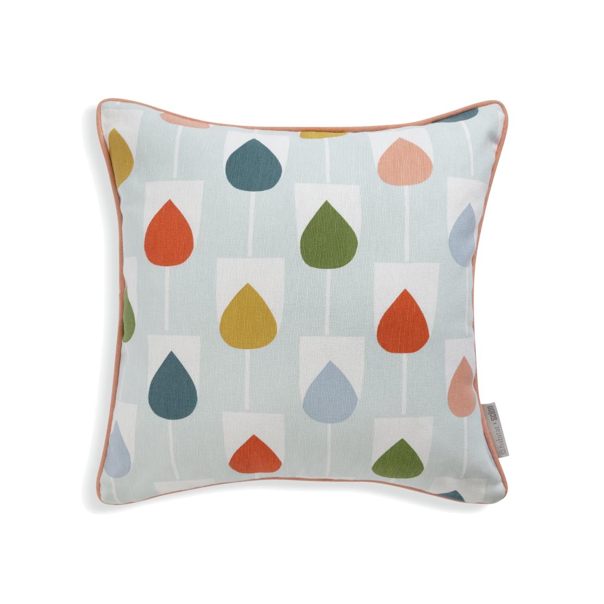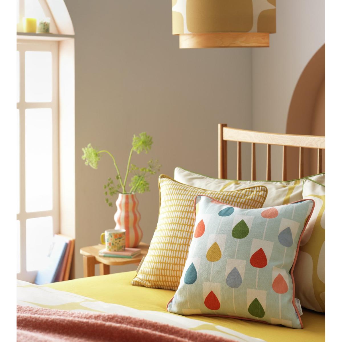 Settle down into this cosy cushion featuring graphic tulip icons in a retro colour palette. Experience the soft side of this strong design. Made from pure cotton, the ribbed and piped cushion is waiting to add a pop of prime personality to a sofa or chair. Zip fastening. Cover 100% Cotton. Filling 100% Recycled Polyester. Size L43, W43cm. This cover is machine washable. Part of the Scion collection.