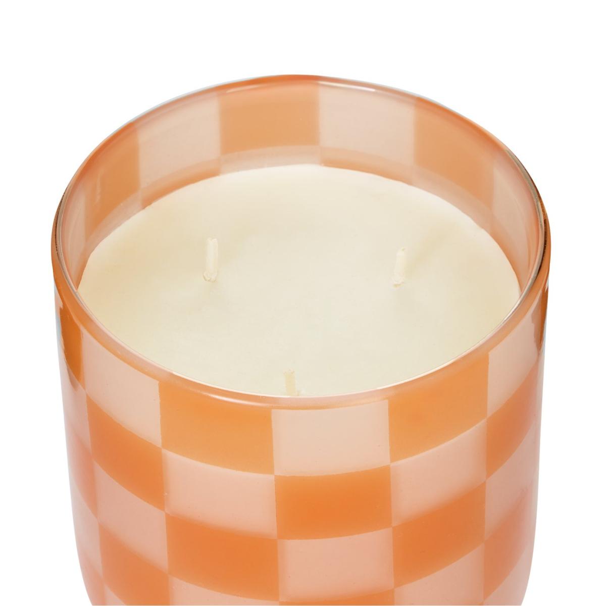 Light this extra-large candle and bask in the warm sensuous scents of amber and sandalwood. Poured into a hand-blown glass jar with a pretty peach and checkered pattern. It's a looker, lit or not. Amber & Sandalwood scent. Palm wax. Approximate burn time 50 hours. Size H15, Diameter 12.5cm.