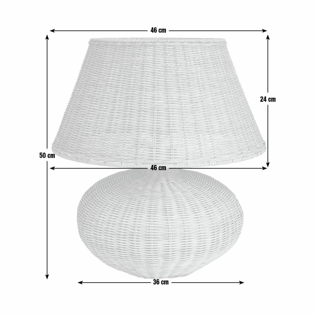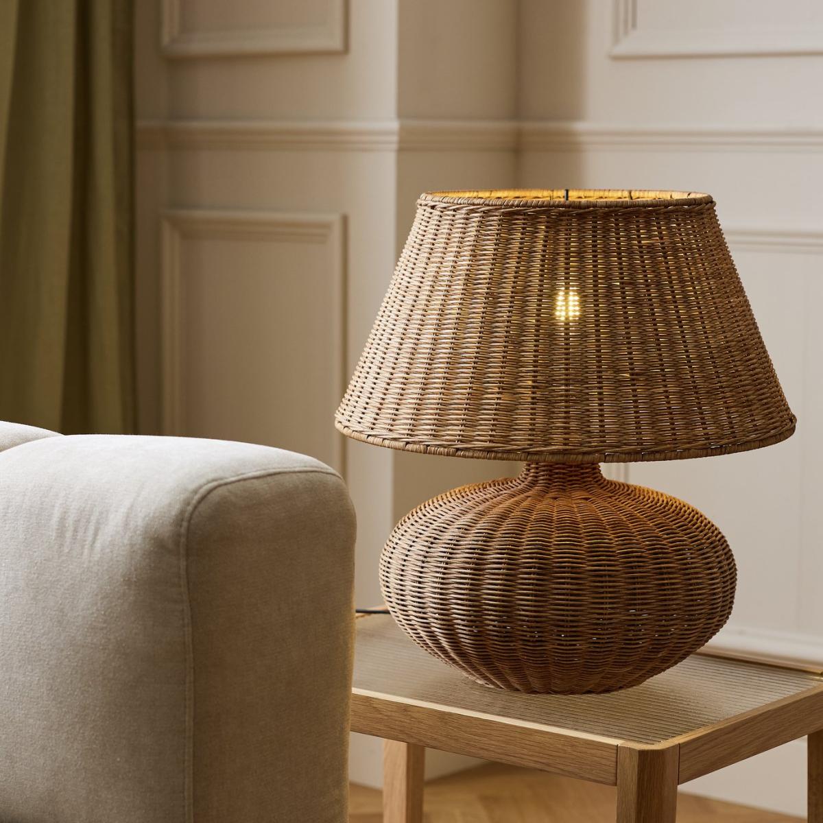 Wild about wicker. This XL table lamp is extra good looking with a large helping of boho chic. Dressed from head to toe in rattan, it's got an artisanal air about it. Hit the in-line switch and let its curvaceous silhouette and ambient glow light up the room. Dimensions: Overall size H50, W46, D46 cm. Diameter 46cm. Shade size H24, D46cm. Diameter of base 36cm. Cord length 1.8m. Bulb Information: Bulbs required 1 x classic E27 edison screw LED bulb(s)(not included). Recommended maximum wattage: 15 watts. LED bulb only. General Information: Shade colour: natural. Base colour: natural. Shade material: rattan. Base material: rattan. In-line switch. IP rating 20. Minimal assembly. Product is mains powered plug in. This lighting product is a class 2 fitting. Manufacturer's 1 year guarantee.