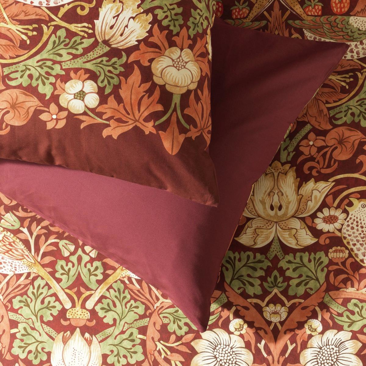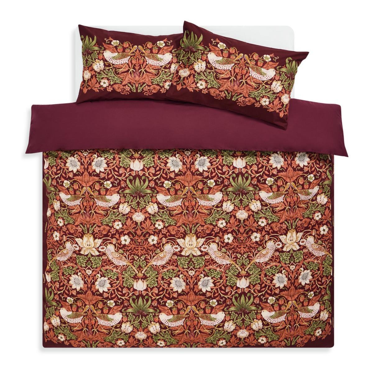 Bring warmth and vibrancy to a modern and maximalist bedroom. The Habitat x Morris & Co. Strawberry Thief design has been given a new, deep red colour palette. This bedding set is made from 100% cotton with a 180-thread count, it has a soft smooth finish to give a comfortable feel. Detailed with the embroidered Morris & Co. Logo and a plain reverse. Habitat x Morris & Co. A celebration of British design heritage with a fresh take on the iconic prints of William Morris. Part of the Habitat x Morris & Co. Collection. Fabric finish: printed. 100% cotton. 180 thread count. Set includes 1 duvet cover and 2 pillowcases. Bed size: super king. Length 220cm, Width 260cm. Buttons for fastening. Standard pillowcase (s). Pillowcase length 75cm, Width 50cm. Machine washable. Suitable for tumble drying.
