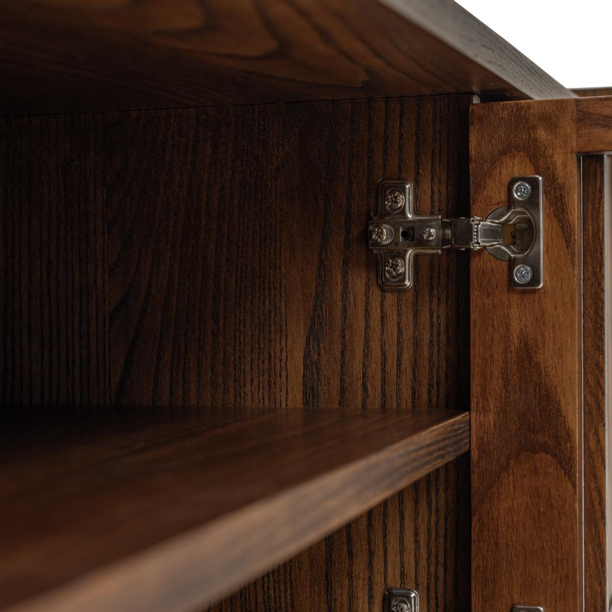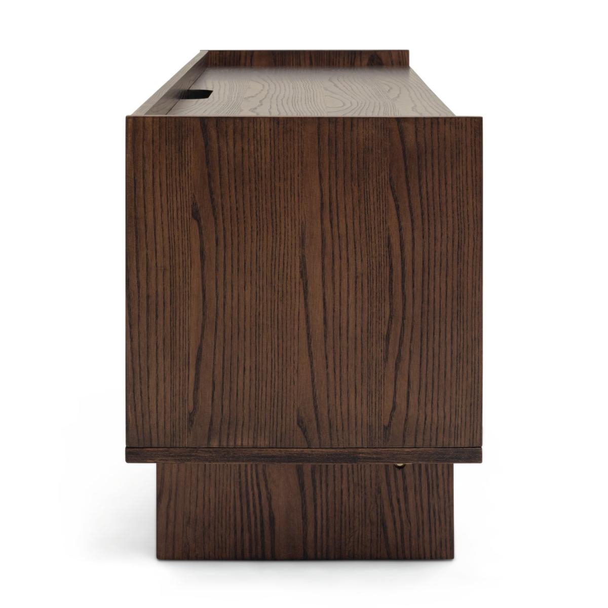 I love this media unit because of its rich, dark wood finish and clean-lined design, which makes it highly versatile for various interiors. It works particularly well in modern, minimal, or Scandinavian spaces where a sleek, understated look is desired, but it can also add warmth and depth to more traditional settings. Practical styling tips include balancing its boldness with lighter or textured accessories - think woven baskets, ceramic vases, or framed art - and using the open shelf for displaying decorative pieces or media essentials. Its generous surface and concealed storage make it an ideal anchor for your seating area, keeping clutter out of sight without compromising on style.
