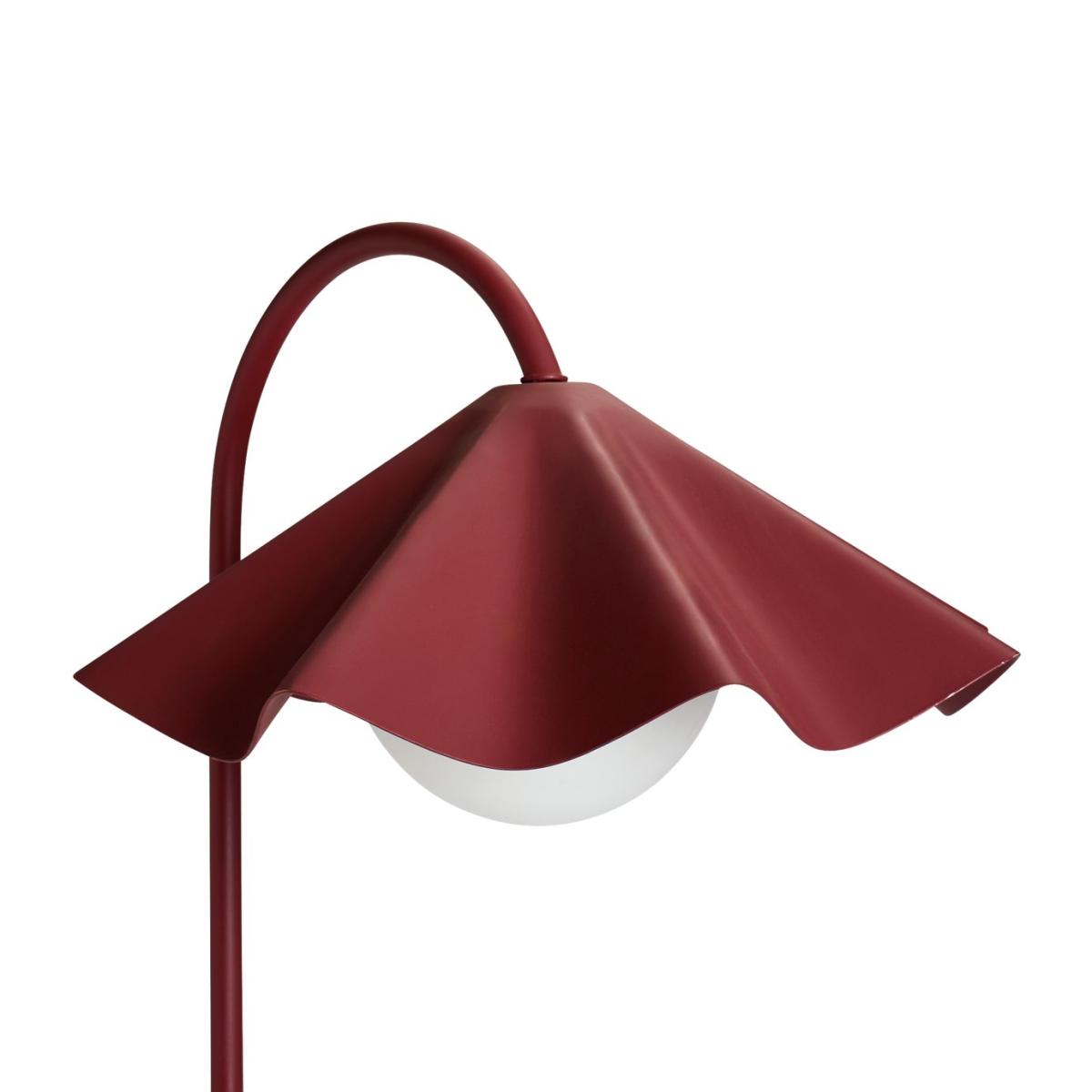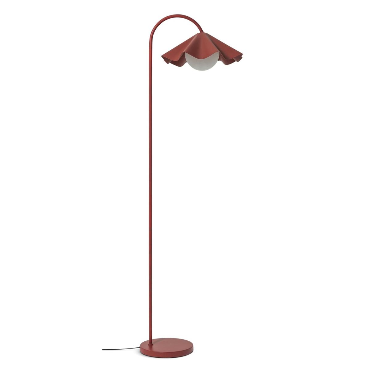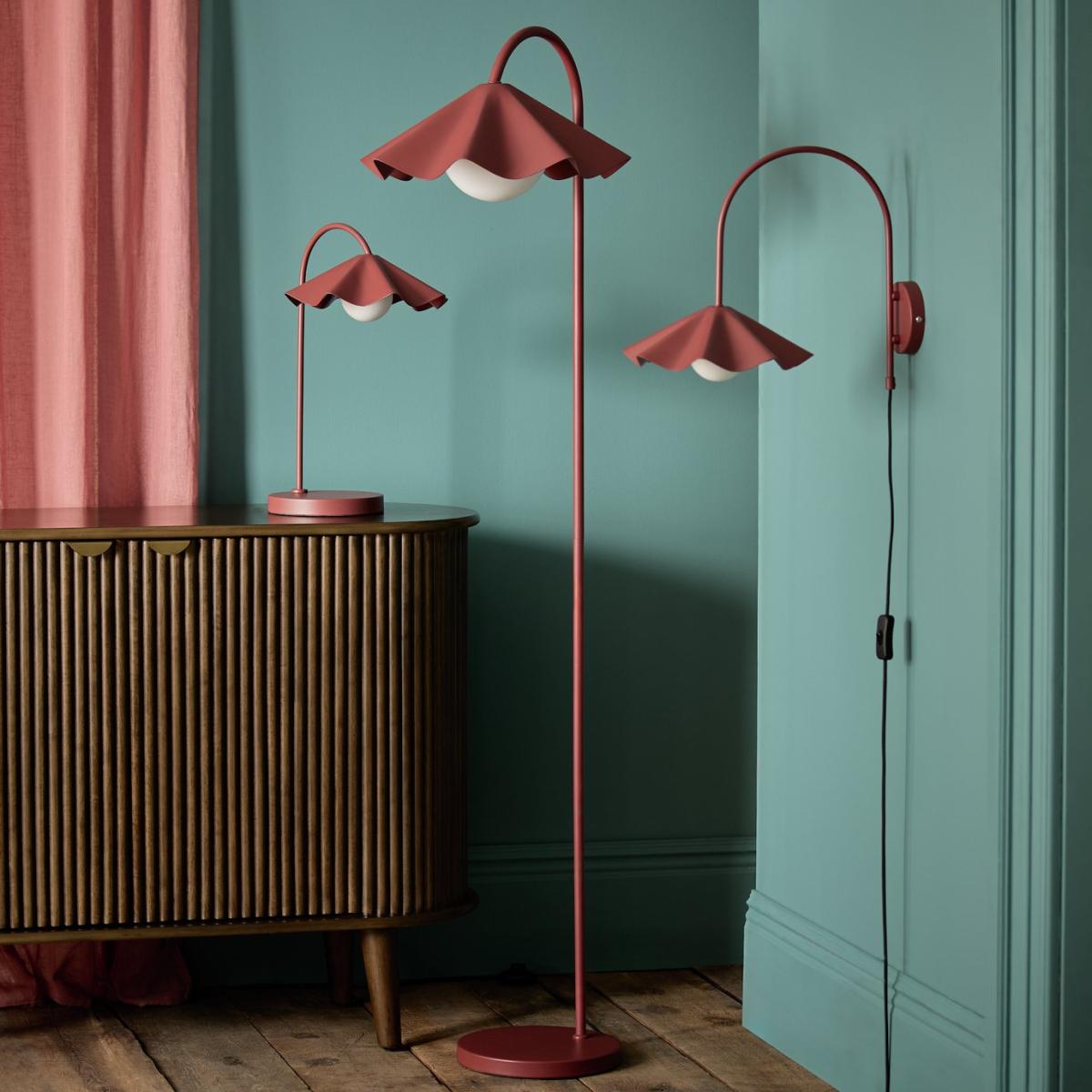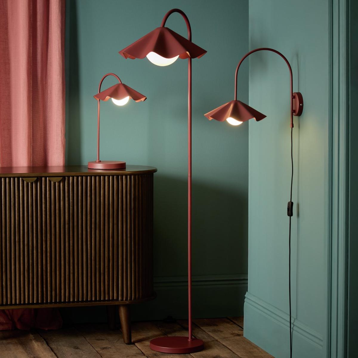 Inspired by the revival of nostalgic 70's decor, the coned silhouette of the Yuno floor lamp, with it's metal scalloped shade and deep red finish, adds texture and drama to your home. An opaque glass orb covers the bulb for a diffused yet directional lighting effect. And the geometric arch of it's slim line neck completes the refined aesthetic. Delicately elegant. Dimensions: Size H156.2, W156.2, D48.5 cm. Diameter 40cm. Diameter of base 25cm. Shade size H15, D 40cm. Cord length 2m. Bulb Information: Bulb required 1 x candleE1. 4 small edison screw (not included). LED bulb only. General Information: Shade material: aluminium. Base material: metal. Foot switch. Not suitable for bathroom use. Minimal assembly. Product is mains powered plug in. This lighting product is a class 2 fitting. Weight 8.6kg. Manufacturer's 1 year guarantee.