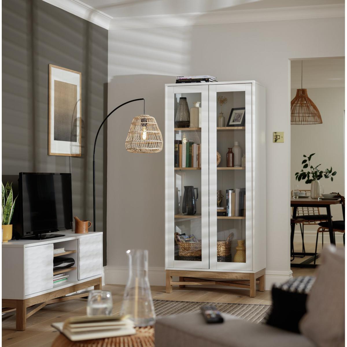 I love this display unit for its clean, contemporary look, combining white with warm oak accents that work well in both modern and Scandi-inspired interiors. It’s versatile enough to stand in living rooms, dining areas, or even bedrooms - perfect for showcasing your favourite dishes, books, or decorative objects. Styling tips include using the glass doors to hide clutter while displaying statement pieces, and balancing taller items with smaller accessories on each shelf. Its neutral tones make it adaptable, allowing you to experiment with colour and textures around it to create a cohesive and inviting space.
