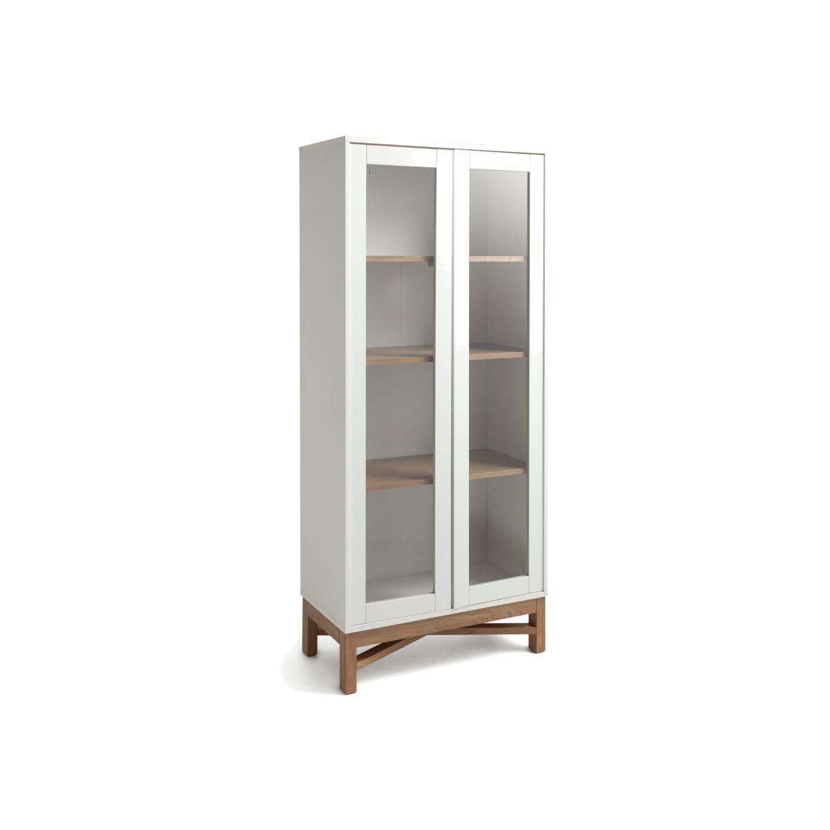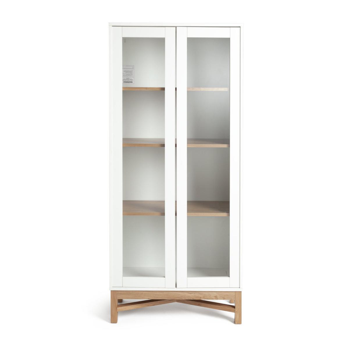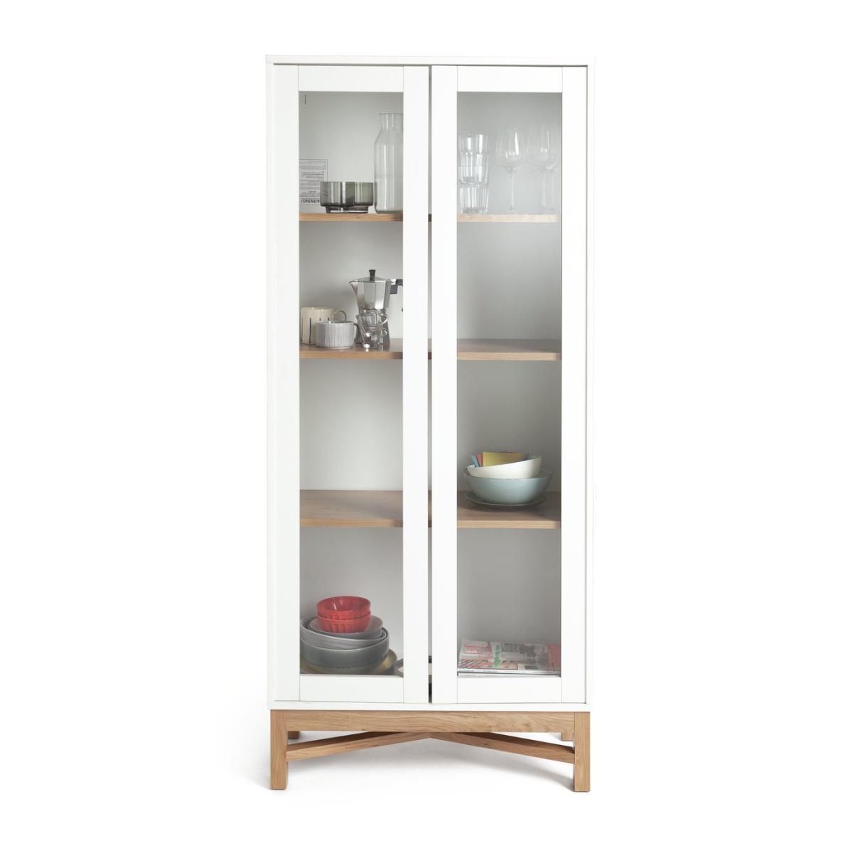 Go for a contemporary look with the Habitat Zander collection. This 2-door glass cabinet, with its white finish and contrasting oak-effect legs, makes a quirky, stand-out piece. It has 1 fixed and 2 adjustable shelves inside, so you can store games and books, to ornaments and glassware. With pristine glass doors, you can show off your favourite collections. It'll keep them dust-free and safe from curious pets or children. Each cupboard features push-to-open doors for a flush, handle-less look. A delightful display.