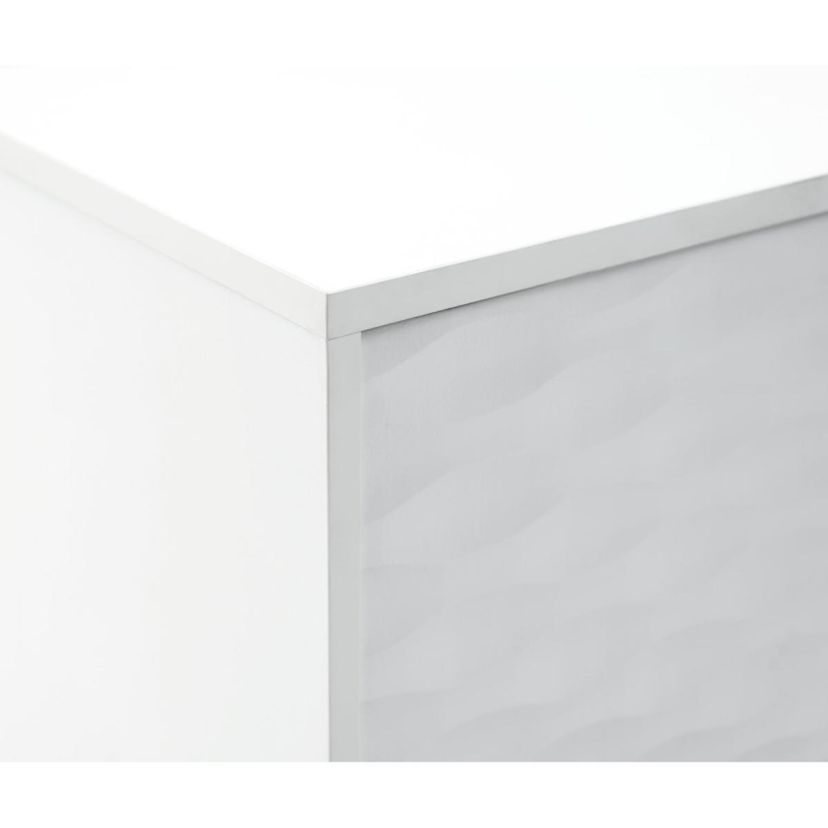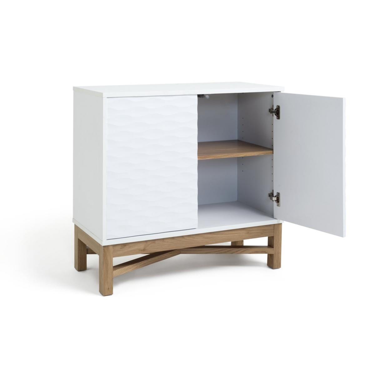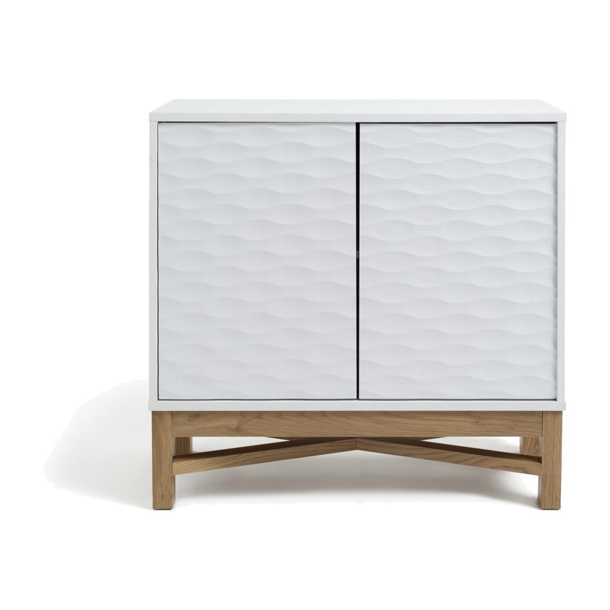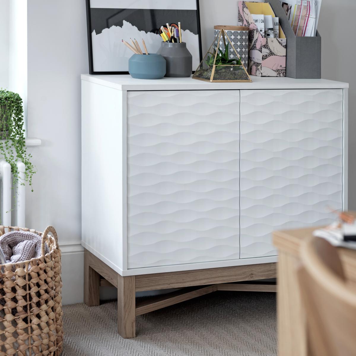 Go for a calming, contemporary look with this textured 2 Door Sideboard from Habitat. With a wave white finish and contrasting oak effect legs, it makes a quirky, stand-out piece. It has an adjustable shelf inside so you can store DVDs and games out of sight great if you want to create a clean and modern decor. Each cupboard features push-to-open doors for a flush, handle-less look. Use it as a TV stand or place a green plant on top to add a fresh flash of colour.