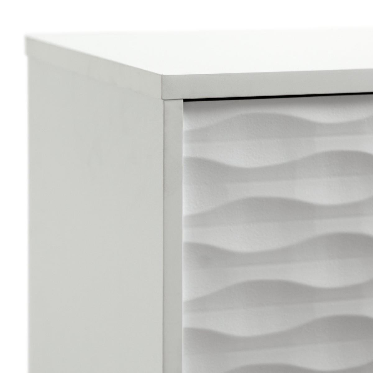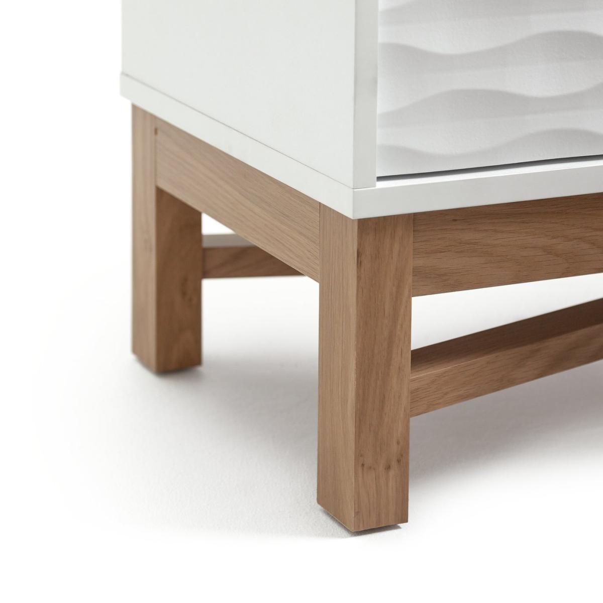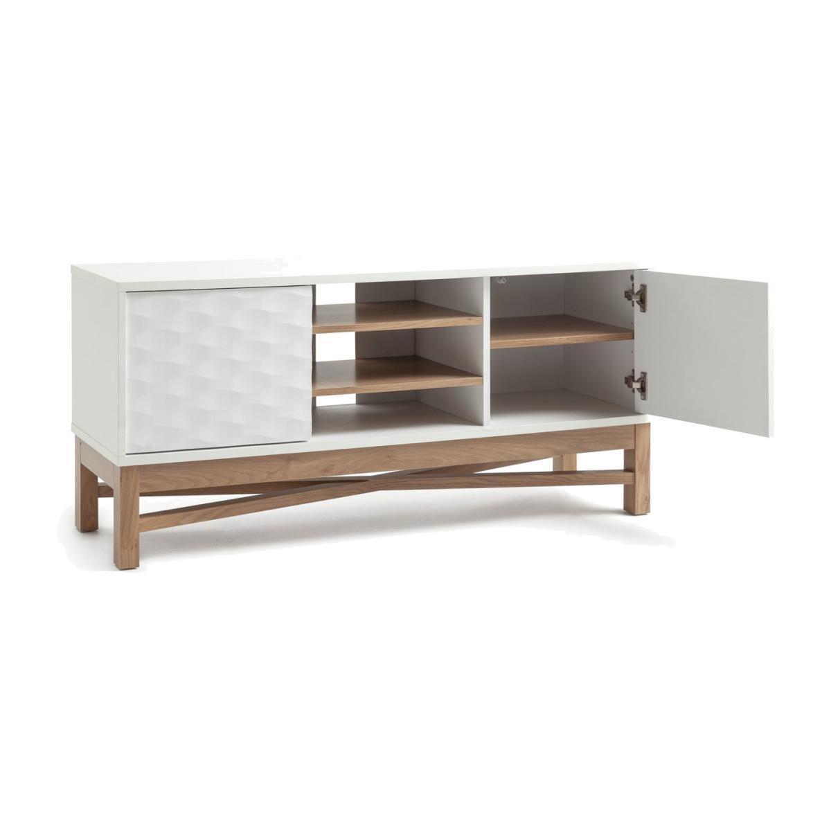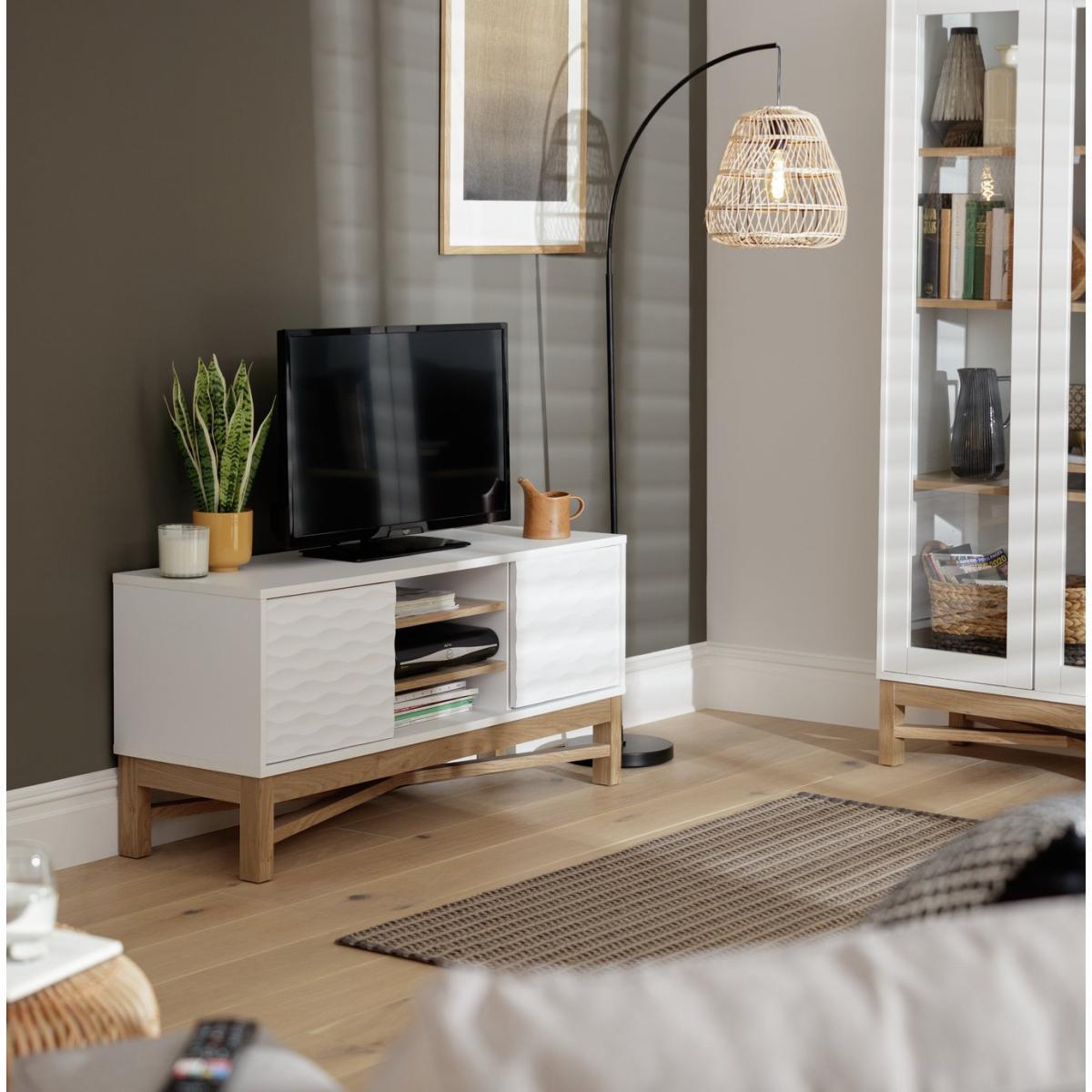 Criss-cross cool. Go for a calming, contemporary look with the Habitat Zander collection. The sleek, striking style offers something a little different. This TV unit, with its white wave finish and contrasting oak-effect legs, makes a quirky, stand-out piece. It has 3 storage areas for your consoles and 2 cupboards, so you can store books and games out of sight - great if you want to create a clean and modern decor. Each cupboard contains an adjustable shelf and features push-to-open doors for a flush, handle-less look. Make it a feature piece or match it with other items in our textured furniture range. Part of the Zander collection. Size H 56, W 120, D 39cm. Weight 34.28kg. 3 shelves. 2 doors. 3 media storage sections. Largest height of media equipment sections 8.7cm. Easy cable access. Suitable for screen sizes up to 50in. Maximum weight of TV 50kg. Self-assembly - 2 people recommended. General information:We are excited to be welcoming some of our favourite HOME products into the Habitat range. Your product may arrive in Habitat or HOME packaging.