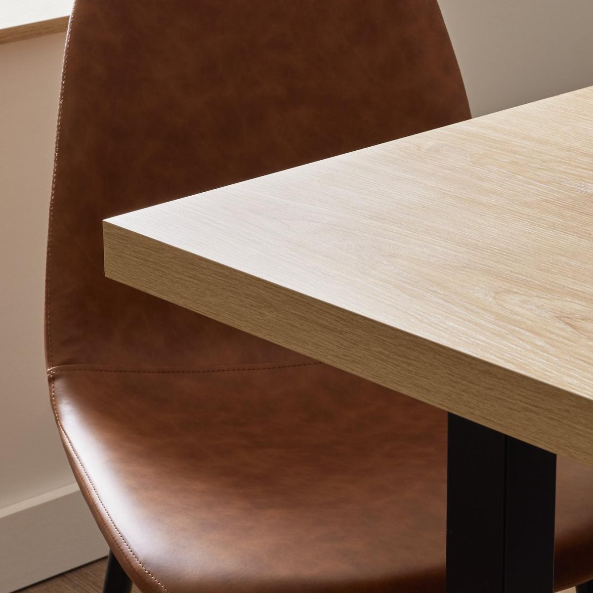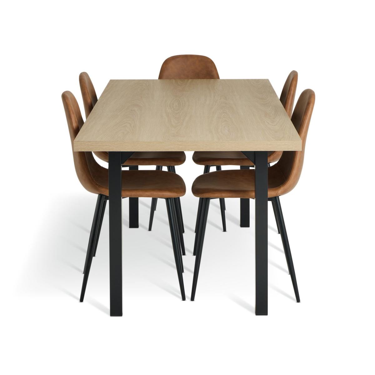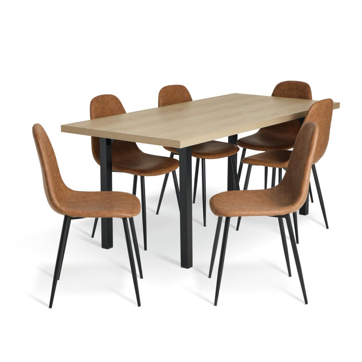 Modern mealtimes coming right up. This dining table is slim, smart and space-saving. A combination of black metal and wood effect offers up an industrial feel. Paired with 6 retro Beni chairs that feature comfy padded seats and a smooth faux leather tan finish. Completed with distinctive tapered legs. A set for the style conscious. Part of the Zayn collection. Table: Table size H75.5, W85, L180cm. Wood effect table with metal legs. Wood effect table top finish. Self-assembly - 2 people recommended. Chair: Includes 6 chairs. Size of each chair H88, W45, D51cm. Seat height 45cm. Metal frame with metal legs. Faux leather seat pad. Self-assembly. Maximum user weight per chair 120kg. Individual chair weight 9.4kg. Package Dimensions: Table package 1 size H11.5, W91, D187.5cm. Individual chair package size H50, W56, D60cm. General information: Manufacturer's 1 year guarantee. Dust or wipe with a damp cloth only. FSC certified meaning the materials used for this product are responsibly sourced.