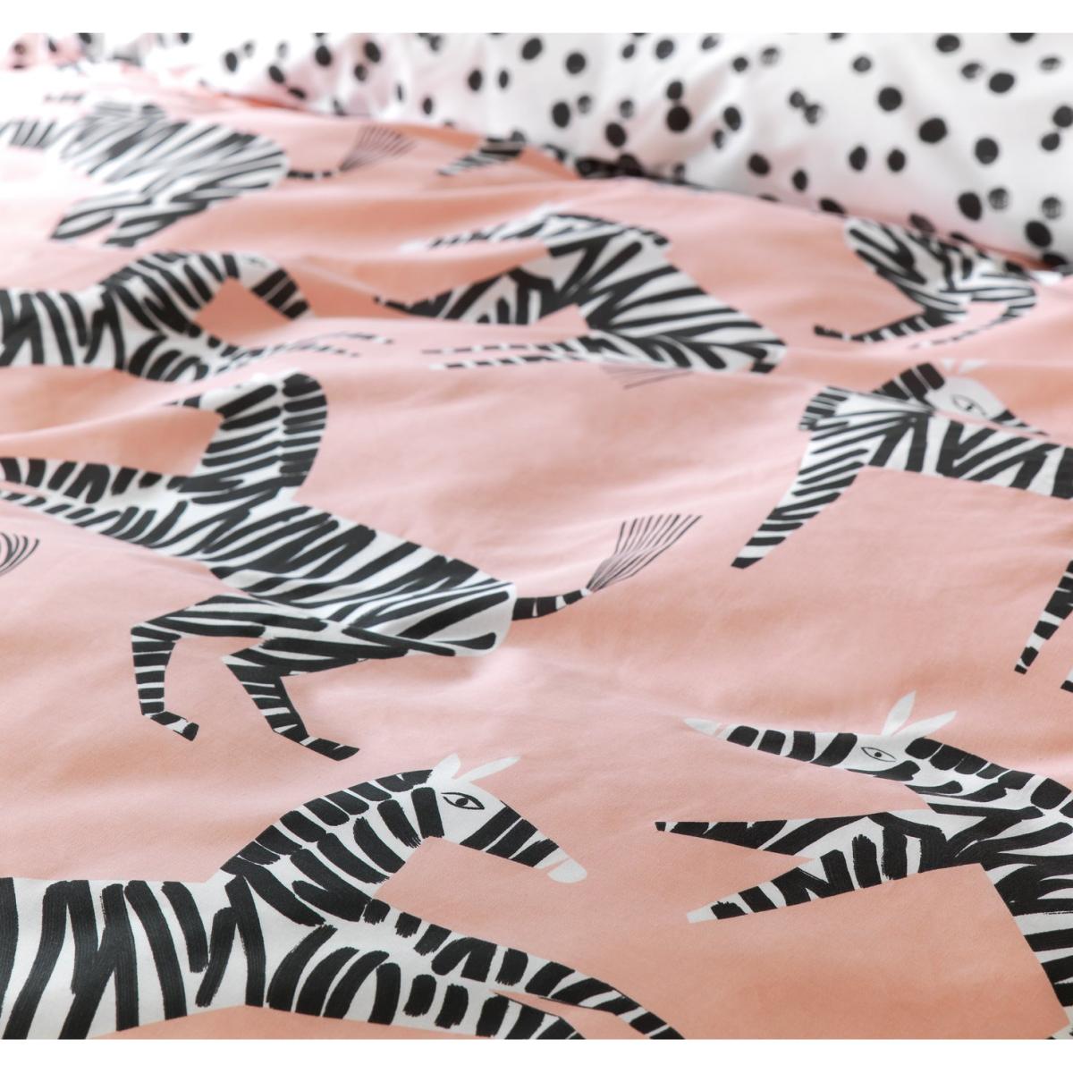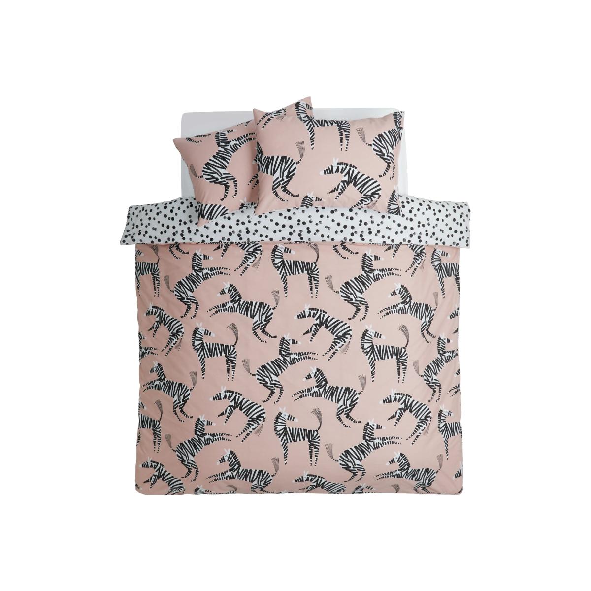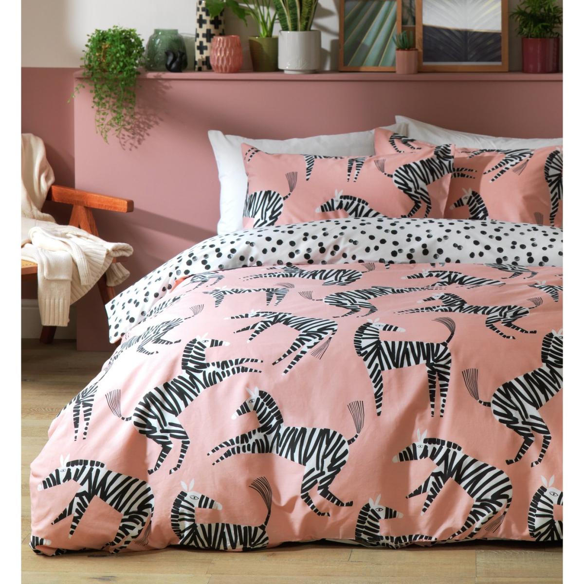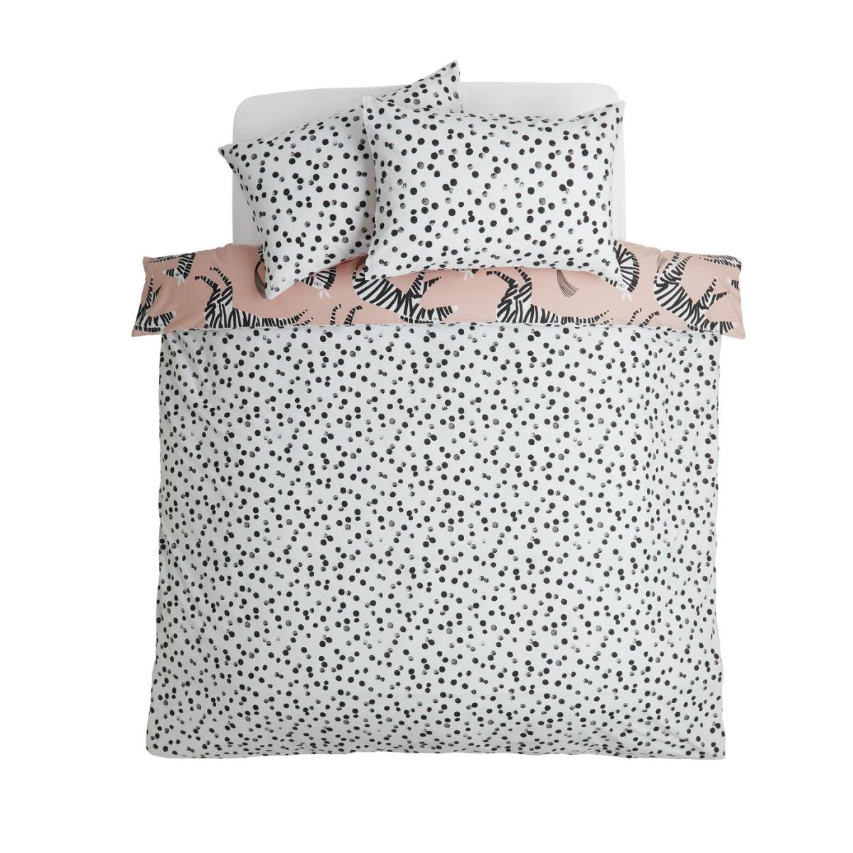 Spots or stripes? This king size duvet set lets you have both. Crafted in a light, bright polycotton blend, it features a perky pink side adorned with zebras and a contrasting spotted monochrome side. Why not mix and match? That's one way to show off your wild side.