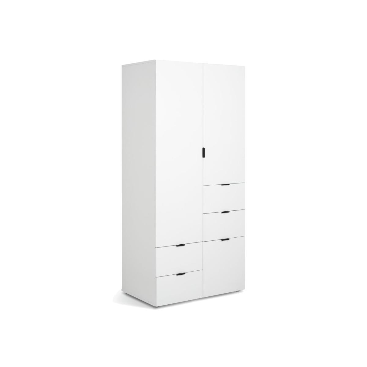 Take a peek at Zeke. With a fresh white minimalist finish, this 2-door wardrobe is a great all rounder for fashionistas. With space for long and short hanging, 4 drawers for foldables and a cupboard for shoes, Zeke really is a great storage solution. Part of the Zeke collection. Made of MDF and particleboard. 2 doors. 4 drawers with metal runners. 2 fixed hanging rails. Hanging rail holds up to 10kg. Self-assembly - 2 people recommended (includes wall fixings). If this product is over 60cm high it must be securely attached to the wall to prevent overturning. Dimensions: Size H195, W90, D56.6cm. Internal drawer H8.5, W39.3, D35cm. Large internal drawer H8.5, W39.3, D35cm. Weight 81kg. Package Dimensions: Package 1 dimensions: H10.6, W155.5, D58.2cm. Package 1 weight: 41kg. Package 2 dimensions: H6.7, W200.1, D58.1cm. Package 2 weight: 40kg. General information: FSC certified meaning the materials used for this product are responsibly sourced.